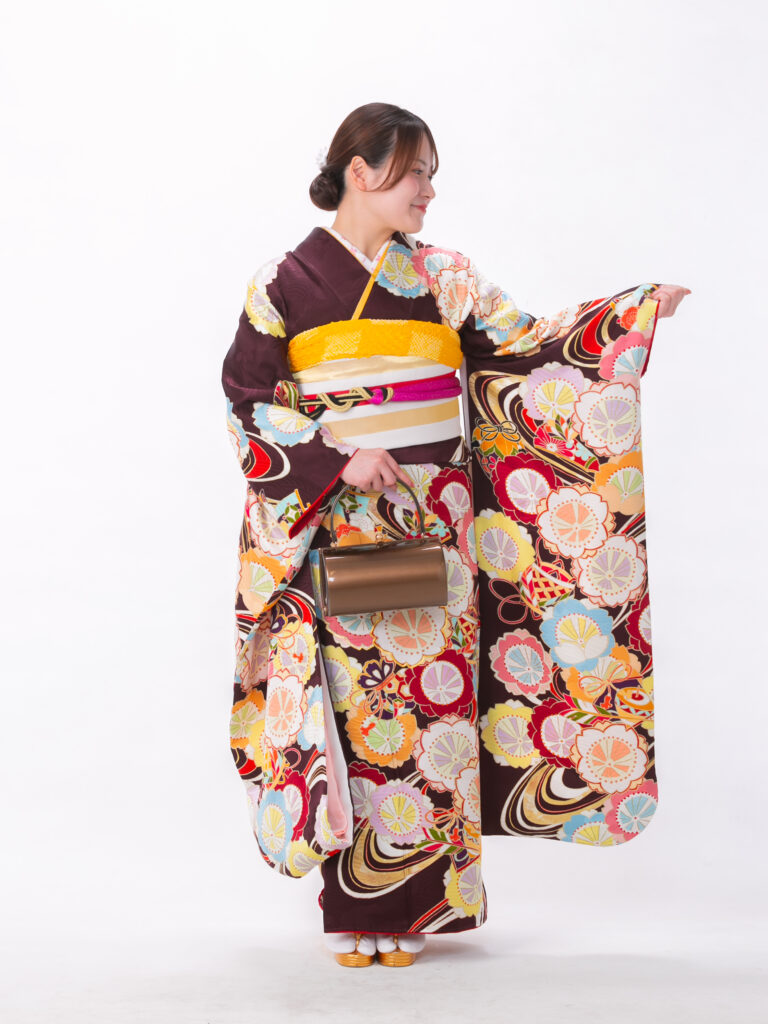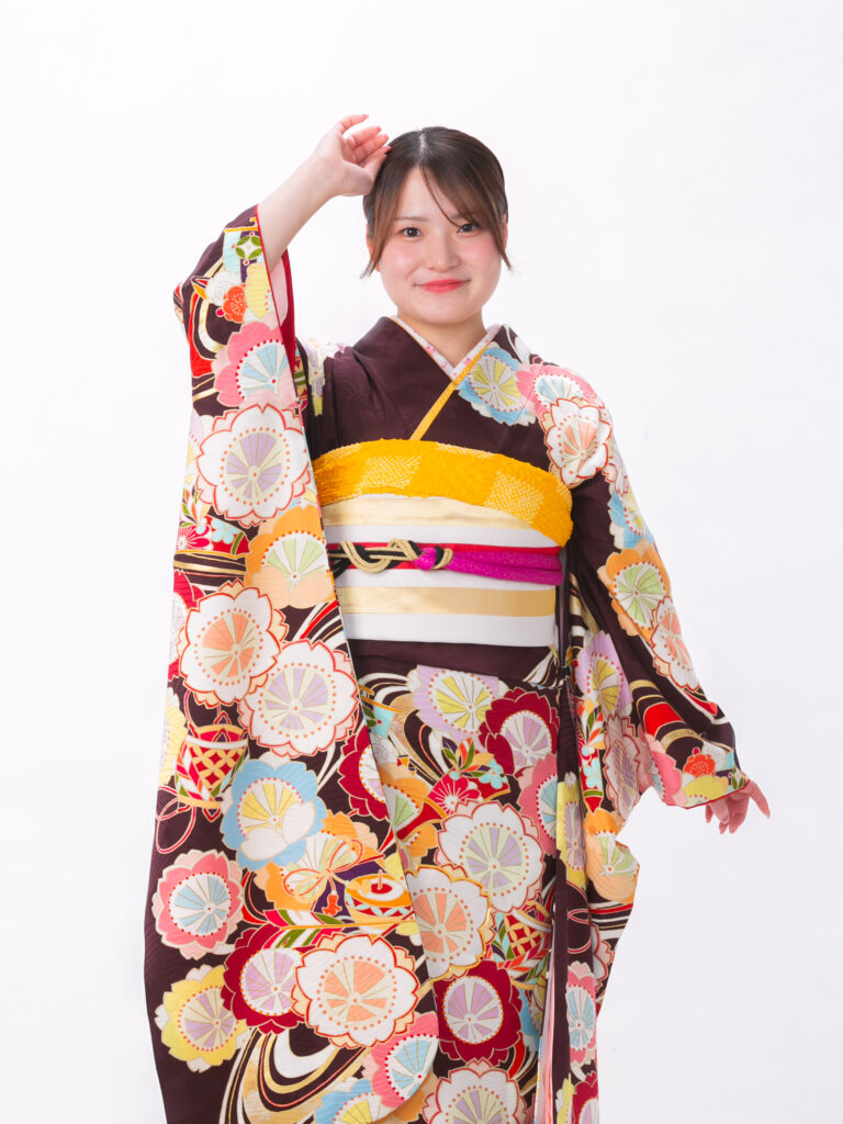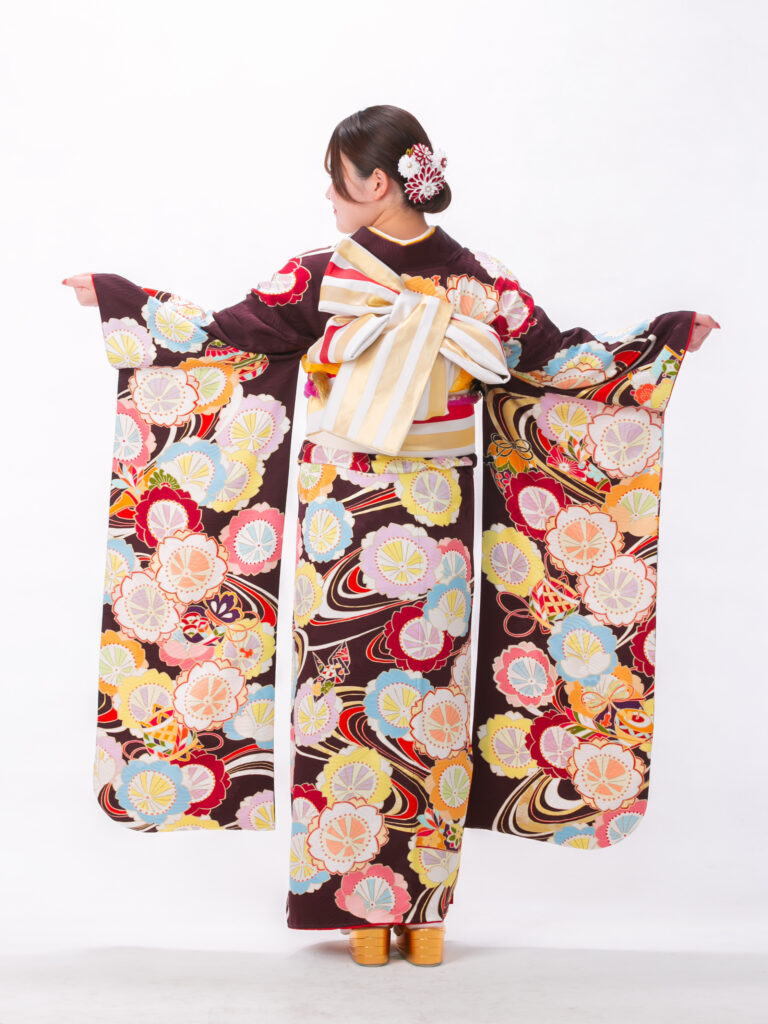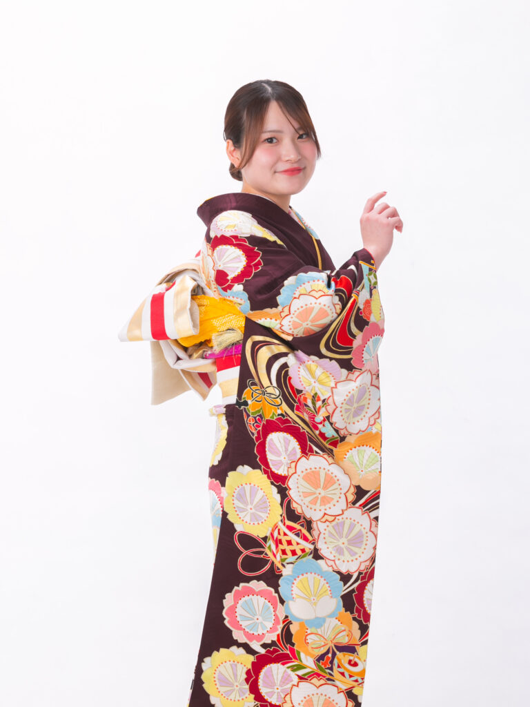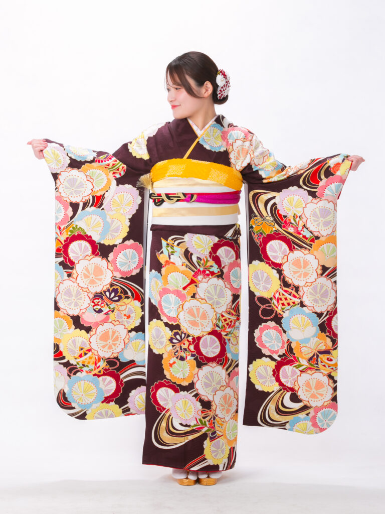 落ち着きのあるこげ茶色をベースに、 色とりどりの丸い花々が可愛らしい振袖。 全体に散りばめられた丸い花びらの文様が 二十歳らしい可憐でポップな雰囲気に。