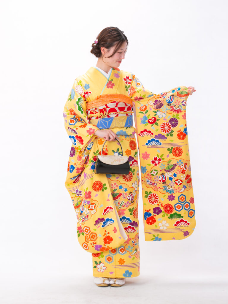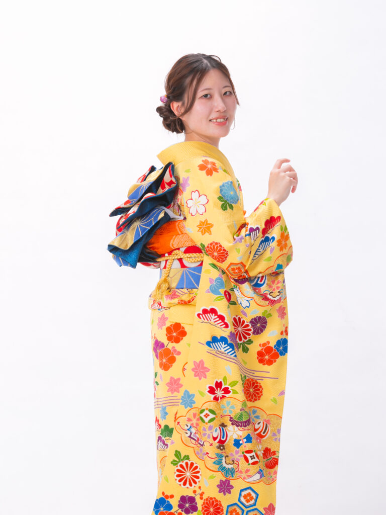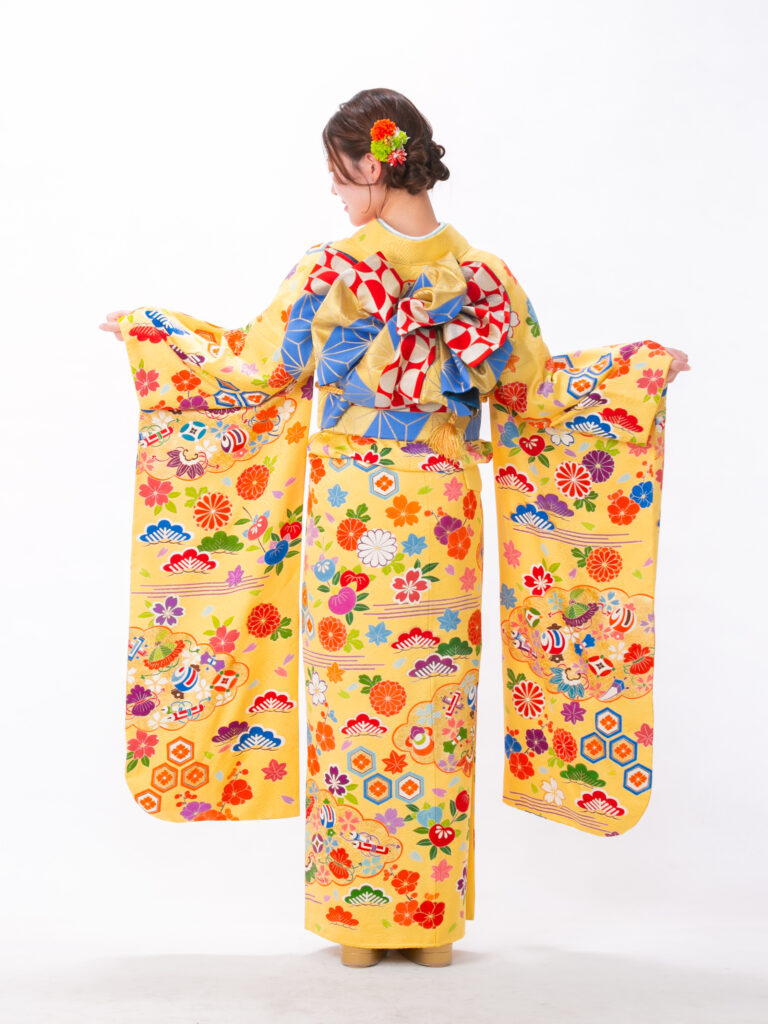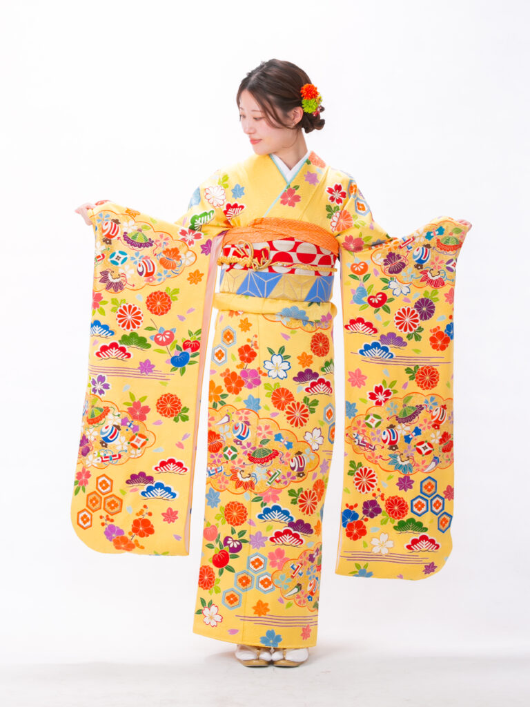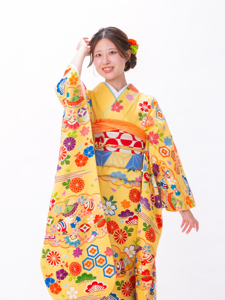 明るく幸福感に満ちた黄色をベースに 鮮やかな古典文様がフレッシュな振袖。 赤、オレンジ、紫といった多彩な色が どの角度から撮っても主役級の華やかさです。