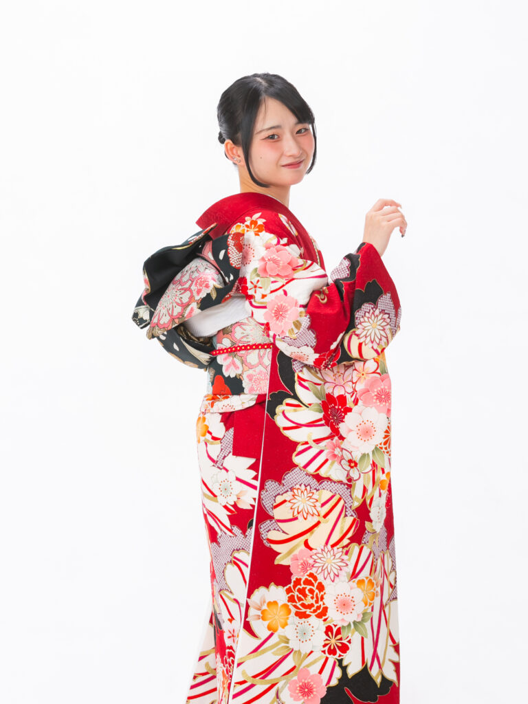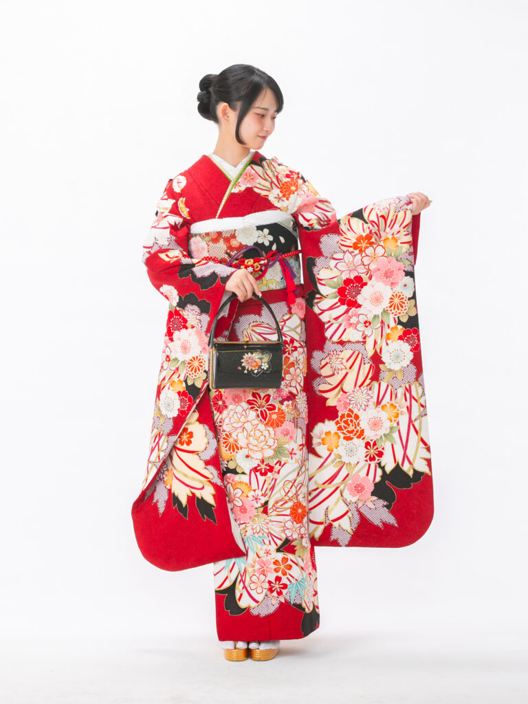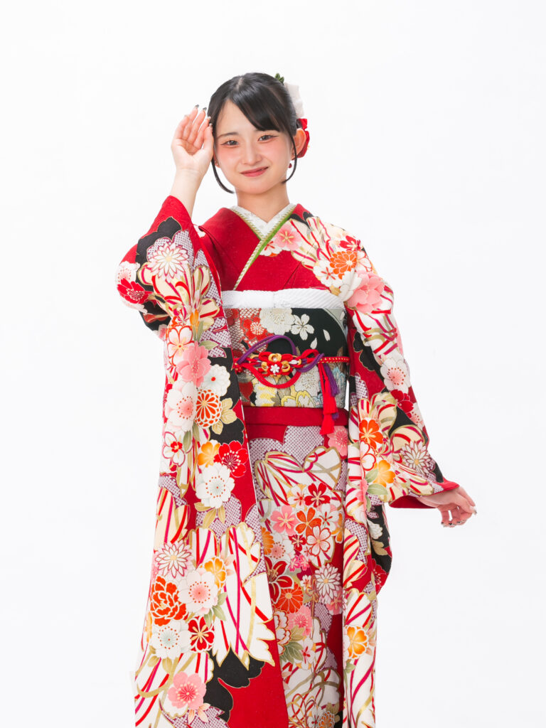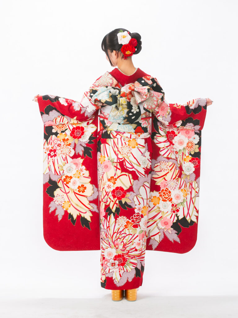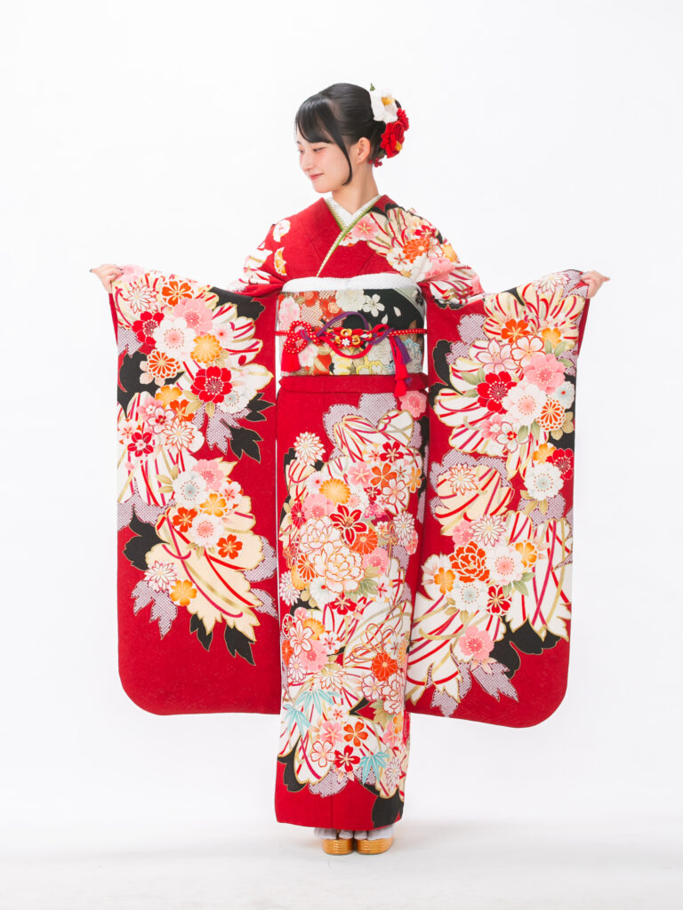赤地に花々の輪郭や背景に散らされた金箔が 上品に輝き、高級感を感じさせる振袖。 新しい門出を祝う花々が隅々まで配置され、 どこから見ても隙のない美しさを演出します。