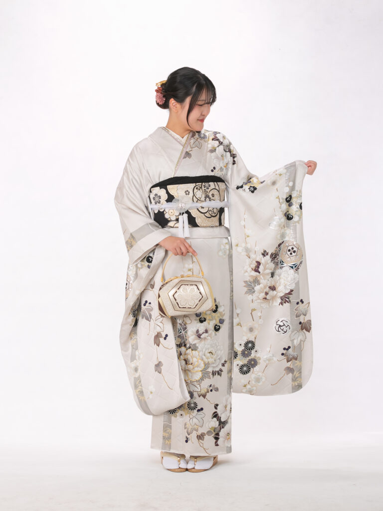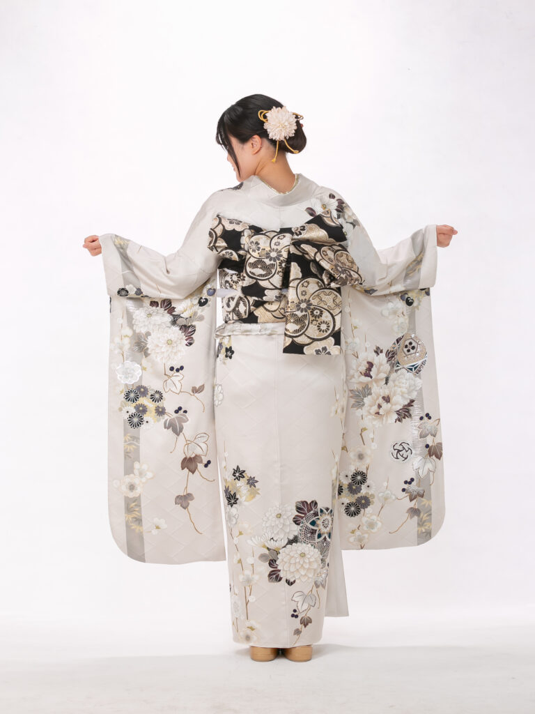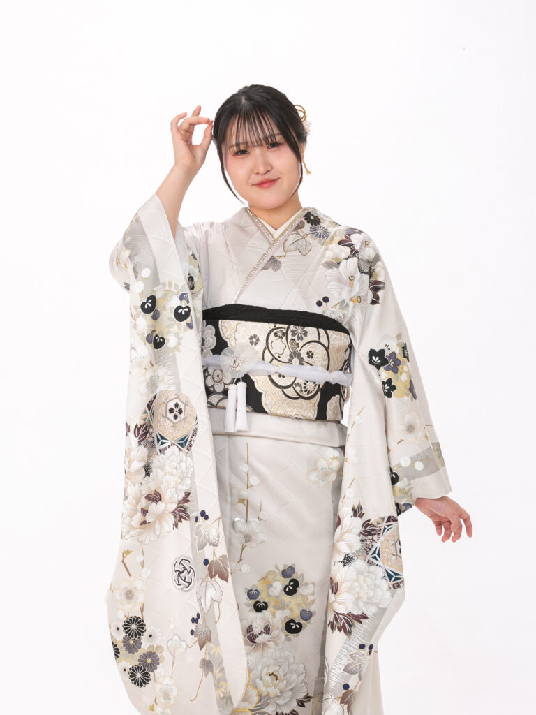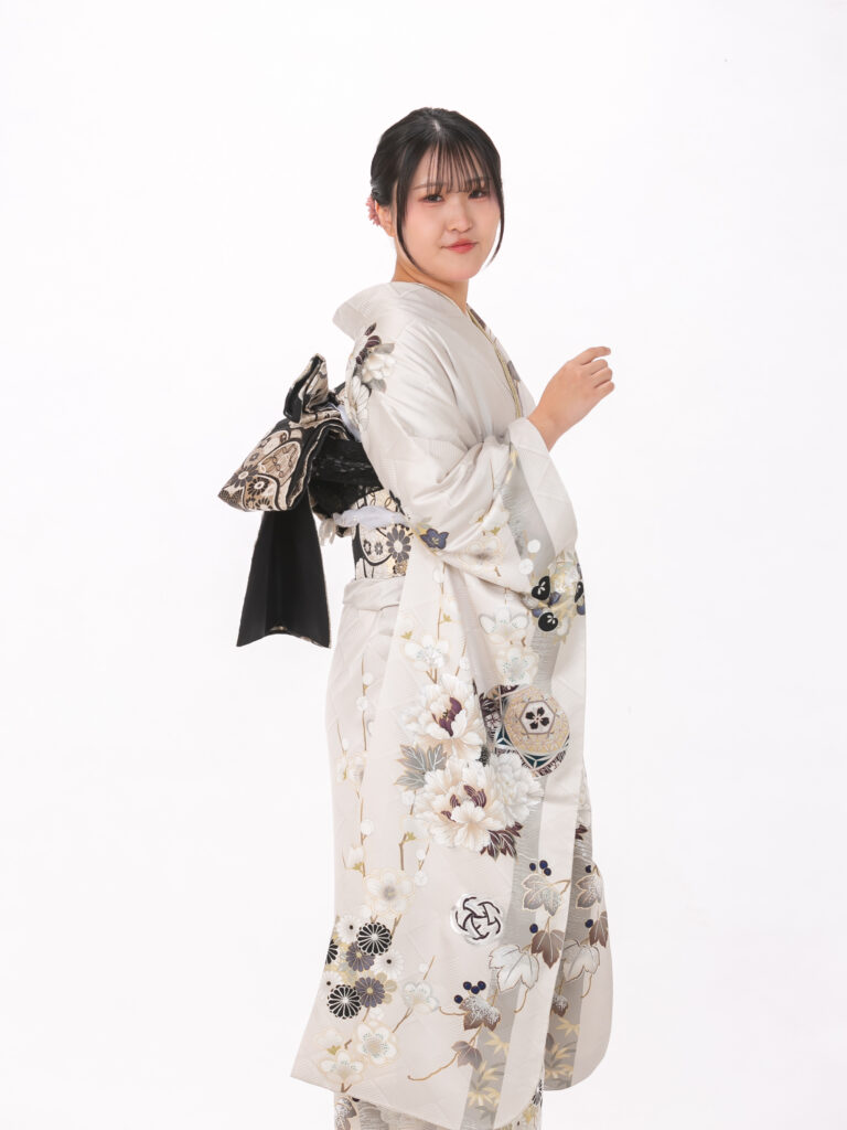アイボリー黒やグレーの落ち着いた配色で 花柄が描かれた清楚でモダンな振袖。 鮮やかな色が主流の中であえてモノトーンを 選ぶことで周りと差がつく洗練さを確立。