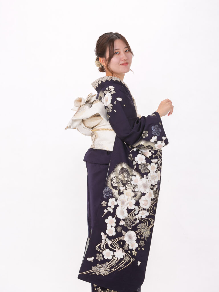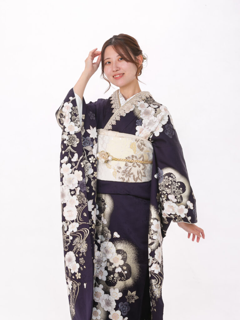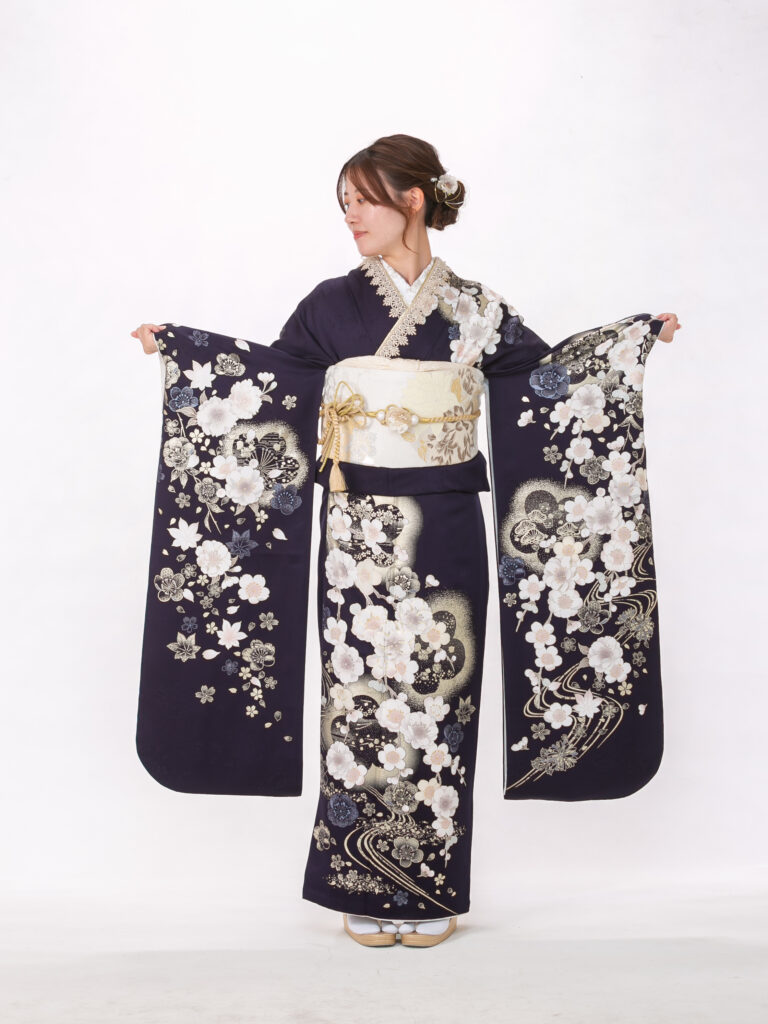 深い紺色を地色に、白を基調とした 花柄が華やかに描かれた上品な振袖。 紺色と白い花柄の組み合わせは、 気品と清楚な大人の女性らしさを演出。