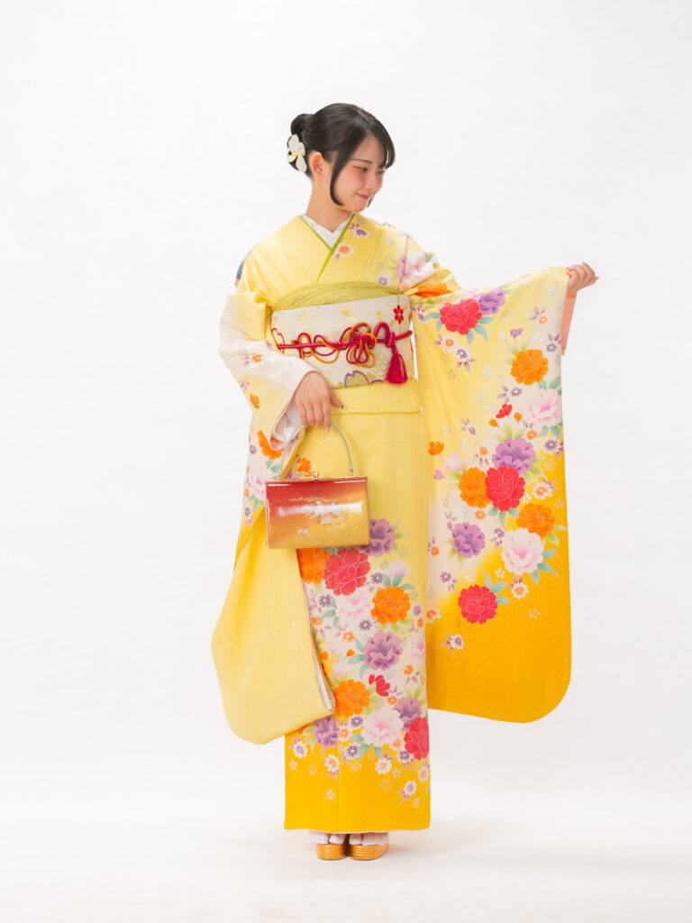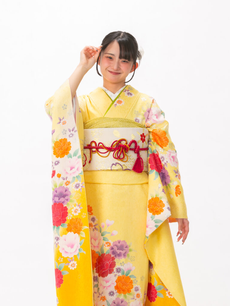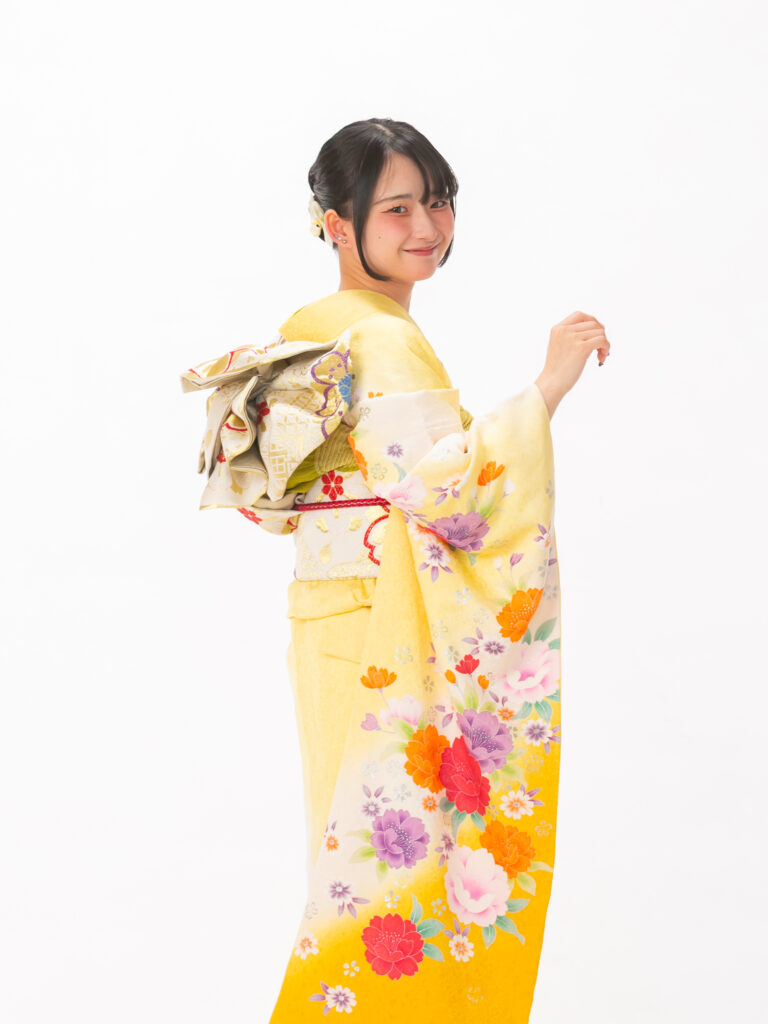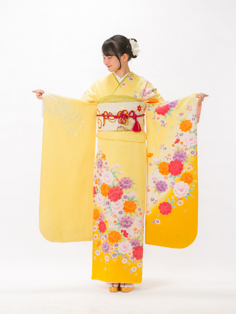 柔らかなレモンイエローに鮮やかな 牡丹が咲き誇るハッピーオーラ溢れる振袖。 彩度の高い暖色のコントラストは 若々しさと躍動感を引き出します。