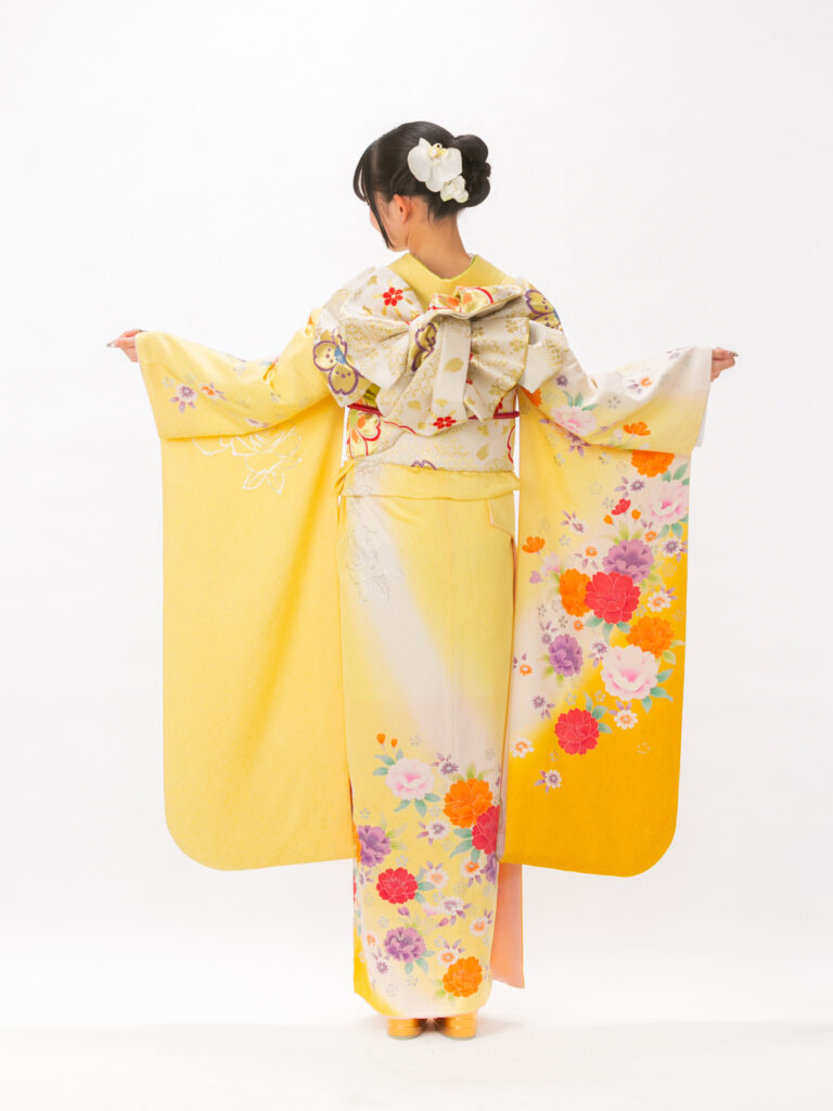 黄色を基調に裾にかけて橙色への グラデーションが目を引く振袖。 ビタミンカラーと四季折々の花々で 会場でもひときわ輝く存在になります。