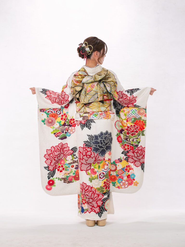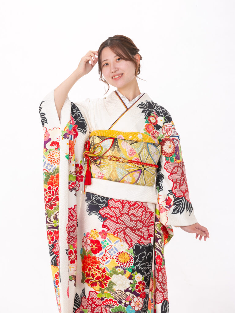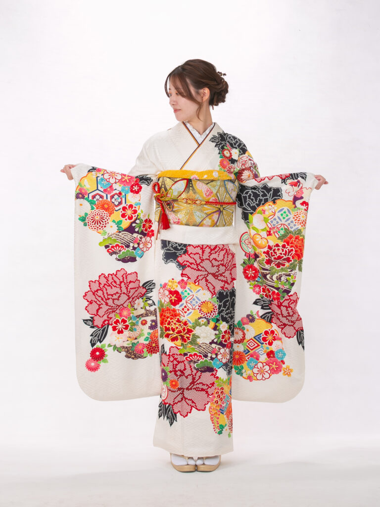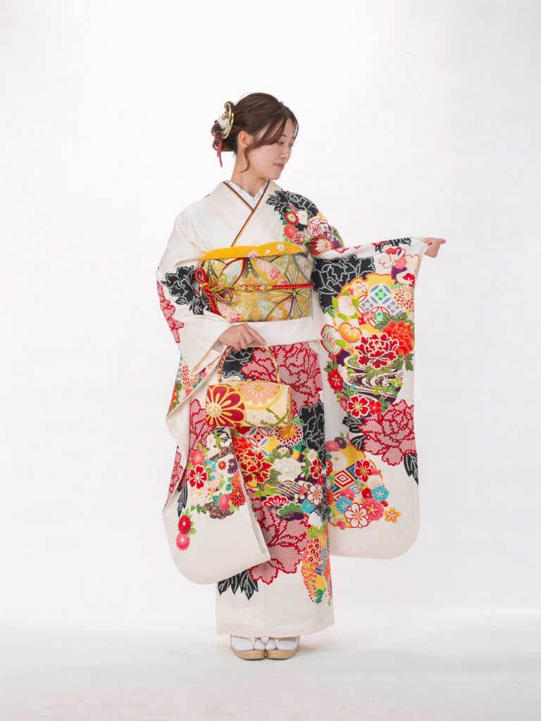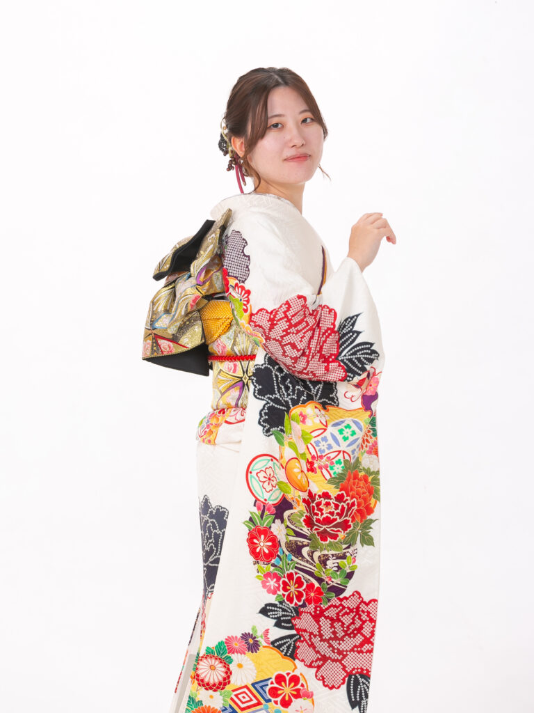 白地の振袖全体に鮮やかでカラフルな 古典柄が贅沢にあしらわれた振袖。 淡い地色に多色の柄が映えることで、 会場でも目を引く存在感を放ちます。