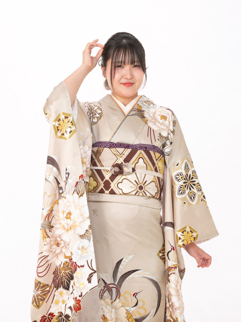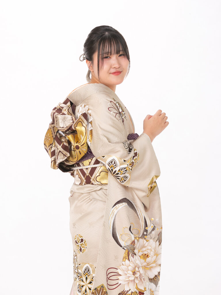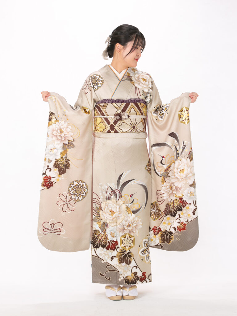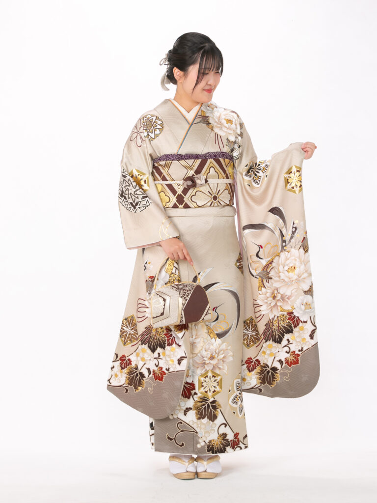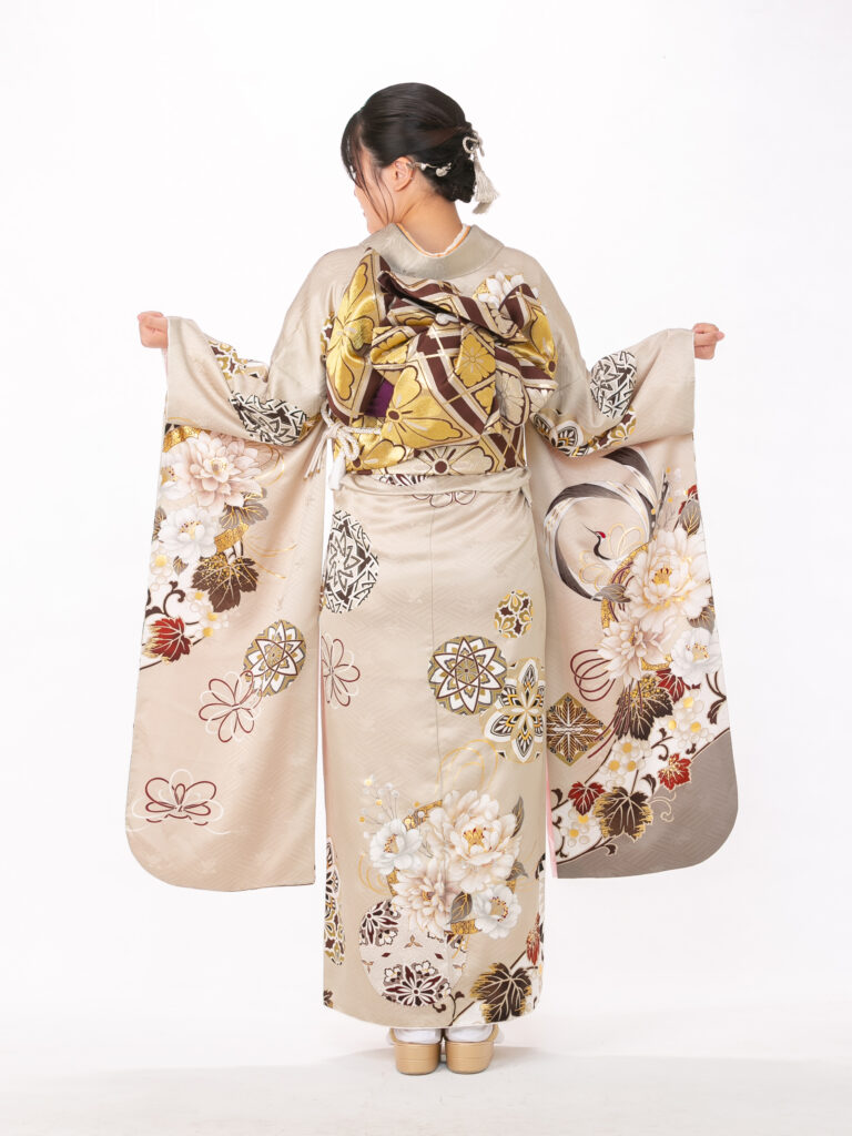 大輪の菊や牡丹などの古典的な花柄が 豊かな色彩で描かれた目を引く振袖。 裾や袖口の深いブラウンのぼかしが、 伝統的な美しさに大人っぽい表情を添えます。