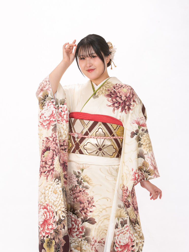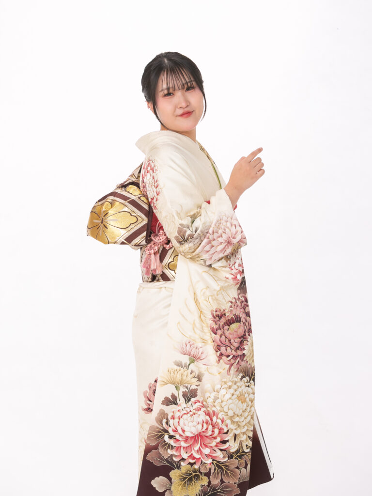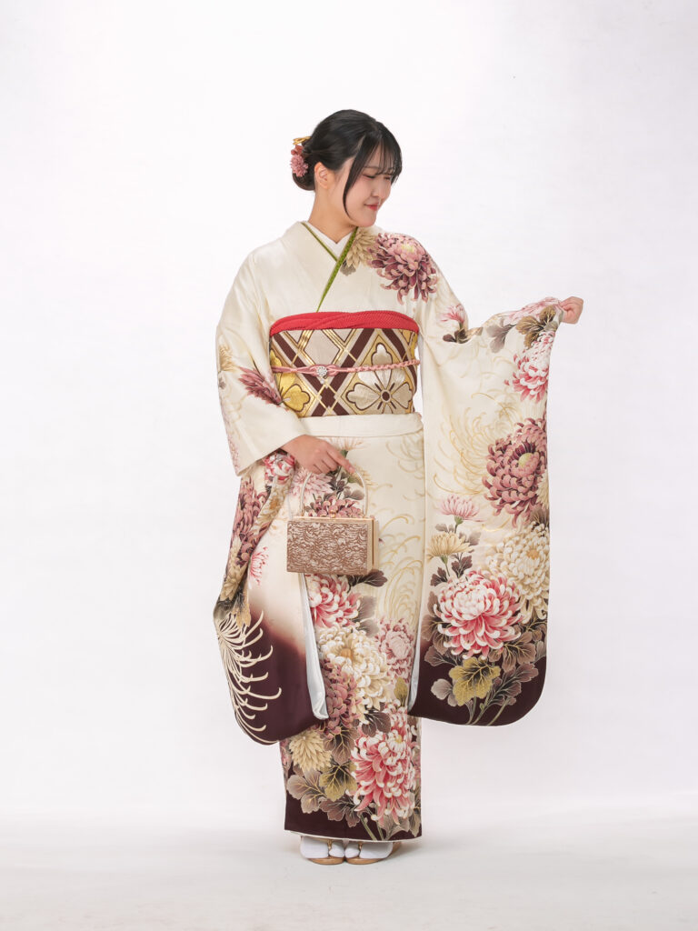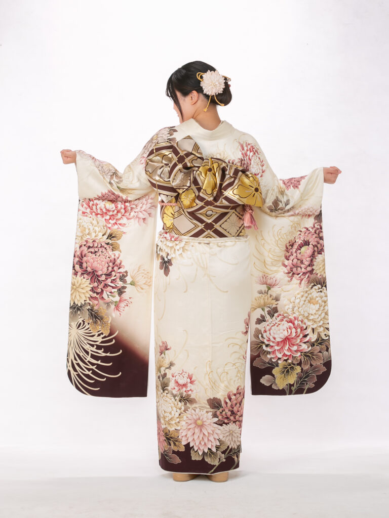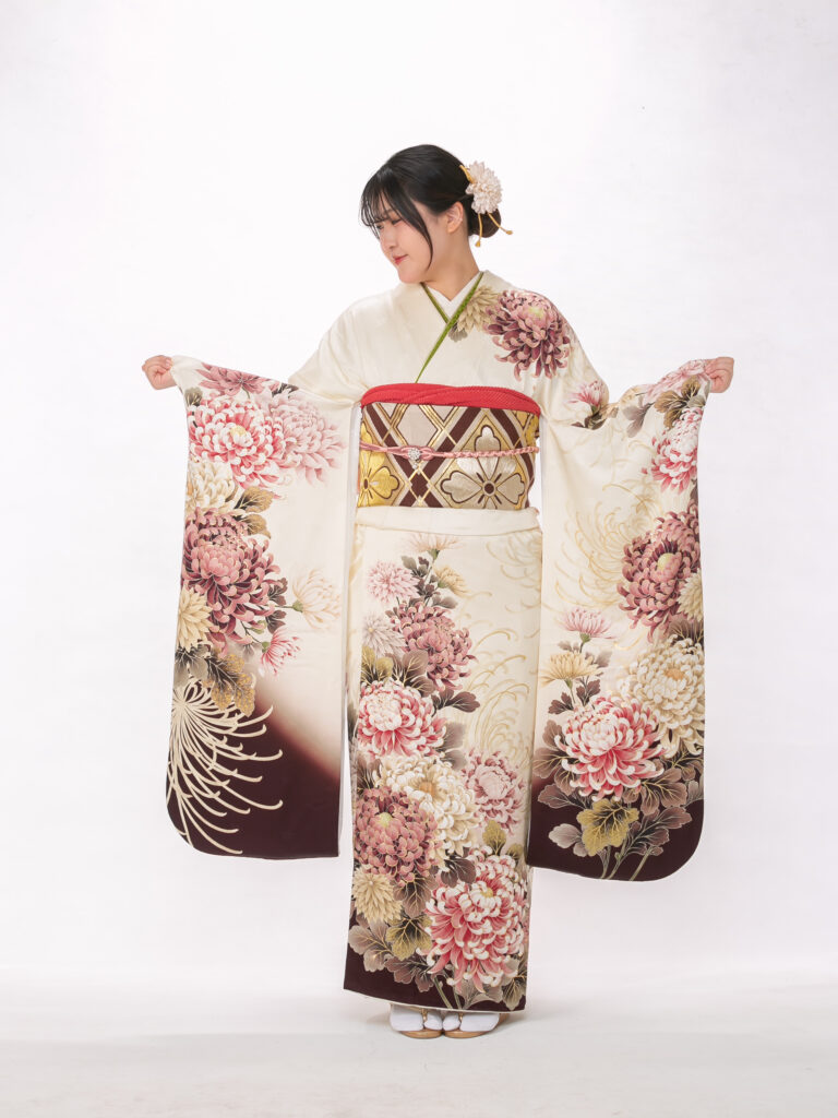 大輪の菊や牡丹などの古典的な花柄が 豊かな色彩で描かれた目を引く振袖。 裾や袖口の深いブラウンのぼかしが、 伝統的な美しさに大人っぽい表情を添えます。