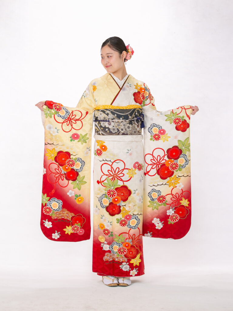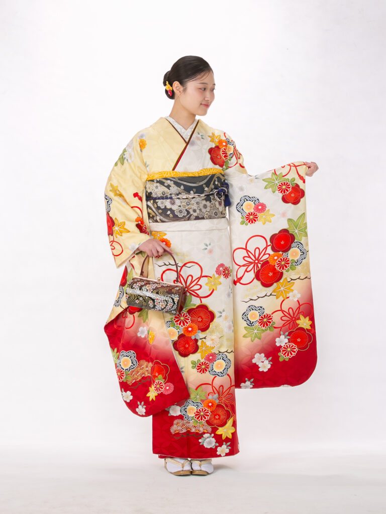 伝統的な縁起の良い色である赤色が 美しい染め分けが特徴の振袖。 金糸や金彩加工も施されており、 晴れの日にふさわしい格調高い印象に。