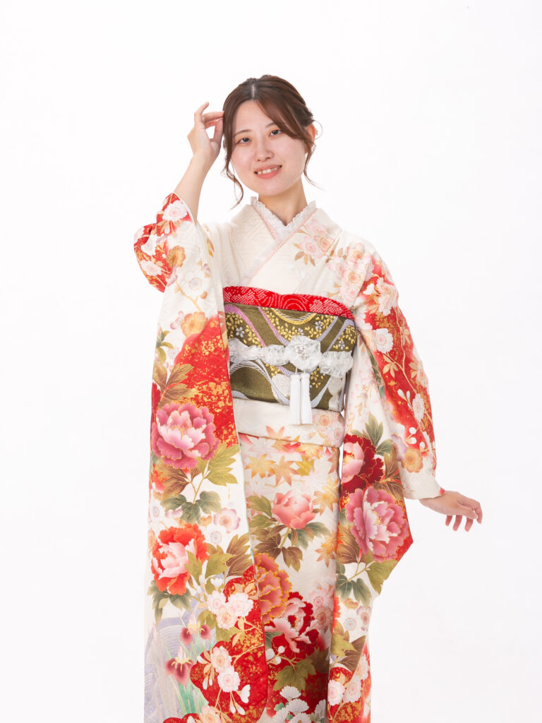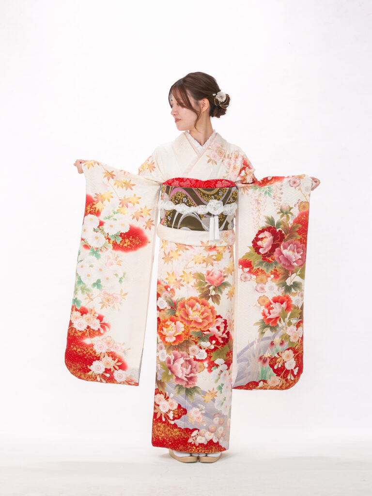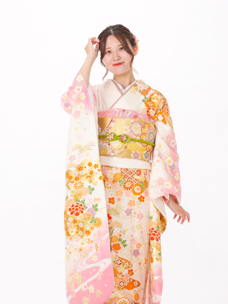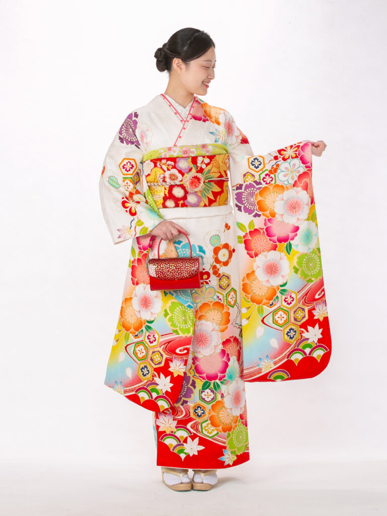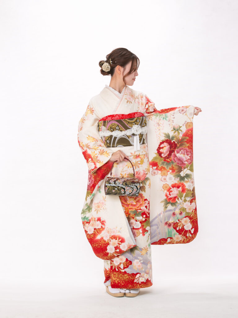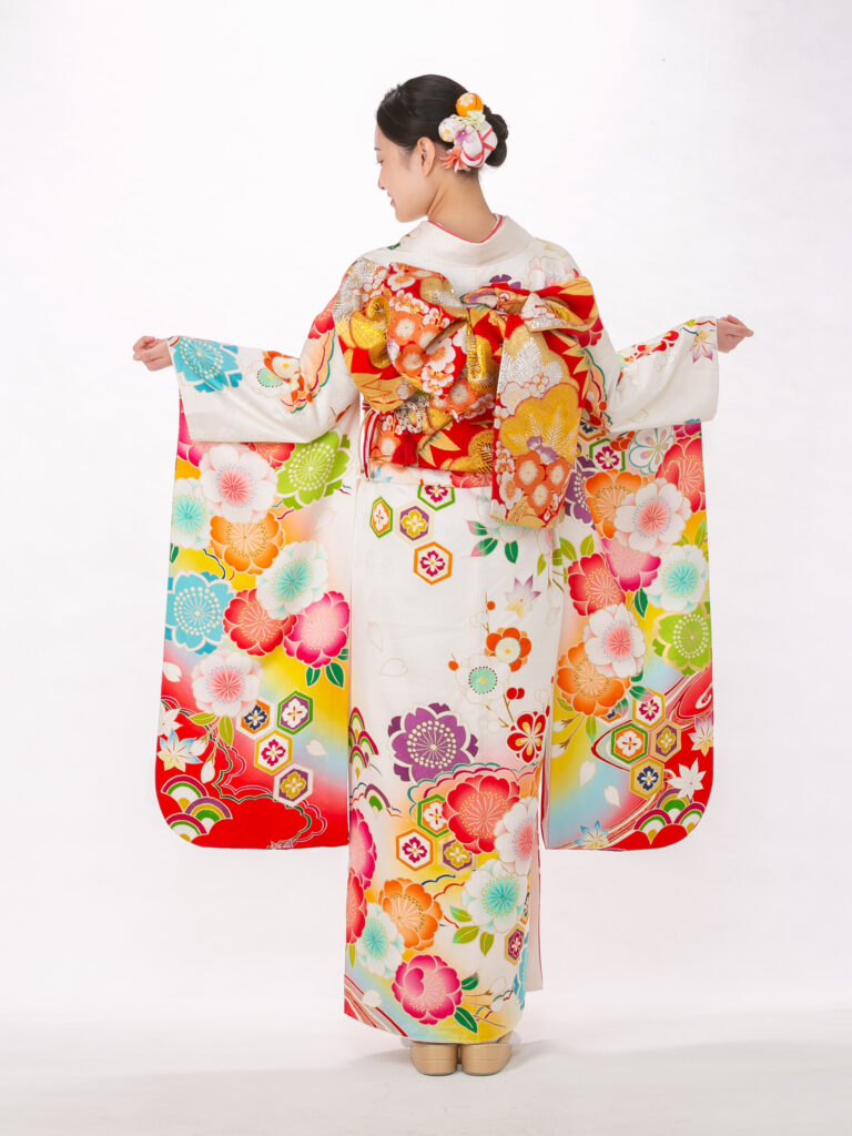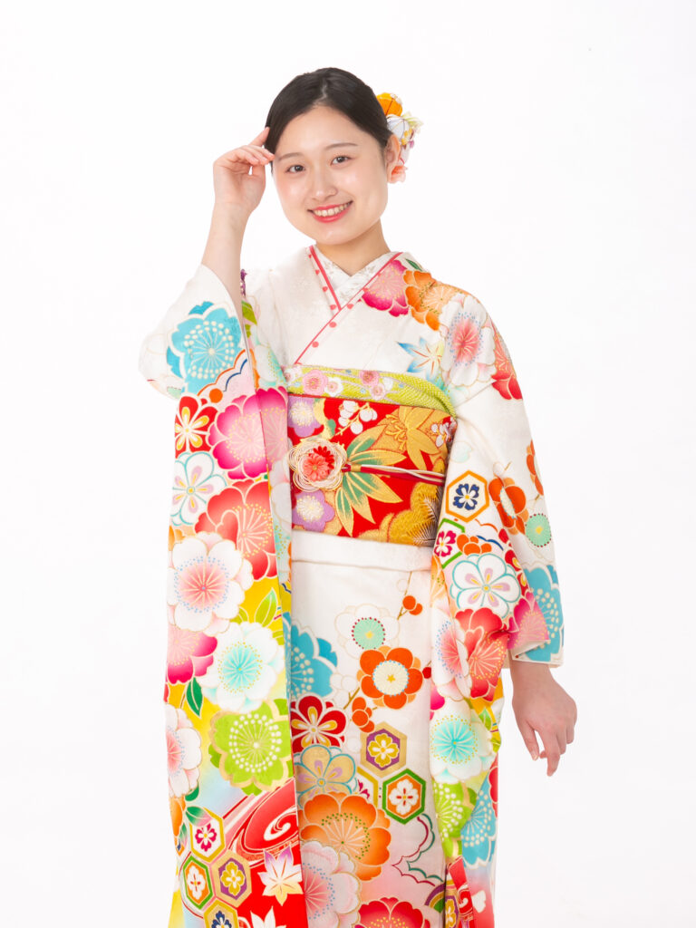 白地の振袖全体に鮮やかでカラフルな 古典柄が贅沢にあしらわれた振袖。 淡い地色に多色の柄が映えることで、 会場でも目を引く存在感を放ちます。