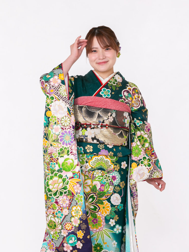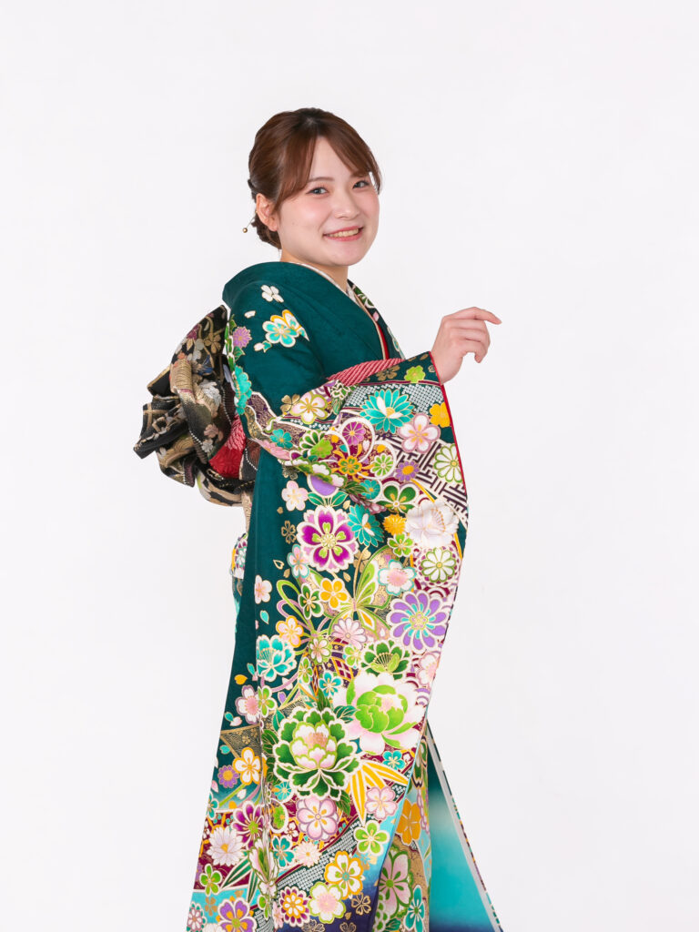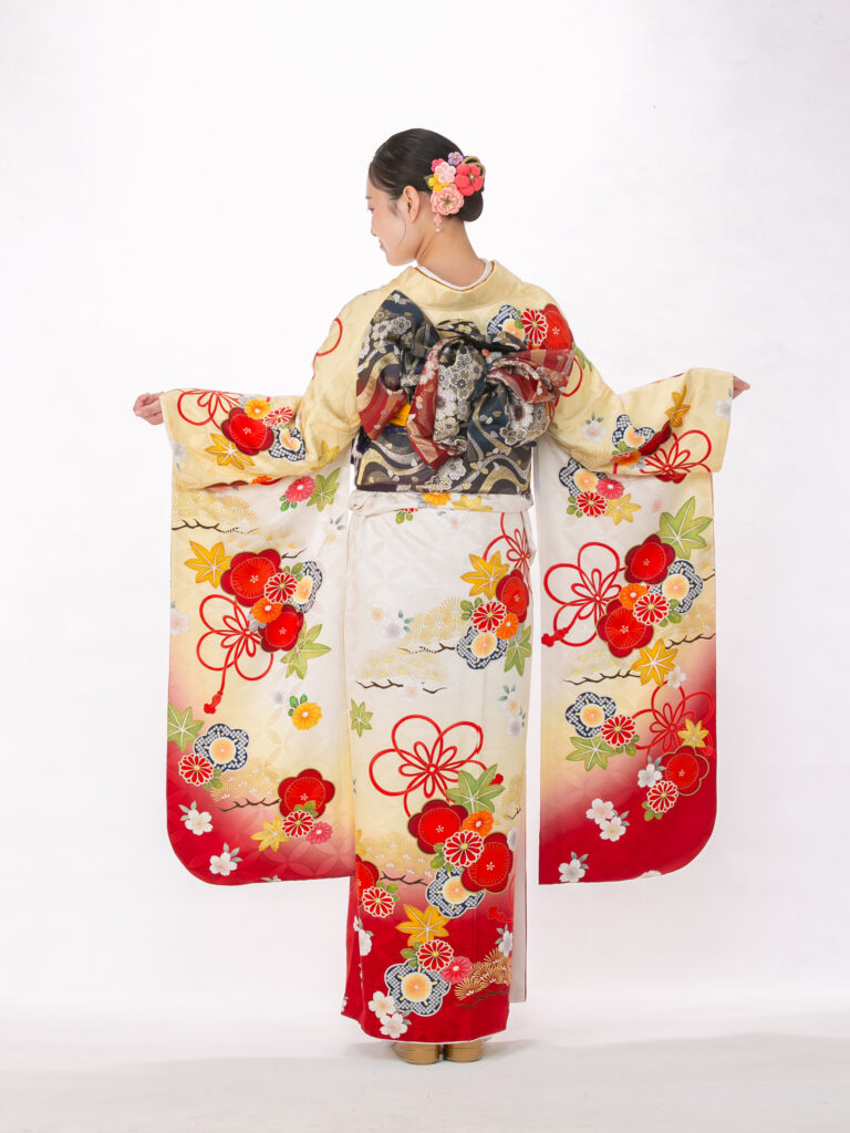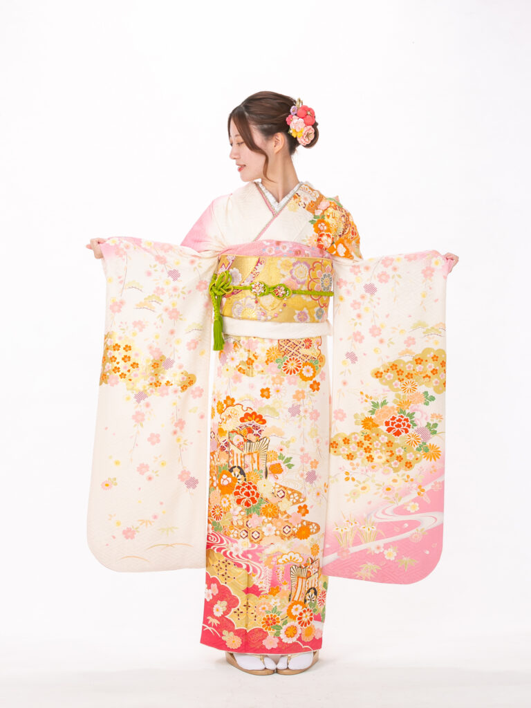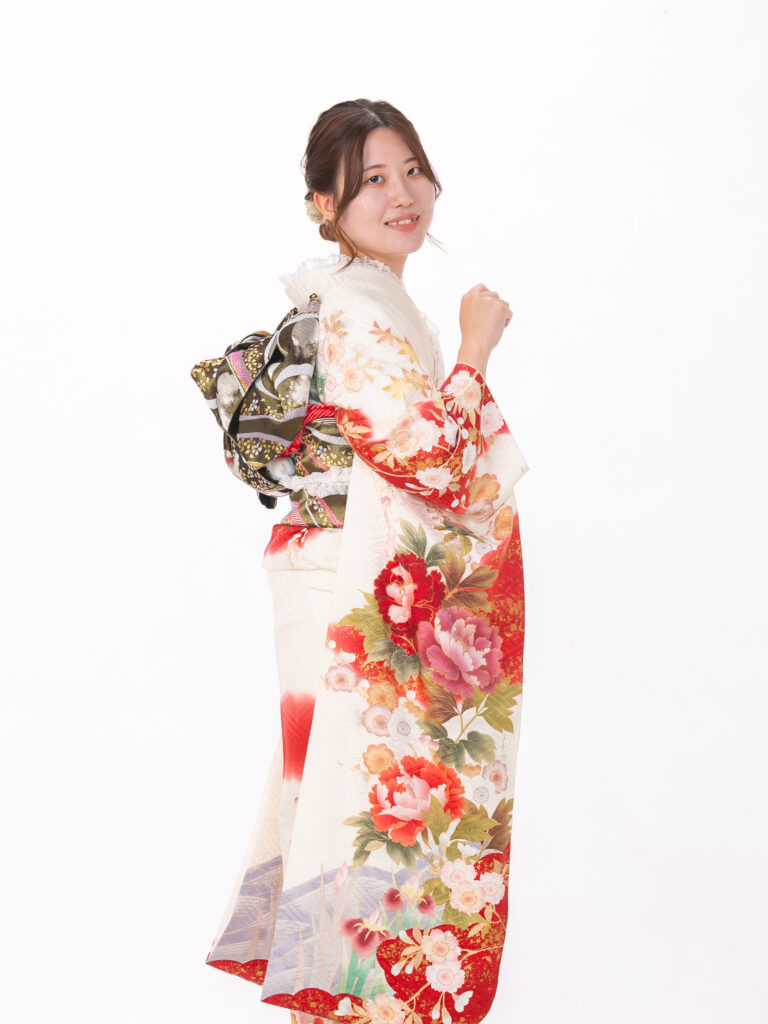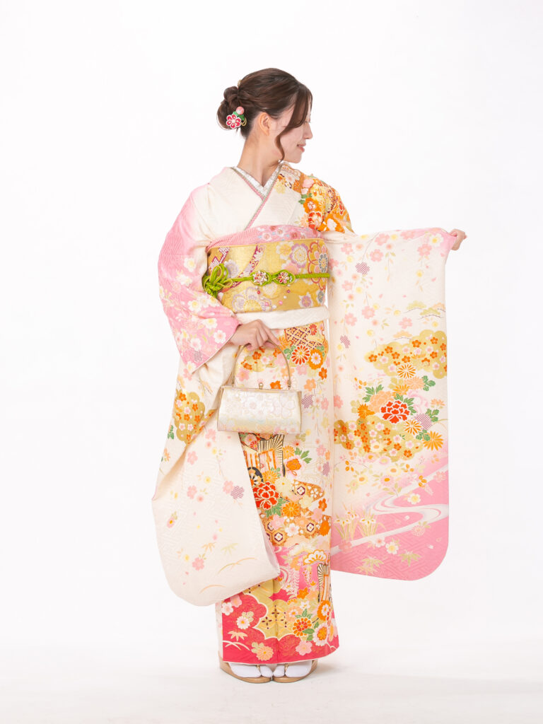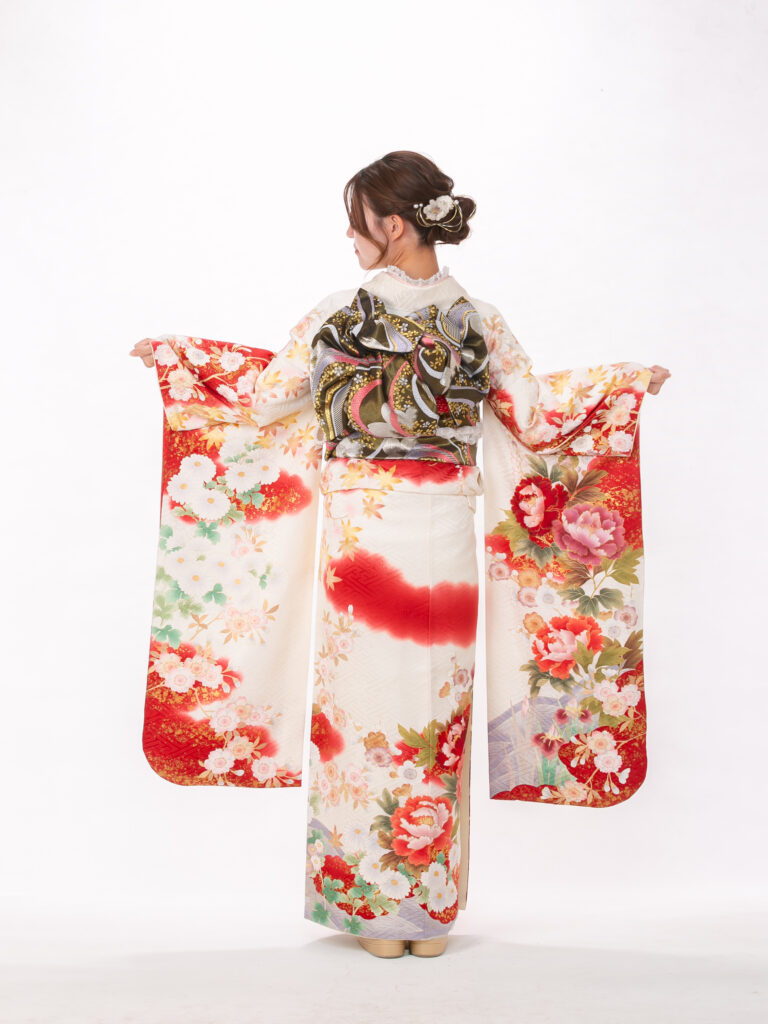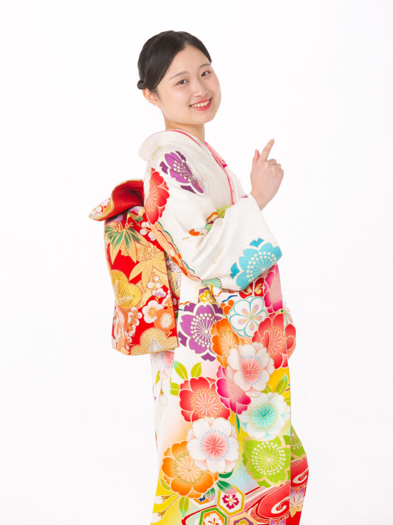 白地の振袖全体に鮮やかでカラフルな 古典柄が贅沢にあしらわれた振袖。 淡い地色に多色の柄が映えることで、 会場でも目を引く存在感を放ちます。