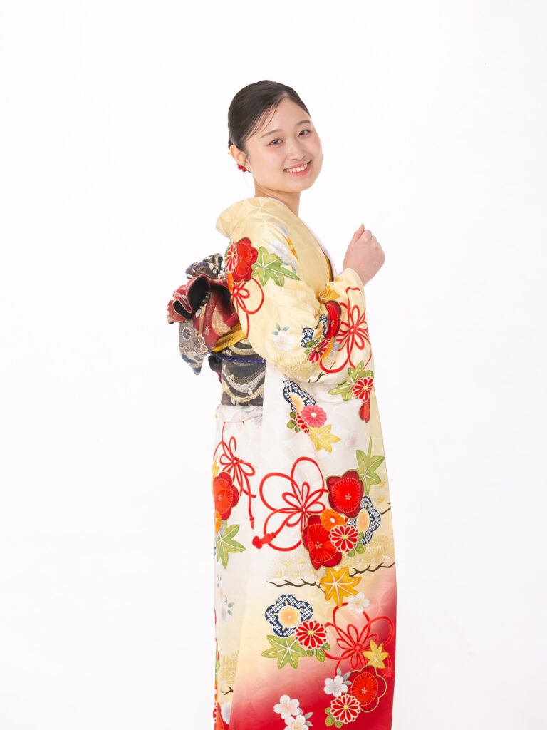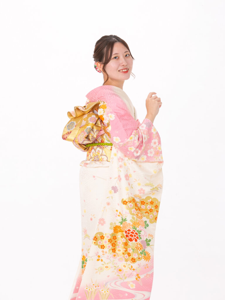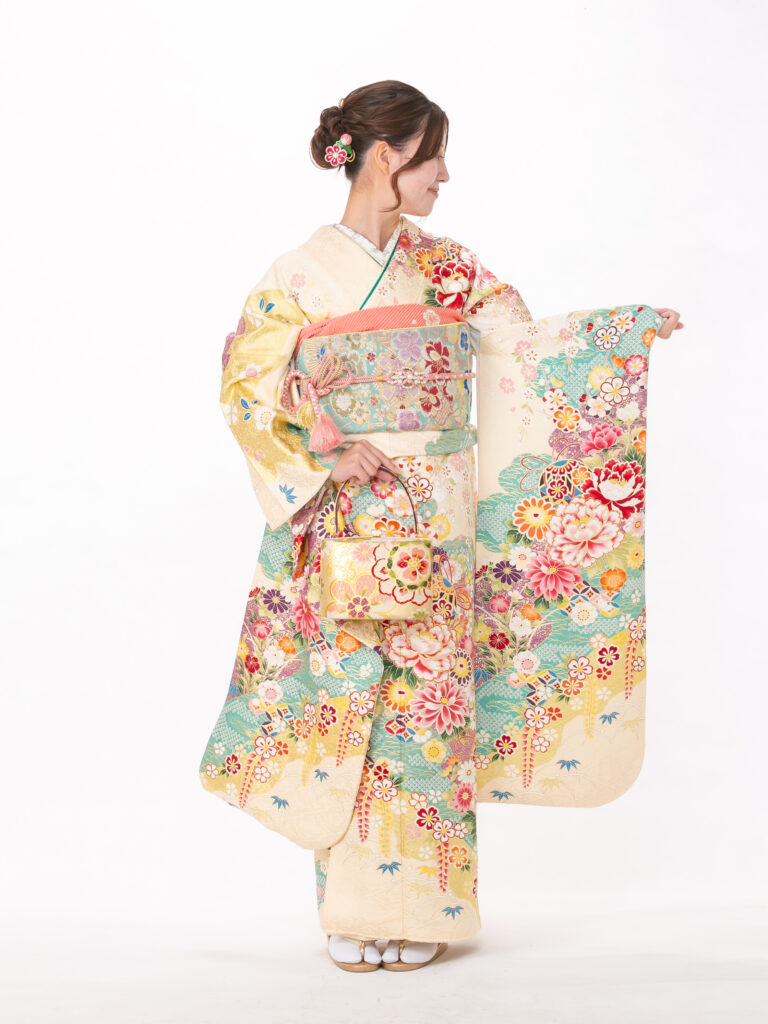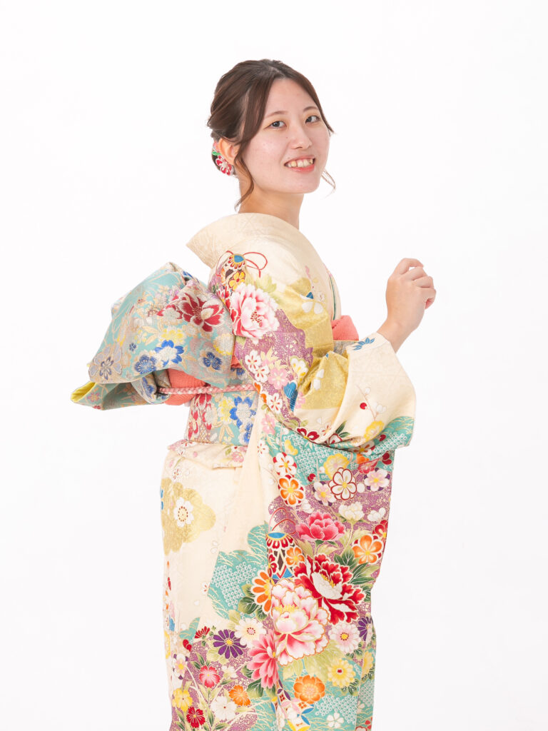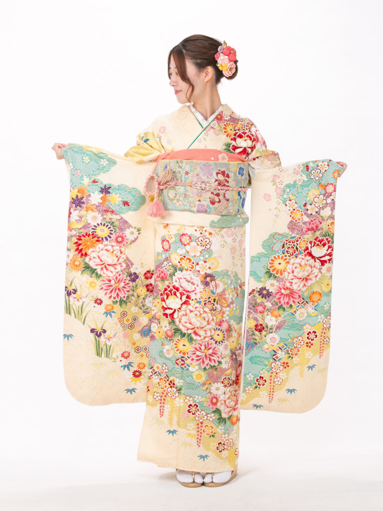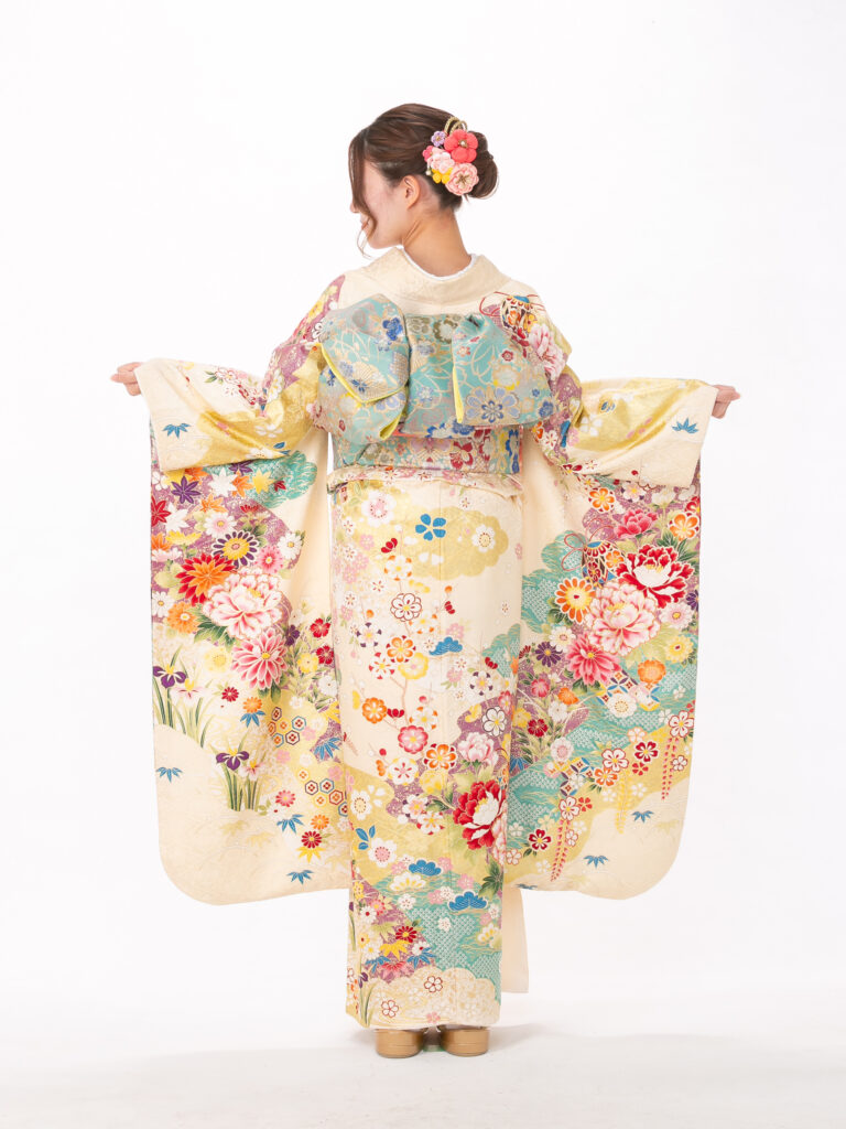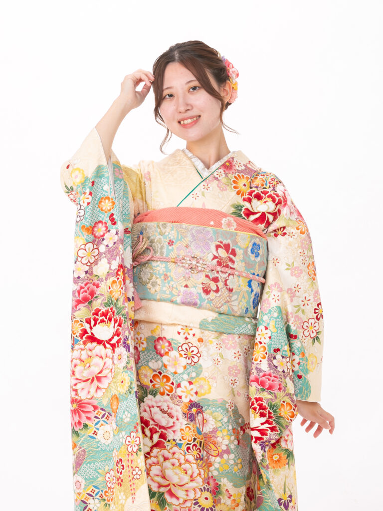 クリーム色をベースに淡い花柄で 派手すぎず清楚な雰囲気の振袖。 水色やピンクなどの鮮やかな差し色が 「大人可愛い」印象を与えます。