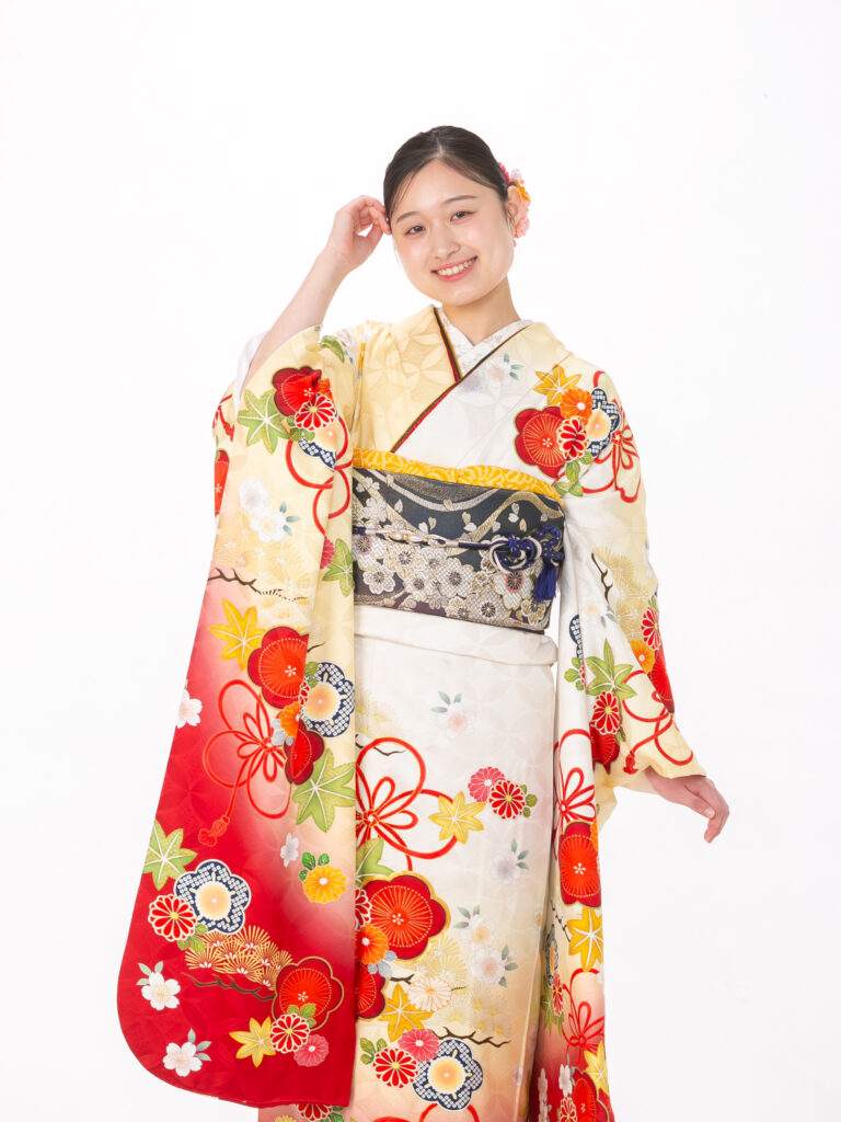 色鮮やかな花尽くしの柄を 組み合わせた古典的で正統派な振袖。 白地に赤の花柄は王道コーディネート。 流行に左右されない美しさがあります。