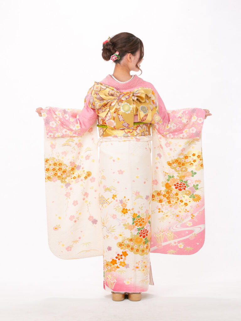 肌なじみの良い明るい地色と、 王道の古典柄による写真映えする振袖。 可愛らしいピンクへの美しいぼかしと 淡い花模様が優しい雰囲気を演出します。
