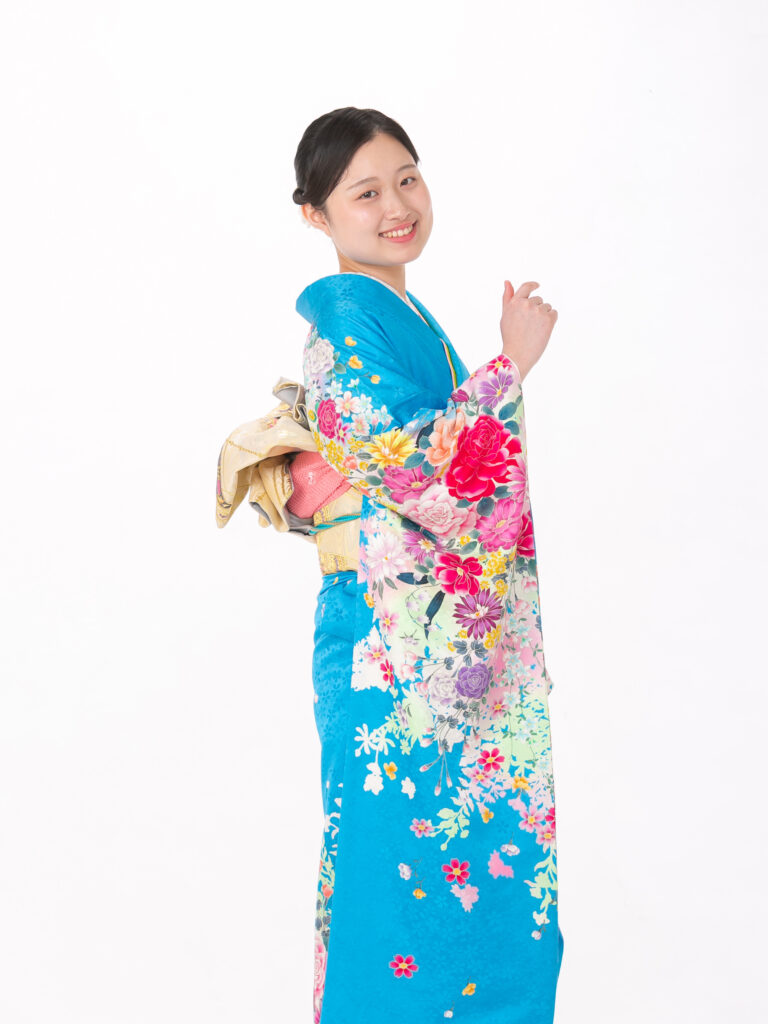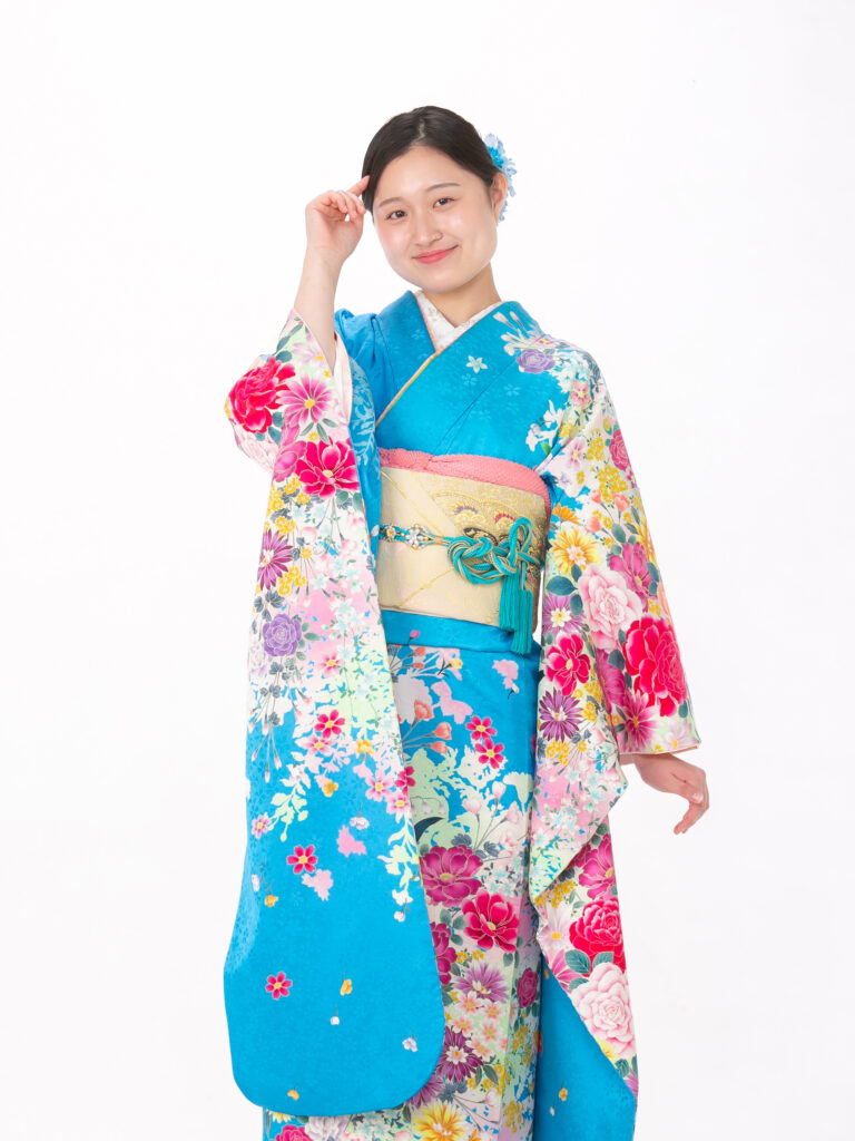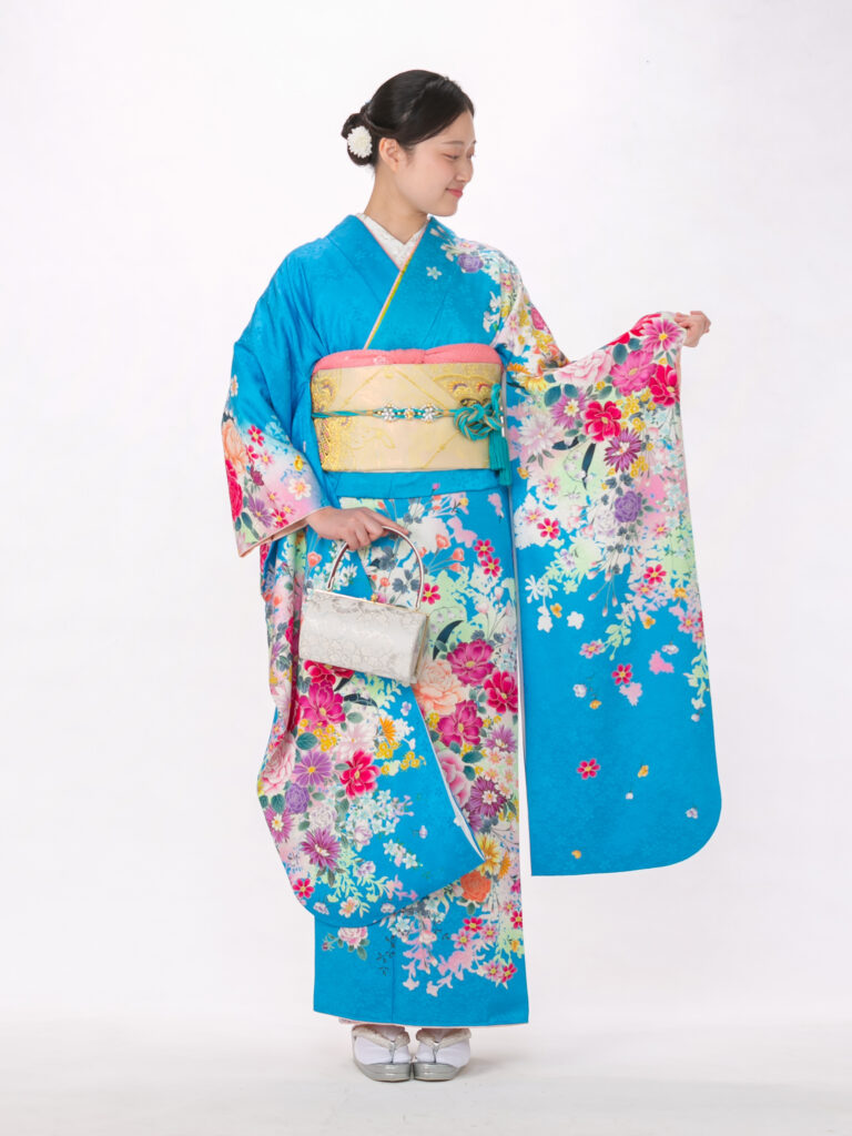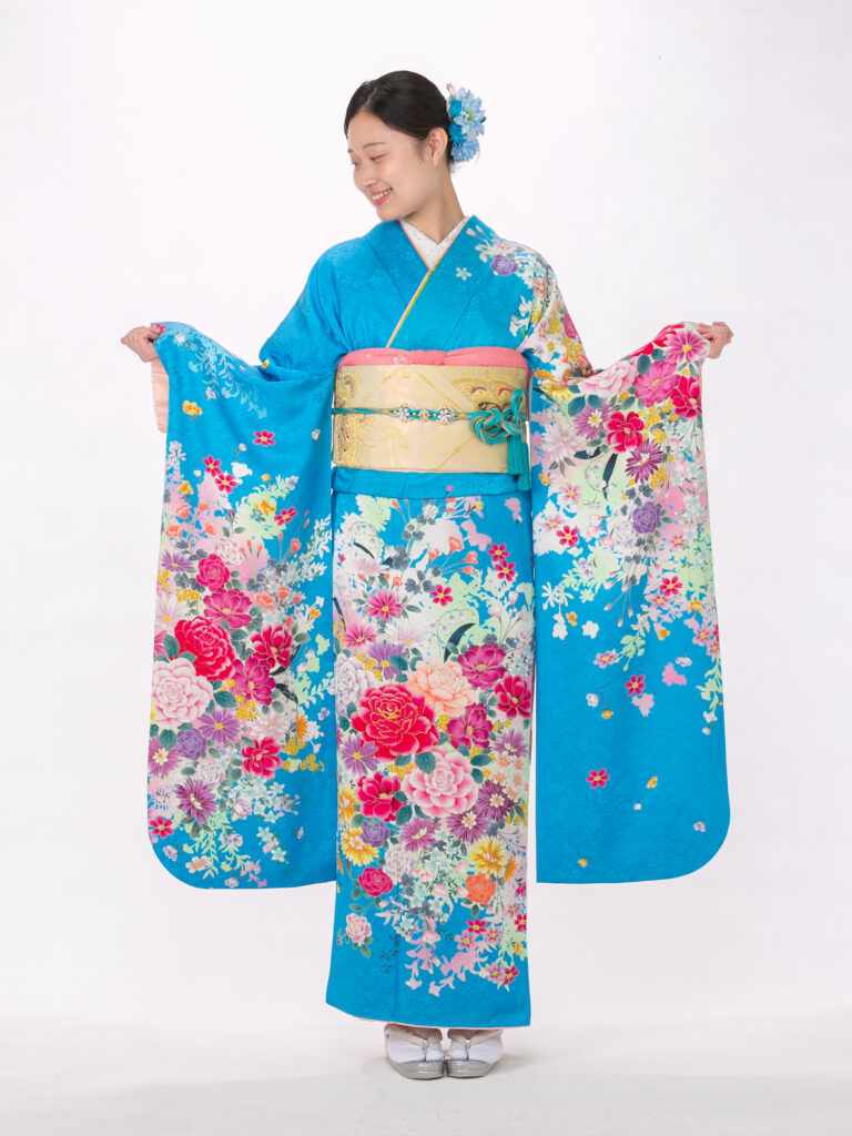 鮮やかなロイヤルブルーの地色と、 豪華な花柄が印象的な振袖。 凛とした青地に暖色系の花々の組合せが 透明感と大人らしさを感じさせます。