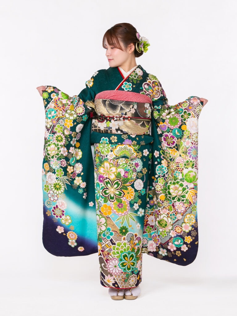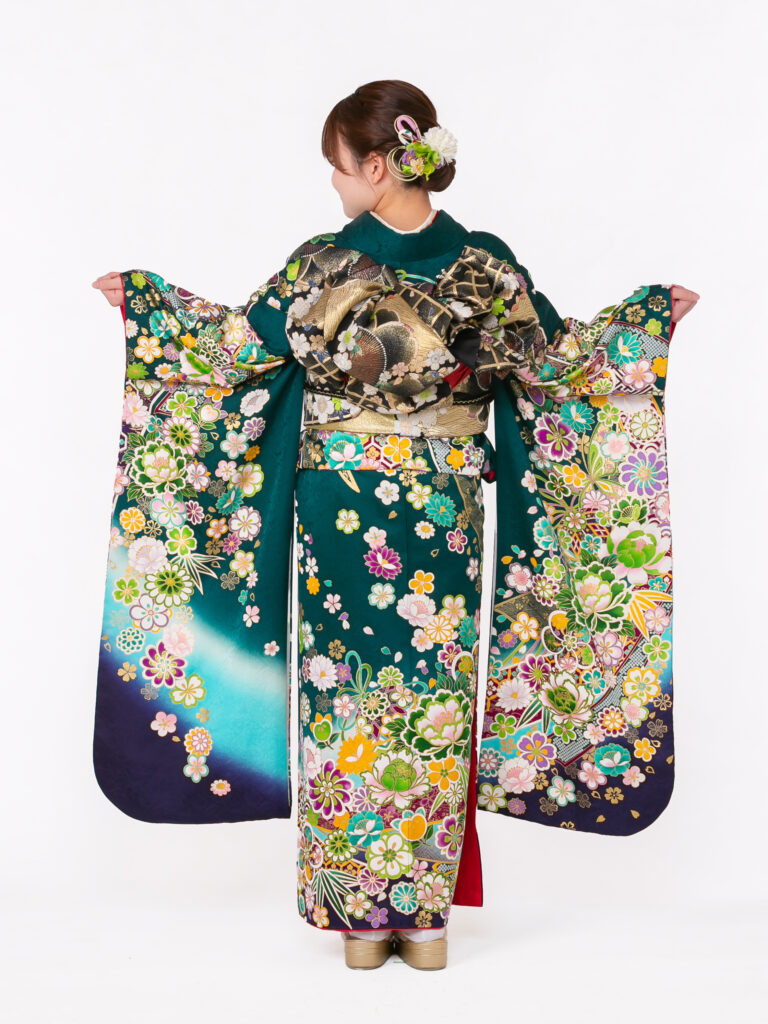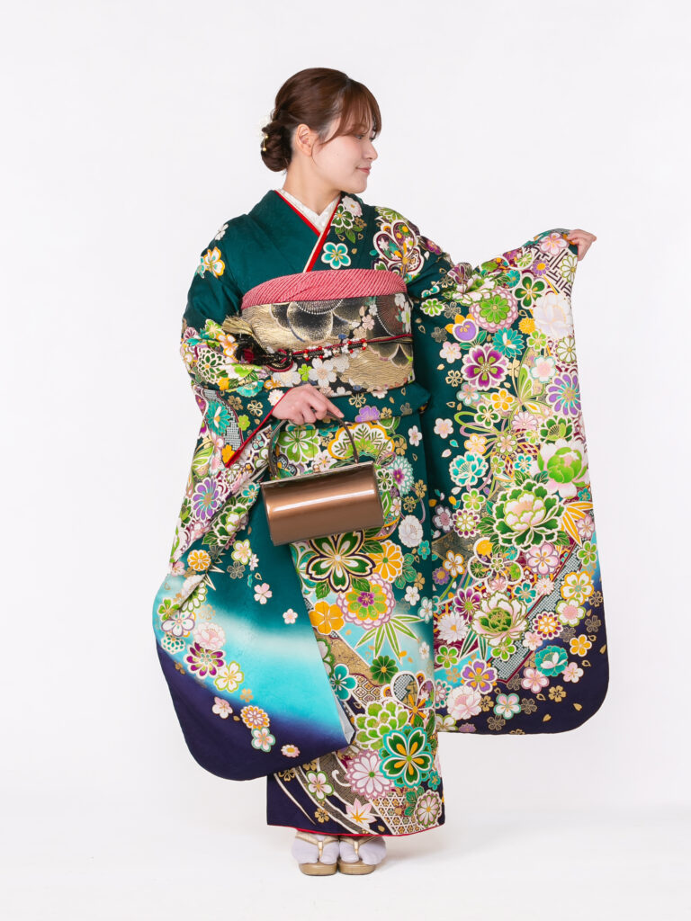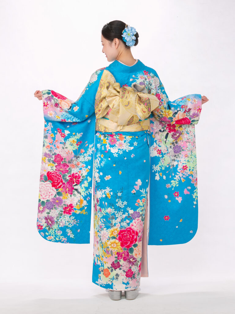 鮮やかなロイヤルブルーの地色と、 豪華な花柄が印象的な振袖。 凛とした青地に暖色系の花々の組合せが 透明感と大人らしさを感じさせます。