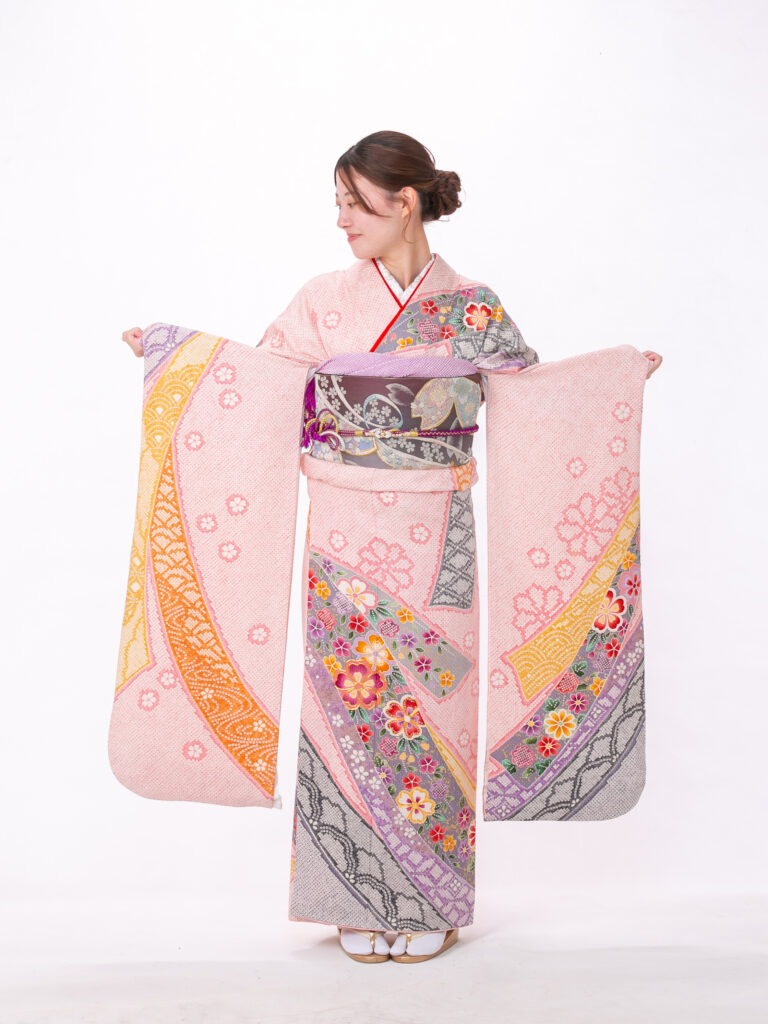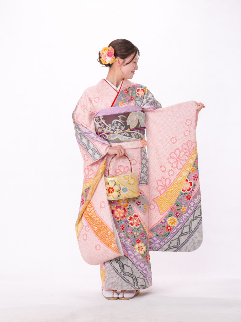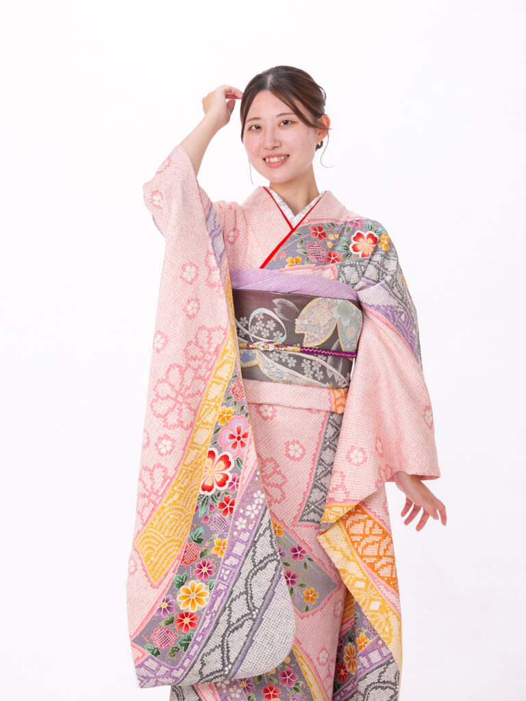 淡い桃色をベースに桜・梅などの 花々を散りばめた振袖。 袖や裾にかけて織り込まれた伝統文様が 可愛さの中に凛とした印象を与えます。