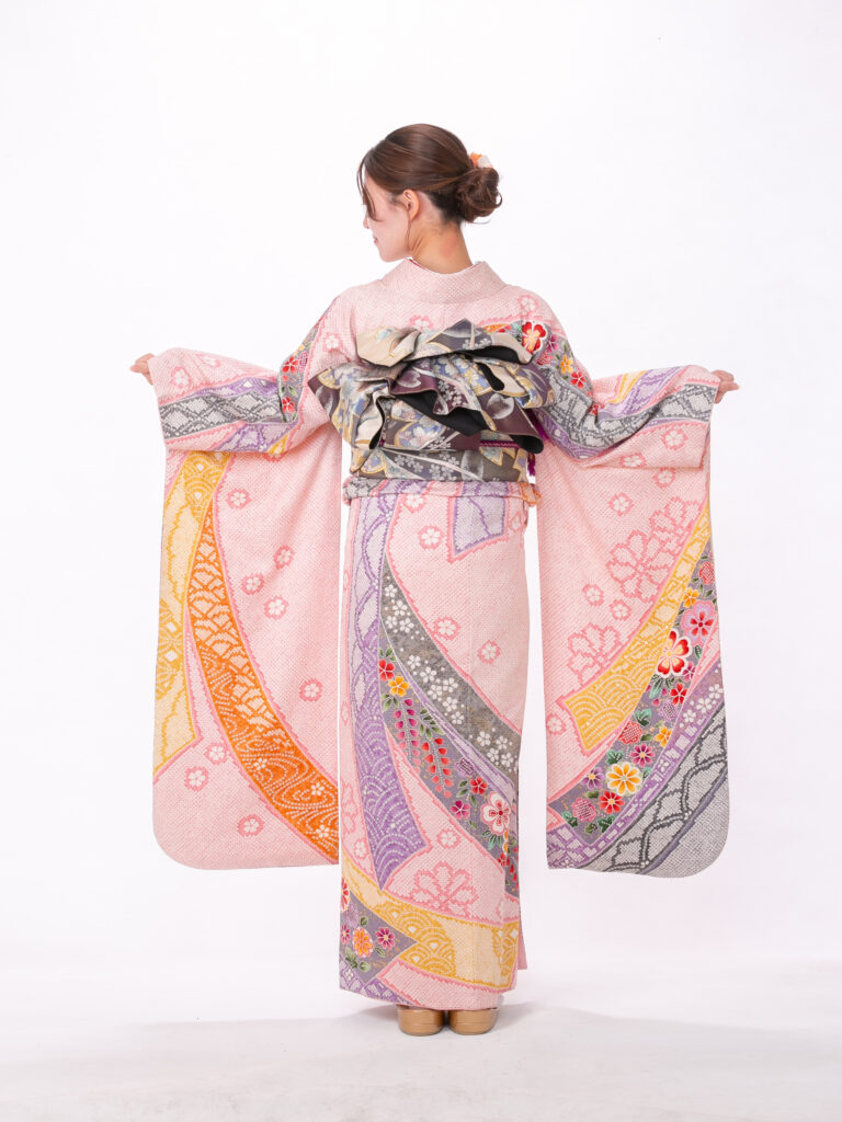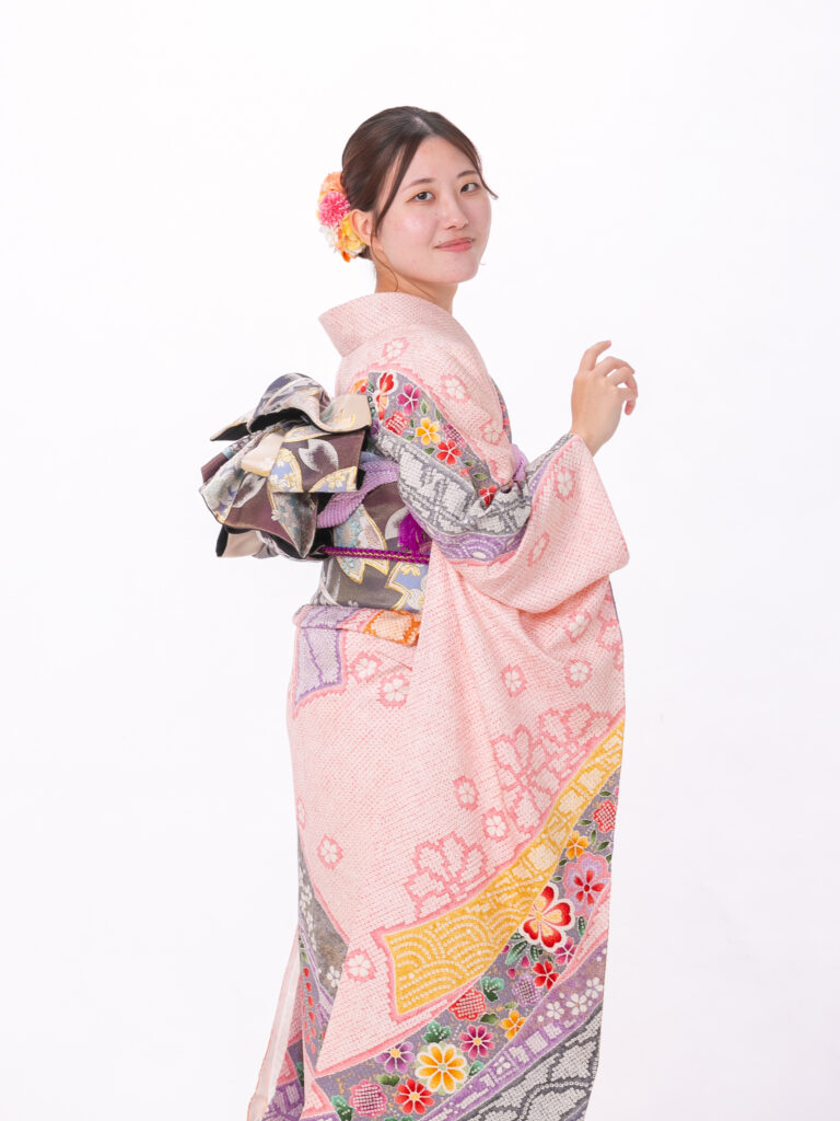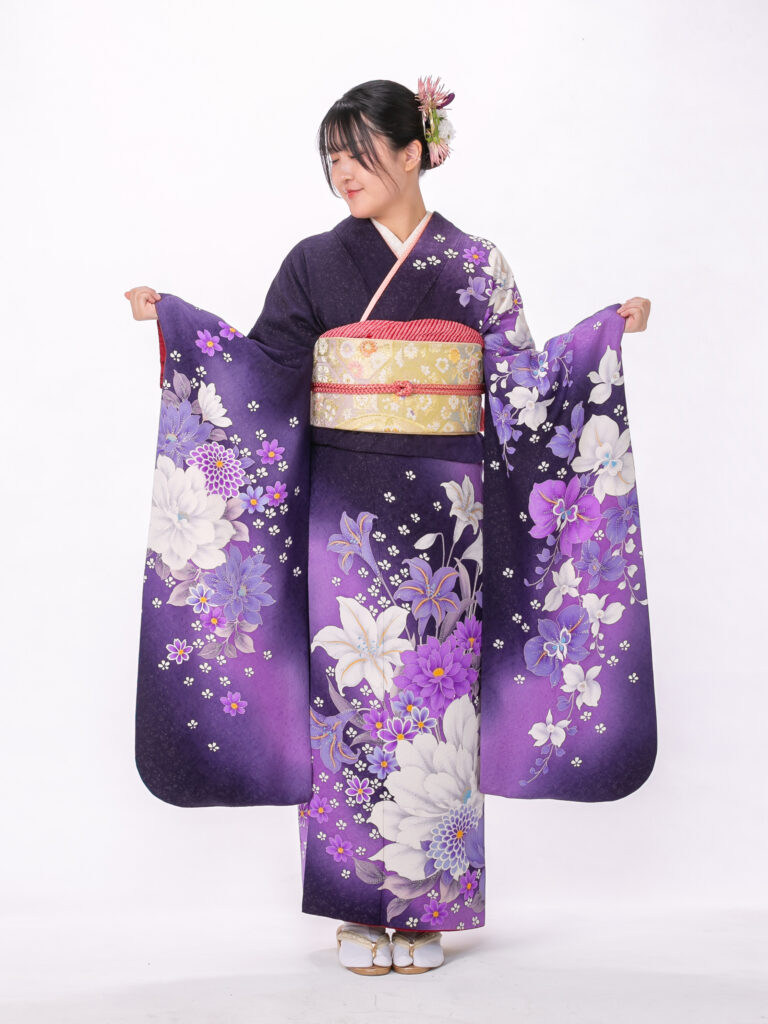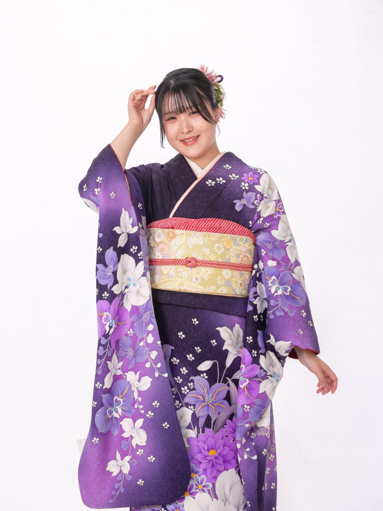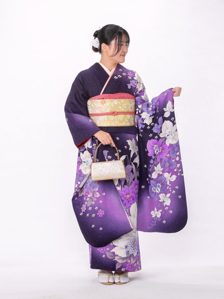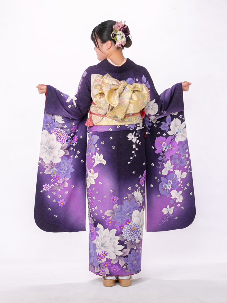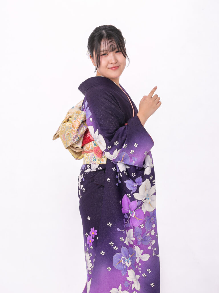 濃淡のある紫に大きく描かれた 花々が華やかさを演出する振袖。 繊細かつ大胆なデザインは 大人への第一歩を感じさせます。