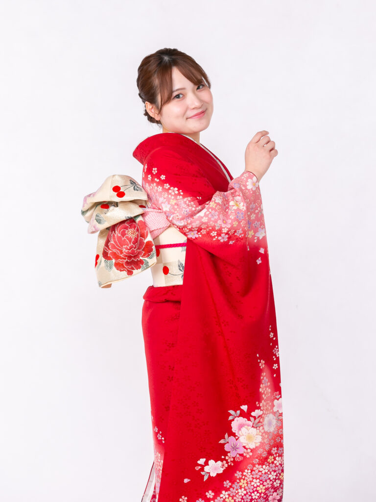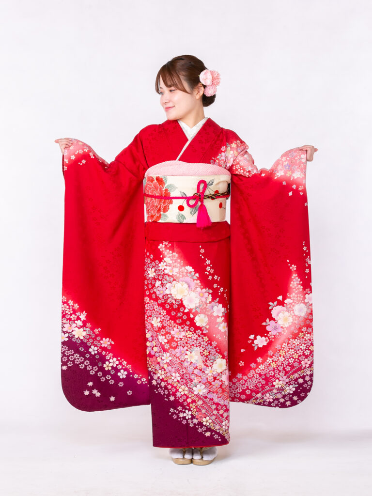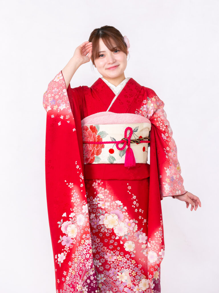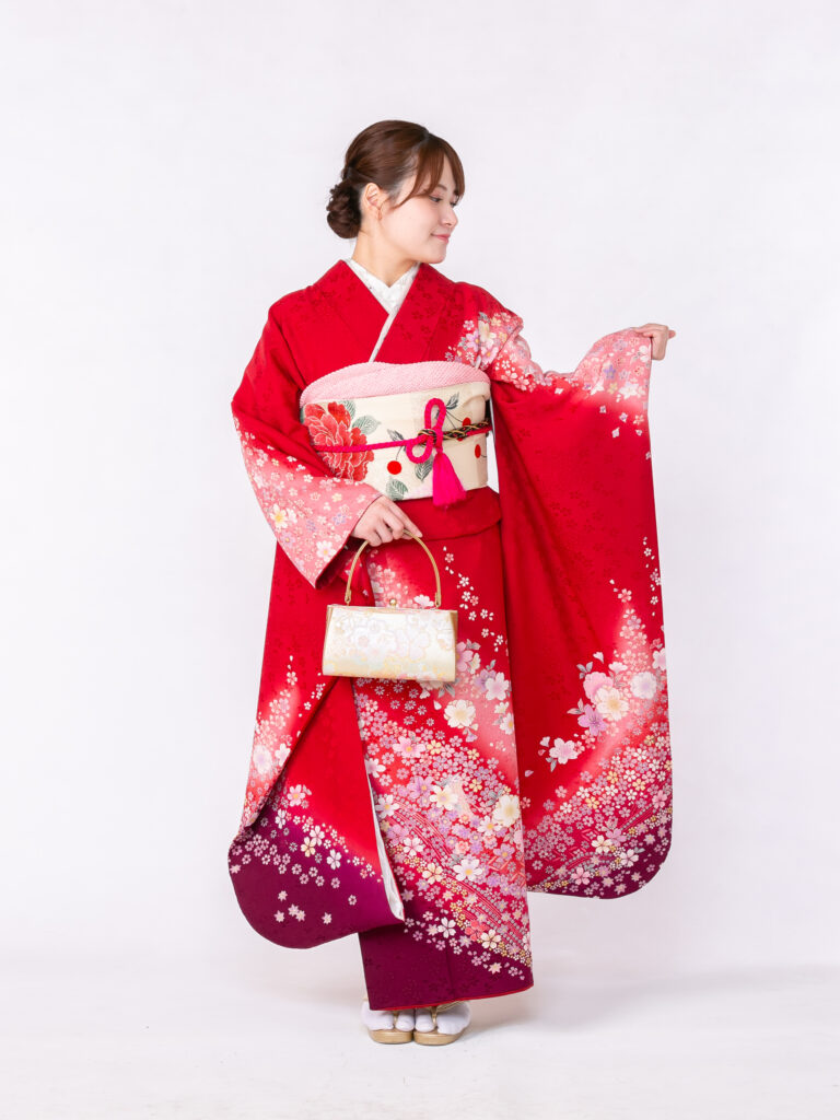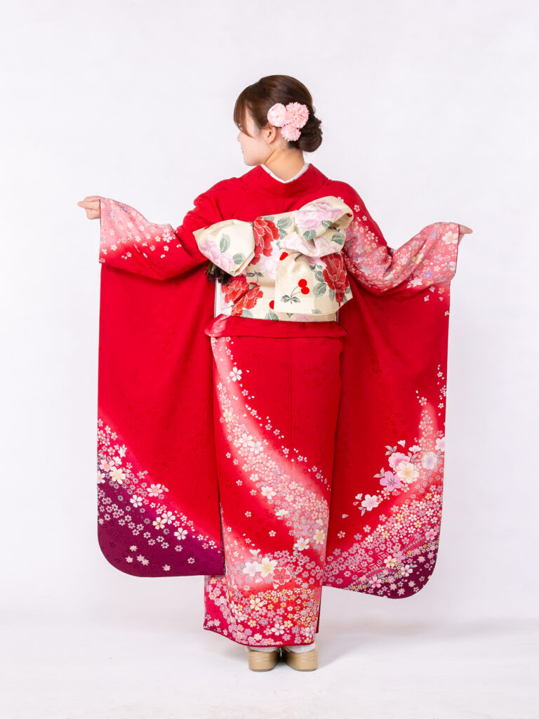 赤をベースに優しい色の 花々が際立つ振袖。 小さな花模様が可憐で 愛らしい雰囲気を感じさせます。