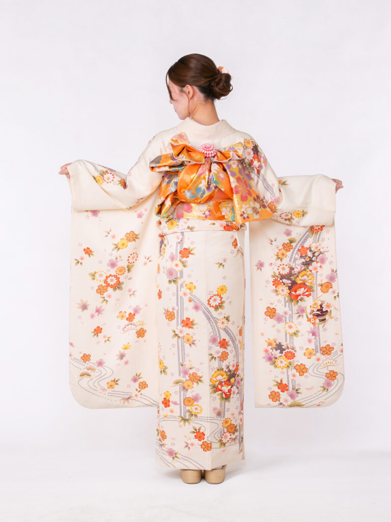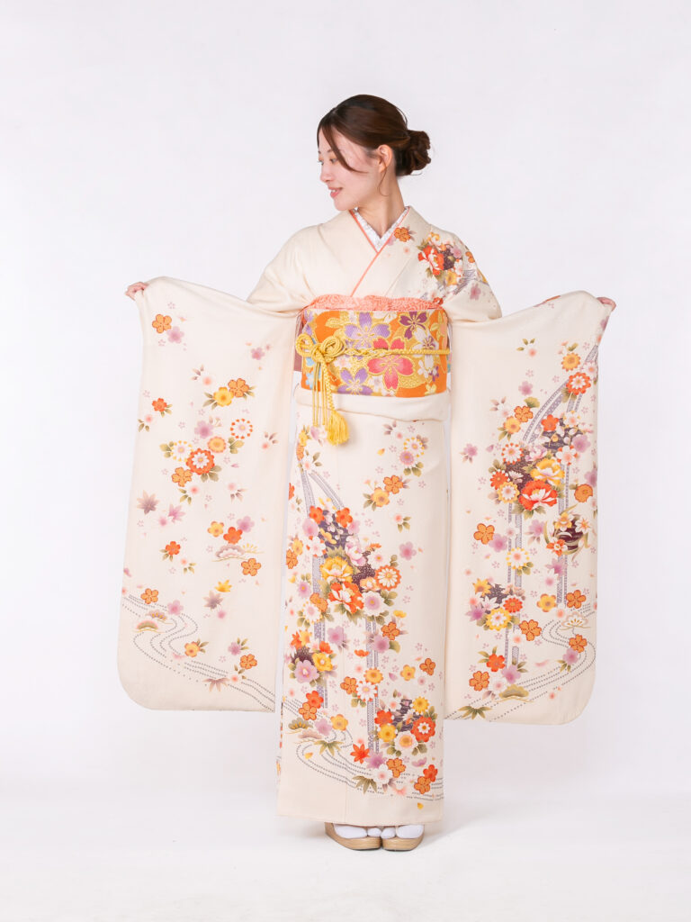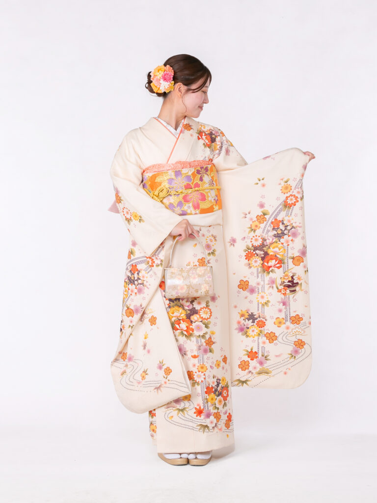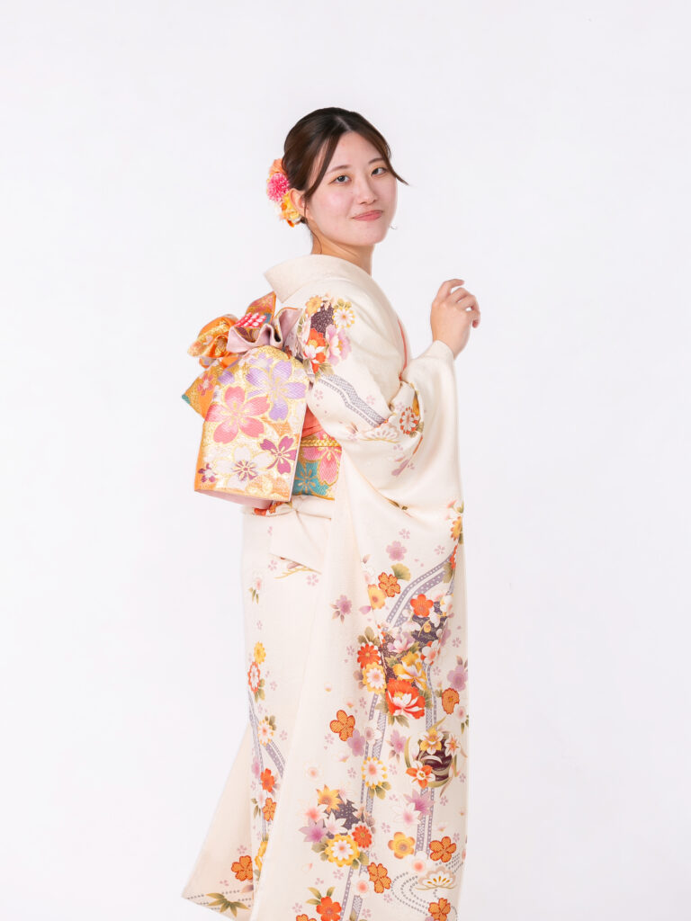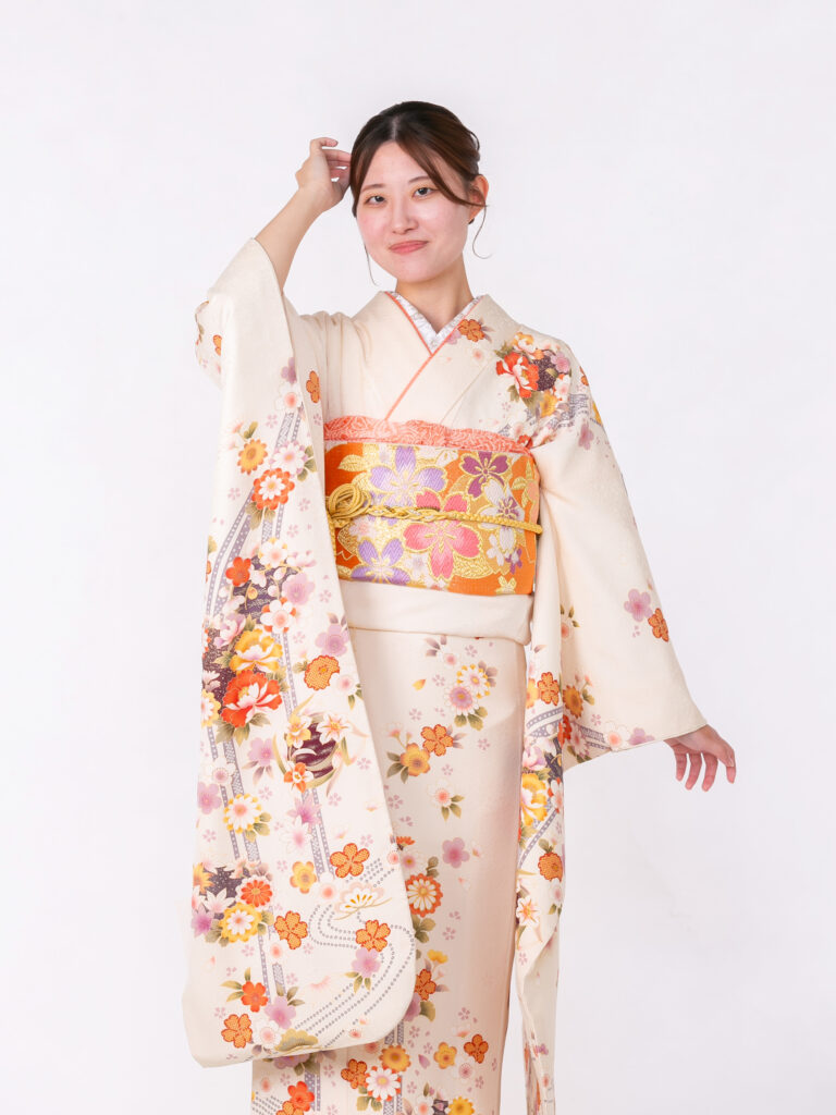 柔らかな生成り地に 四季の花々が流れるような振袖。 優しい色の重なりが 可憐さと清楚な雰囲気を表現します。