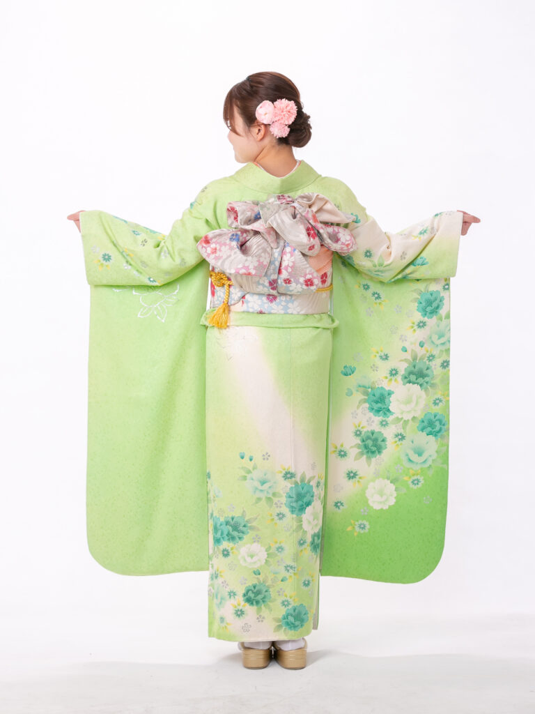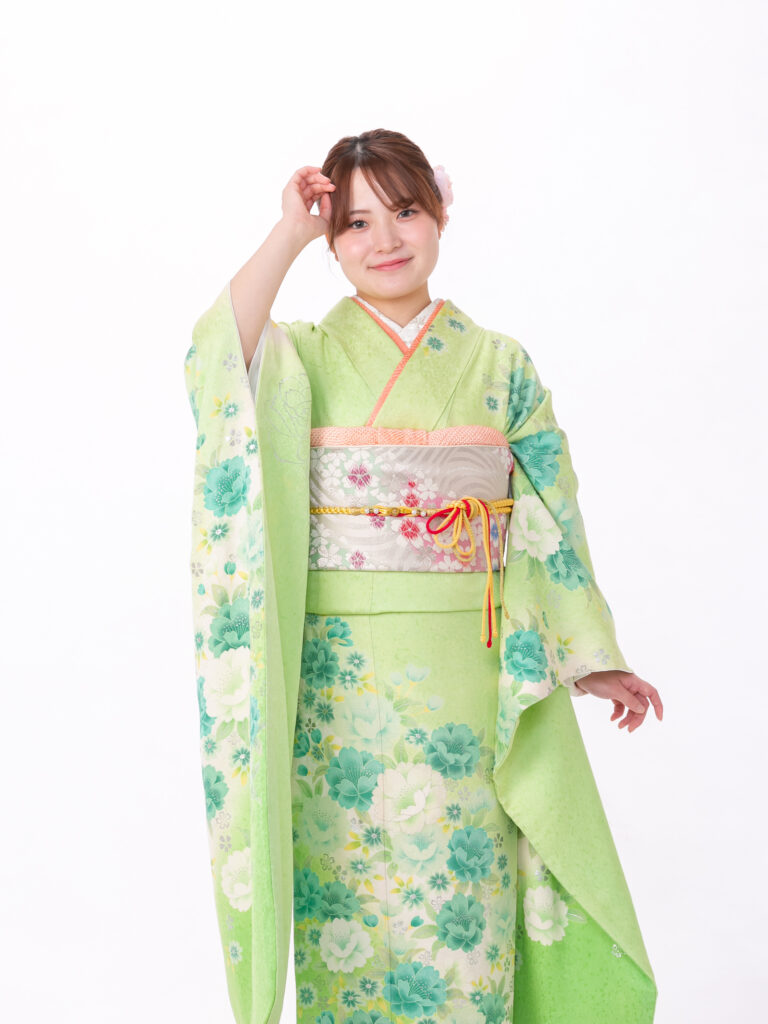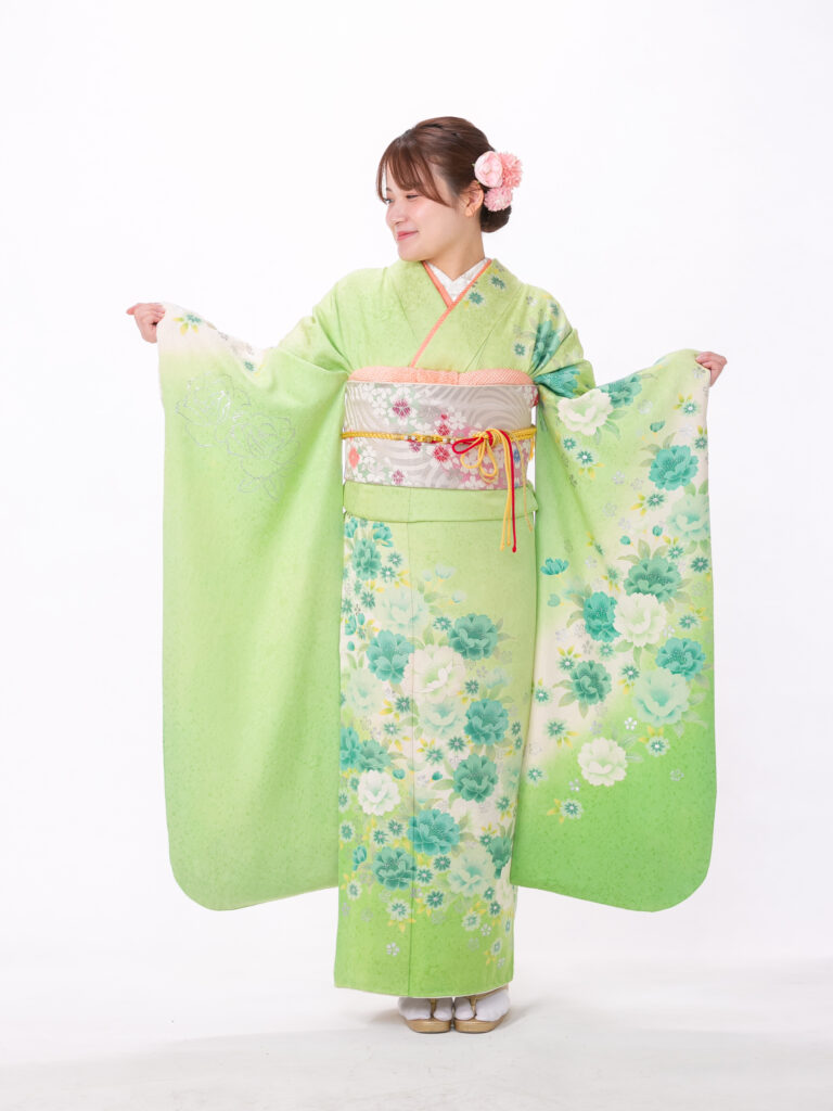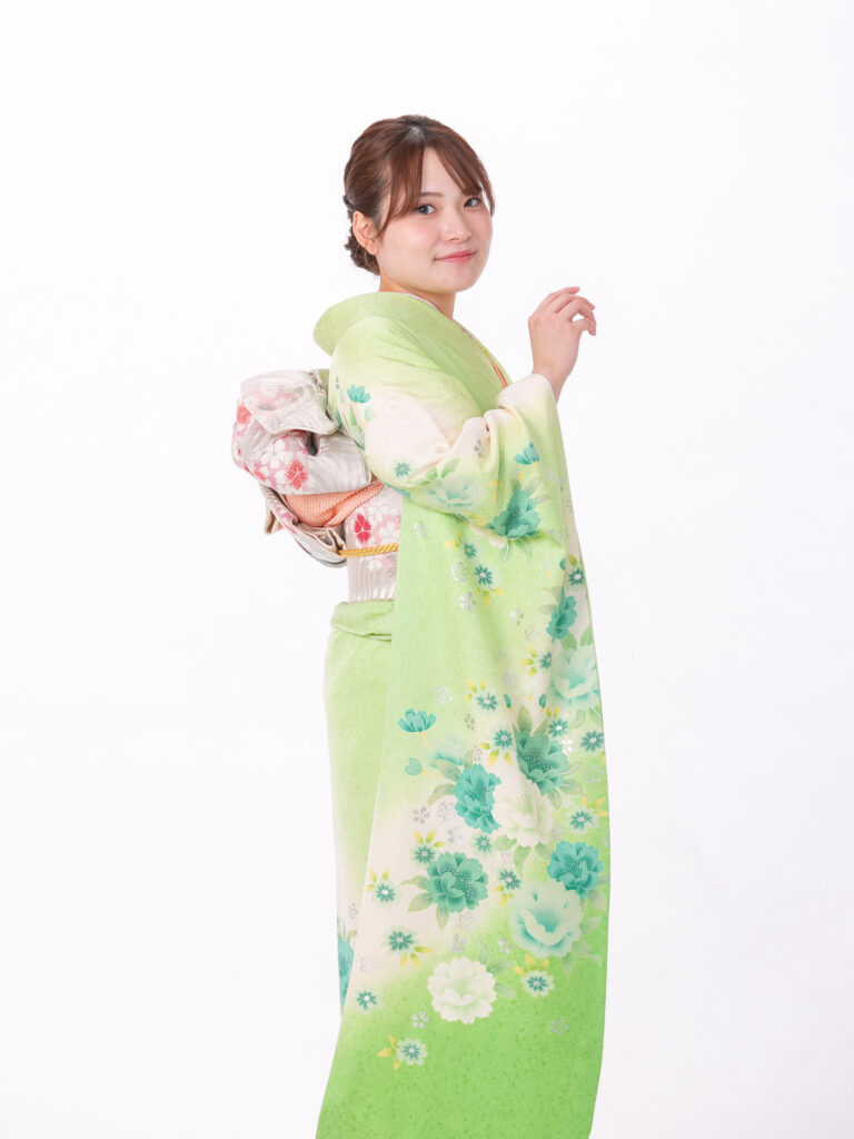 春の訪れを感じさせるような 鮮やかな黄緑色が美しい振袖。 淡い桜模様と裾や袖に咲き誇る 牡丹や菊などの花々が可憐で愛らしい雰囲気。