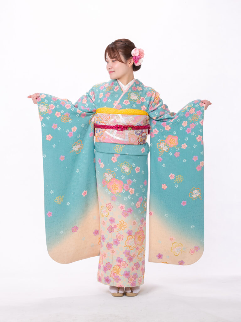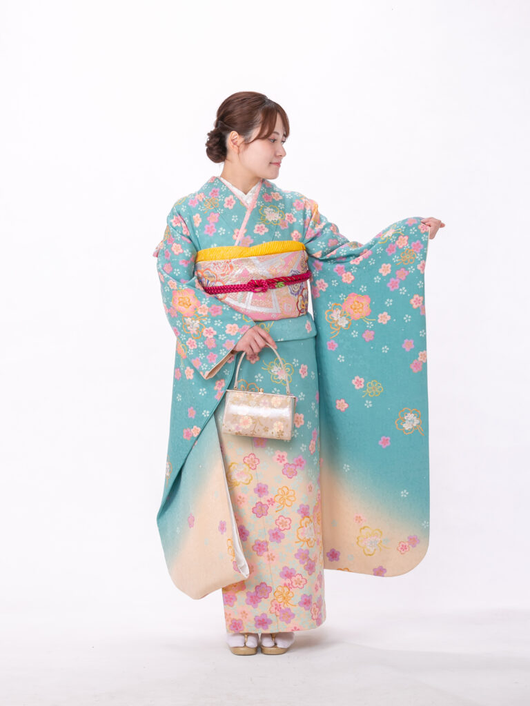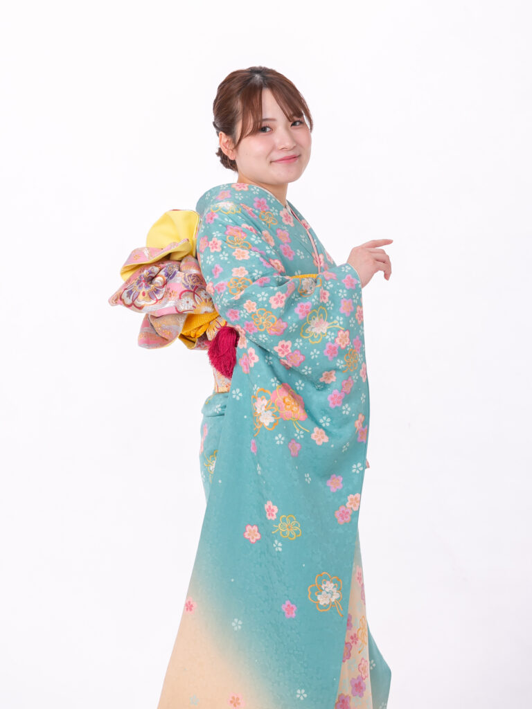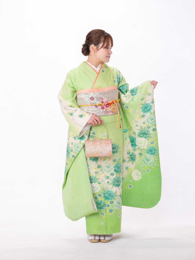 春の訪れを感じさせるような 鮮やかな黄緑色が美しい振袖。 淡い桜模様と裾や袖に咲き誇る 牡丹や菊などの花々が可憐で愛らしい雰囲気。