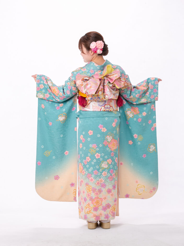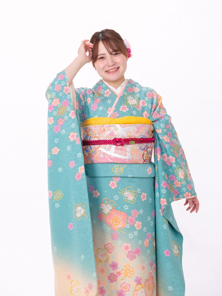 透き通るようなスカイブルーと 淡い花々が印象的な振袖。 桃色の小花が全面に散りばめられ 顔周りを明るく見せてくれます。