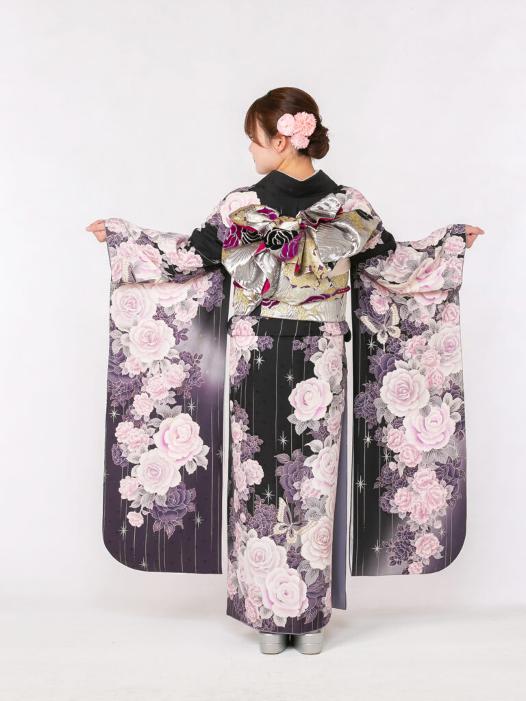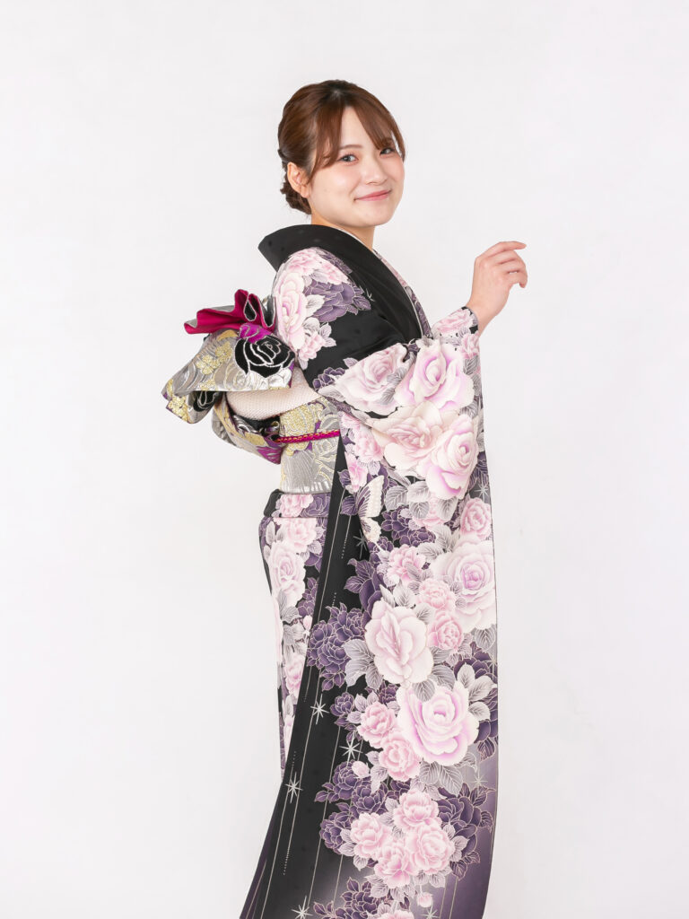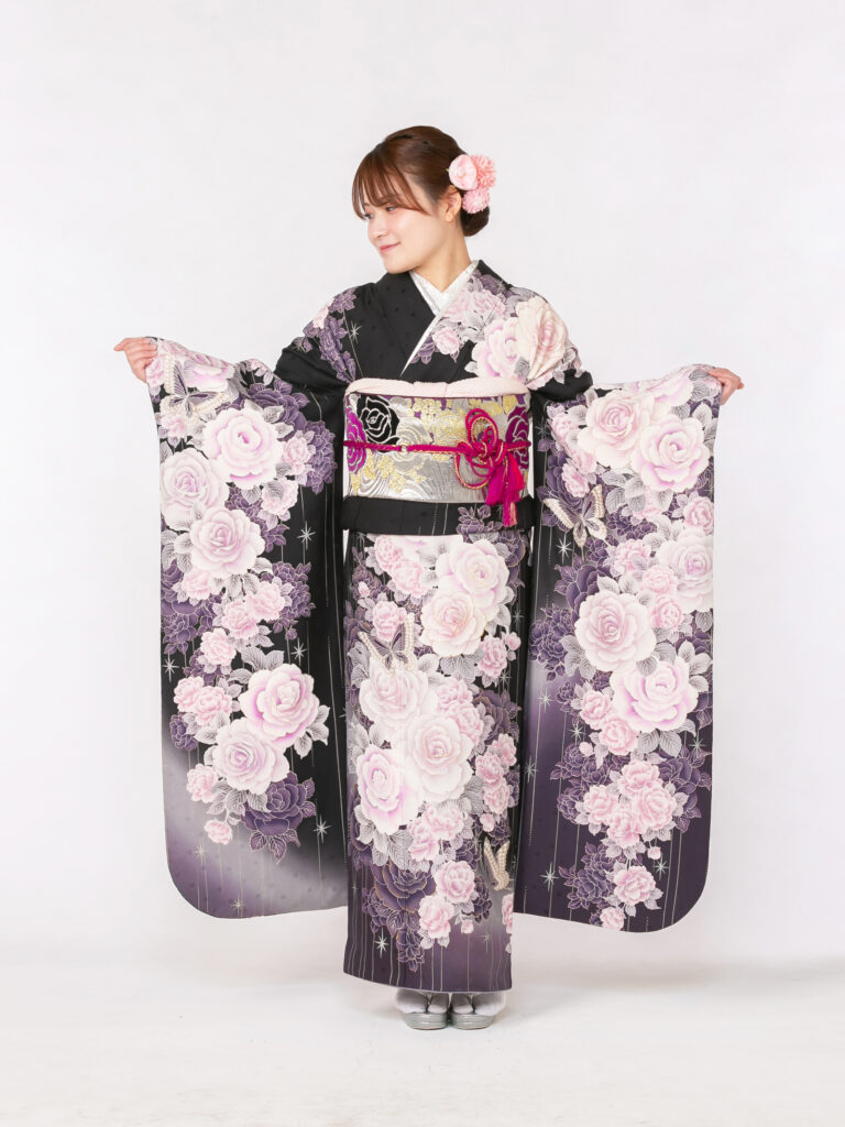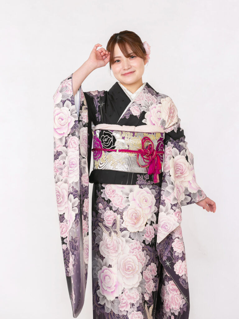 深い黒地に鮮やかなピンク色の大きな薔薇が 豪華でモダンな雰囲気の振袖です。 全体に施された大胆な花々が 華やかで情熱的な印象を与えます。