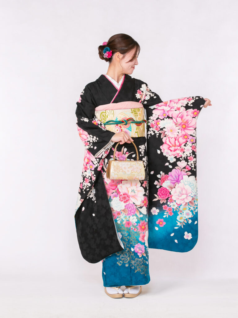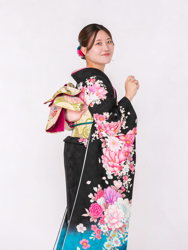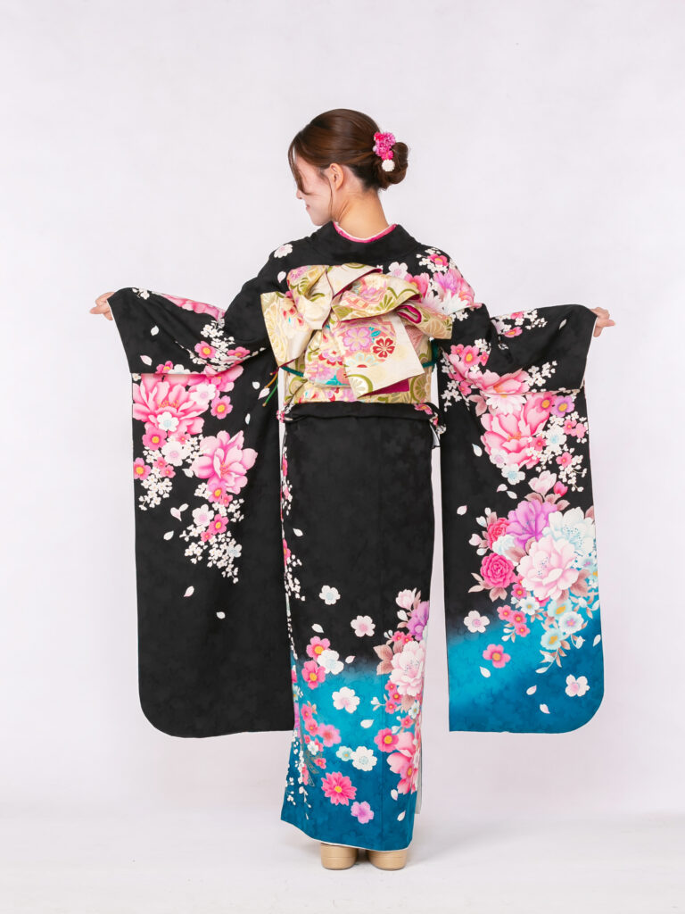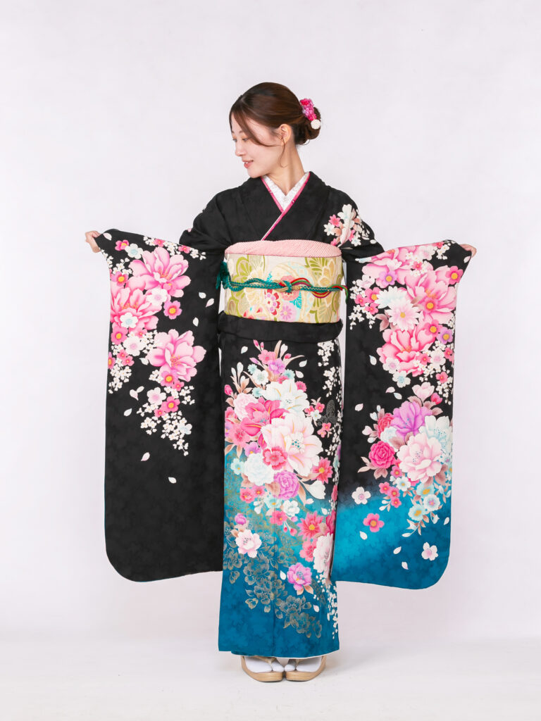 深い黒地にビビッドなブルーが 組み合わされた大胆な色彩が特徴の振袖。 女性らしいピンクや白の大輪の花々が 豪華かつ洗練された印象を演出します。