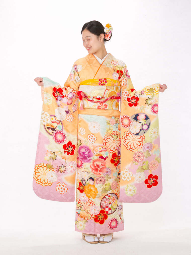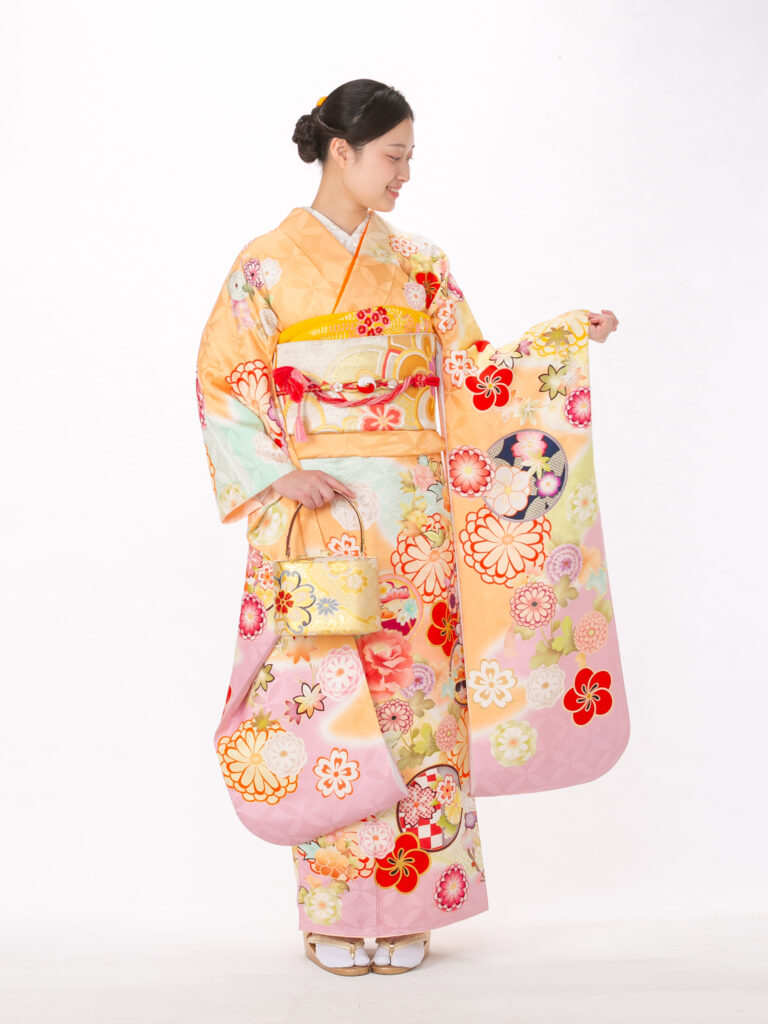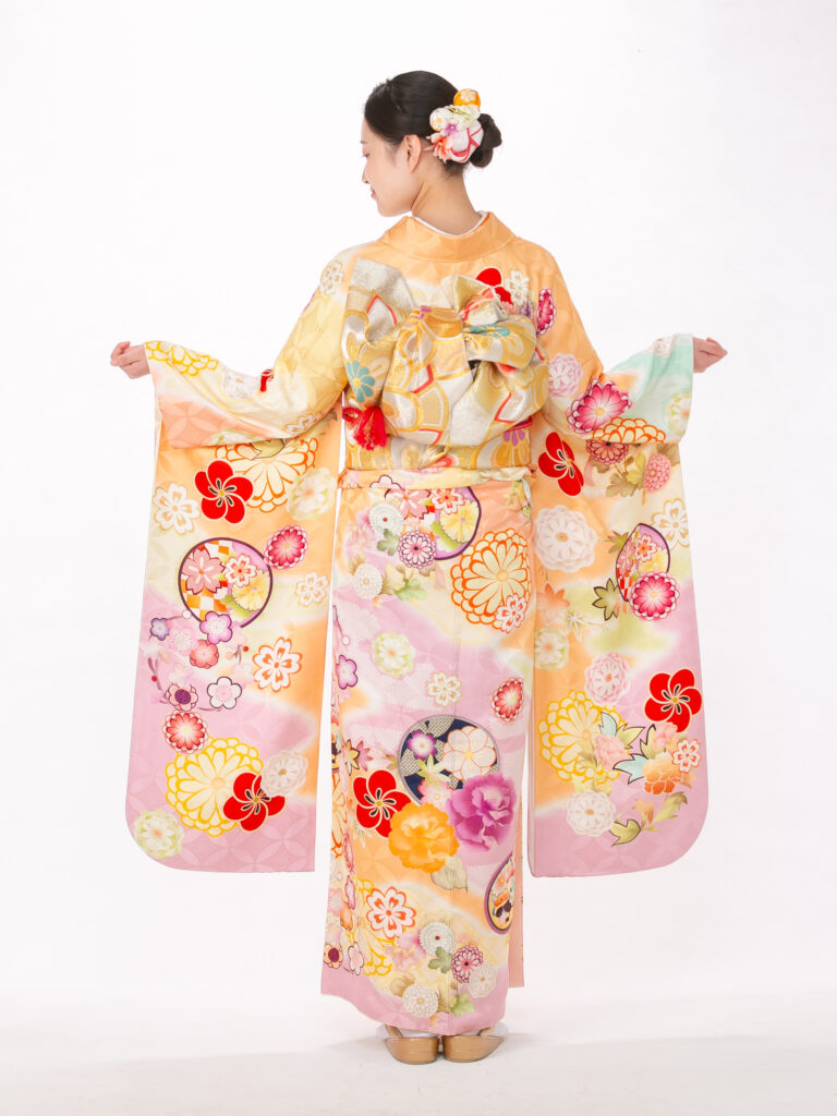 肌なじみの良い明るい地色と、 王道の古典柄による写真映えする振袖。 可愛らしいピンクへの美しいぼかしと 淡い花模様が優しい雰囲気を演出します。