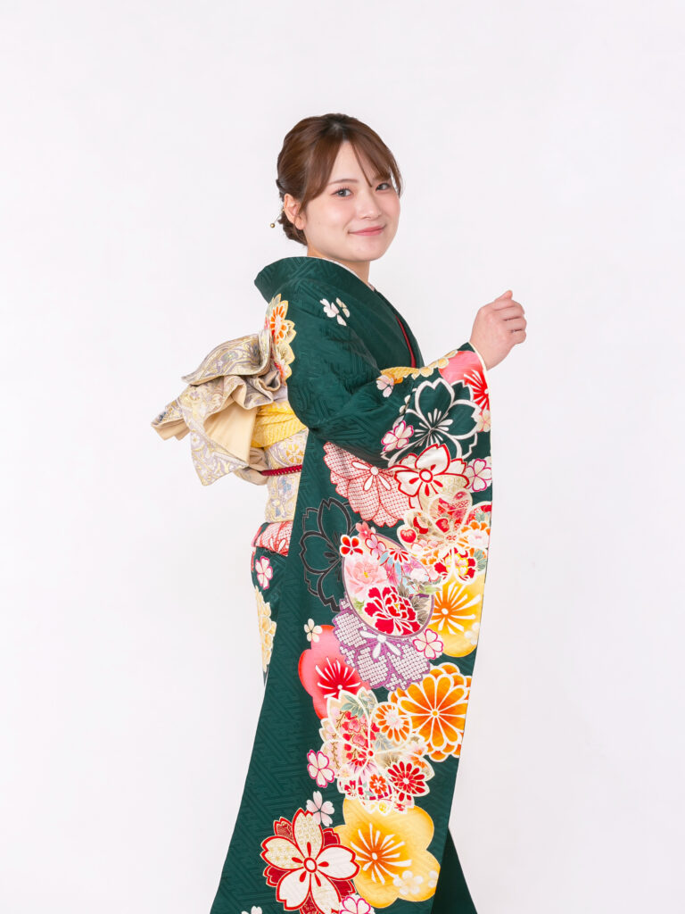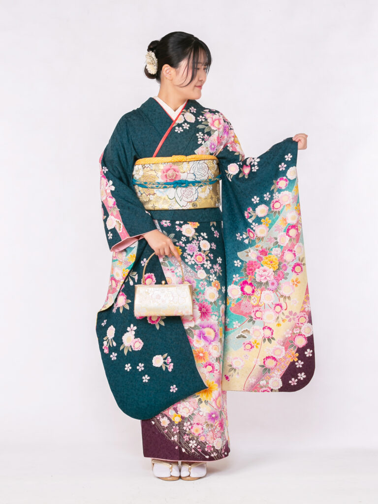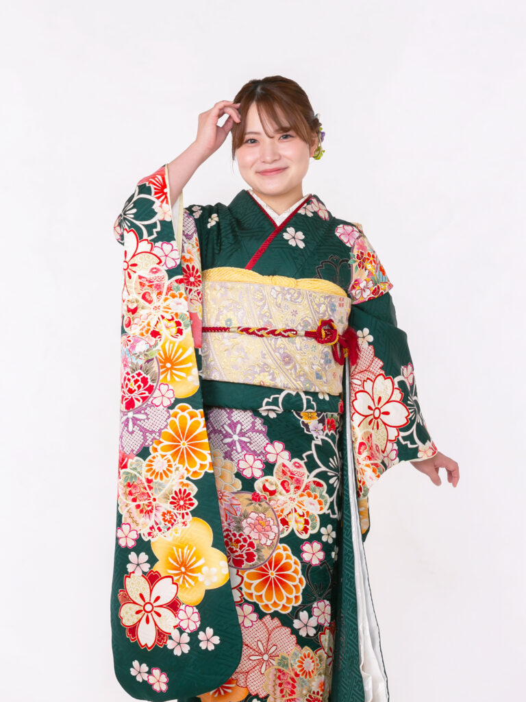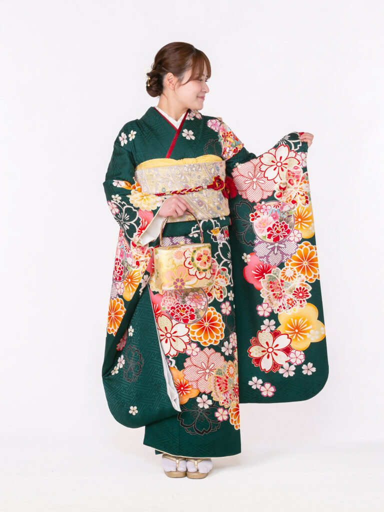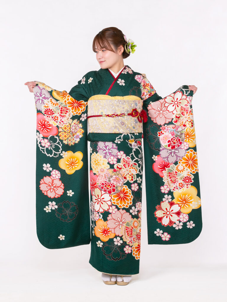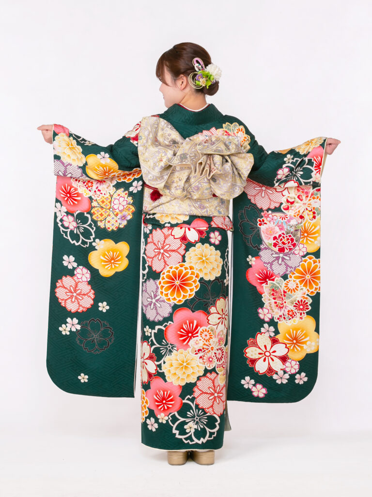 深い緑色の地に、桜や牡丹、菊などの 吉祥文様が特徴の振袖。 赤やオレンジの鮮やかな花々は 緑とのコントラストで一層際立ちます。