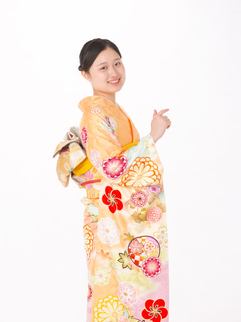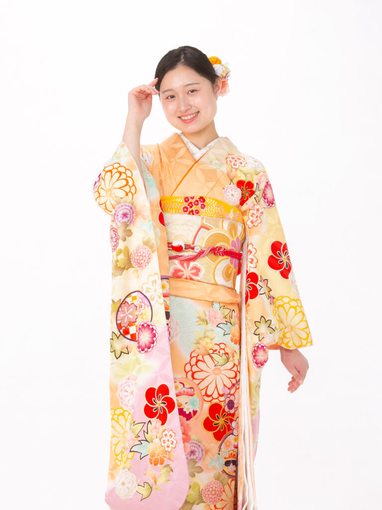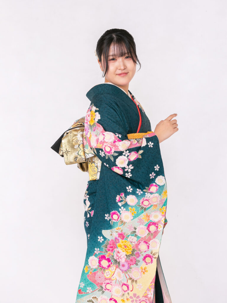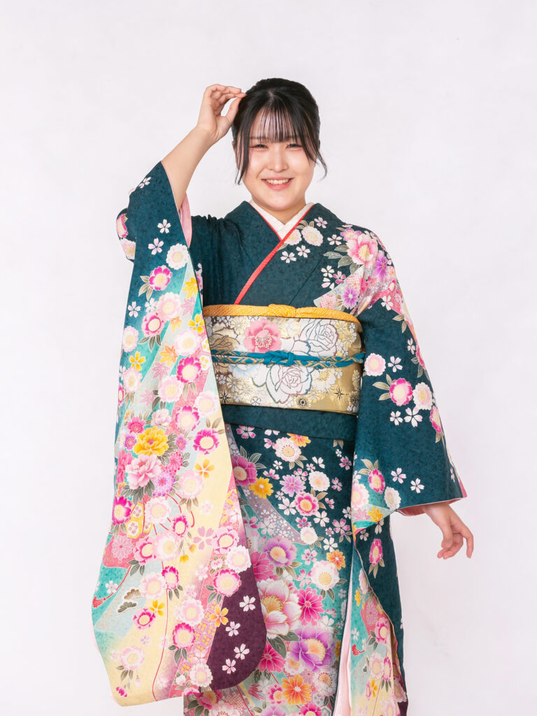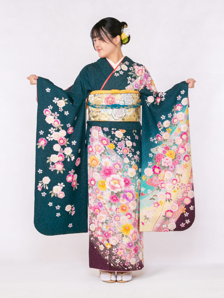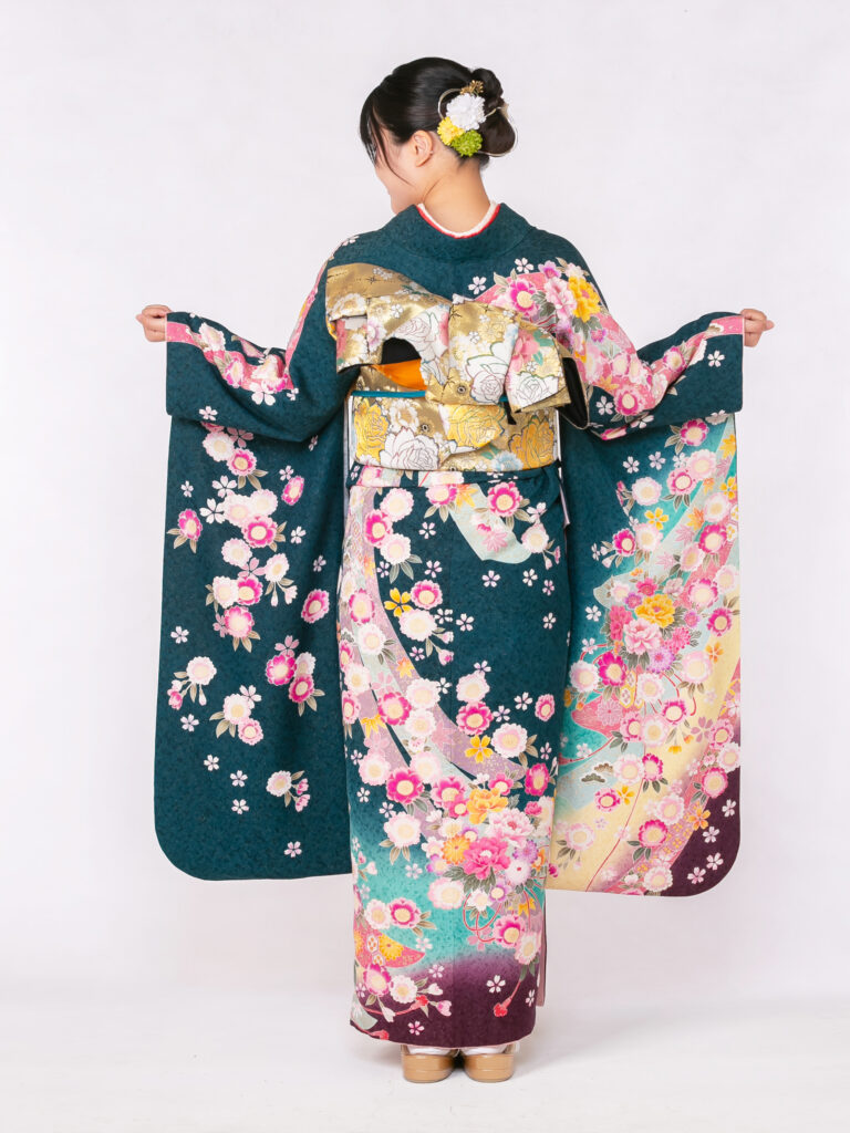 深い緑色の地に、桜や牡丹、菊などの 吉祥文様が特徴の振袖。 赤やオレンジの鮮やかな花々は 緑とのコントラストで一層際立ちます。