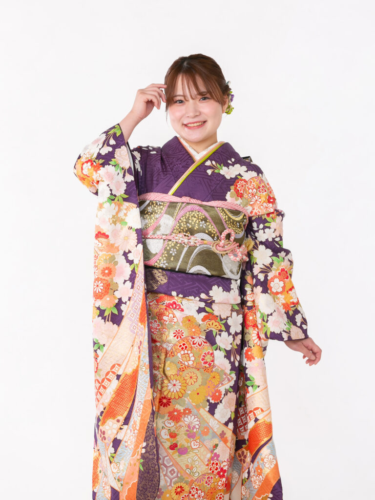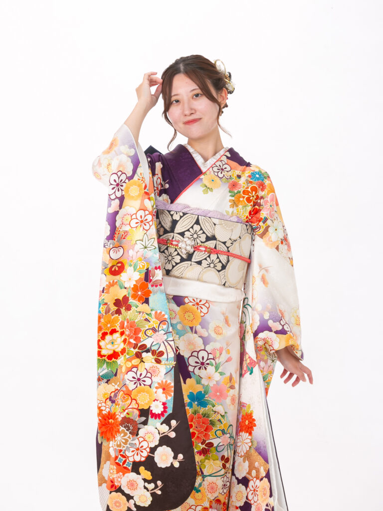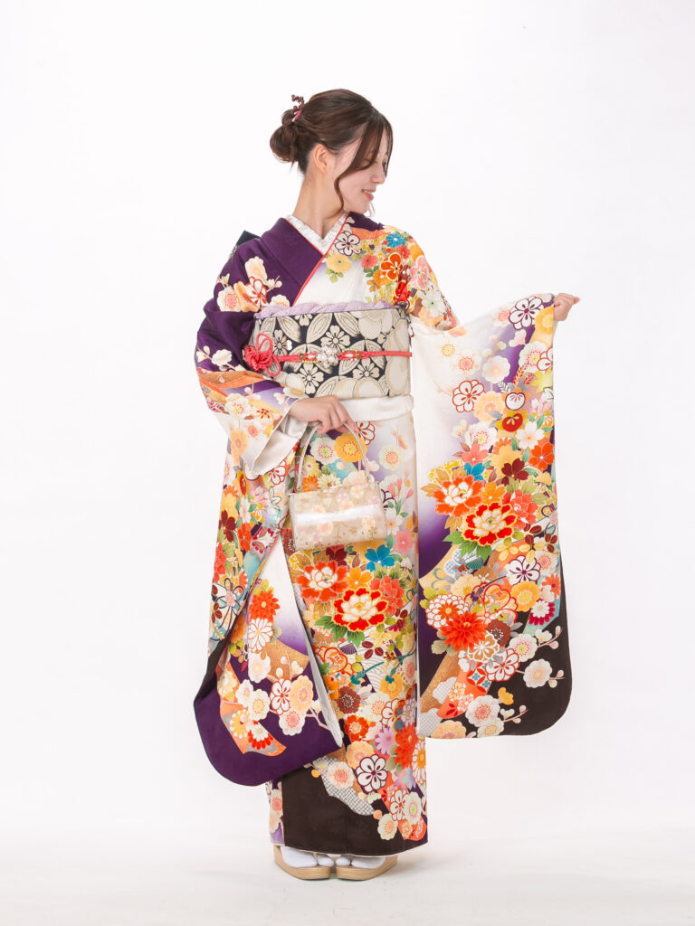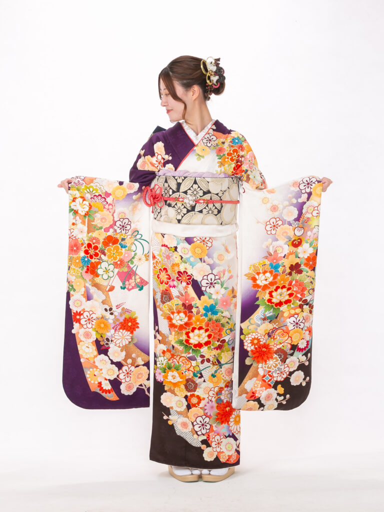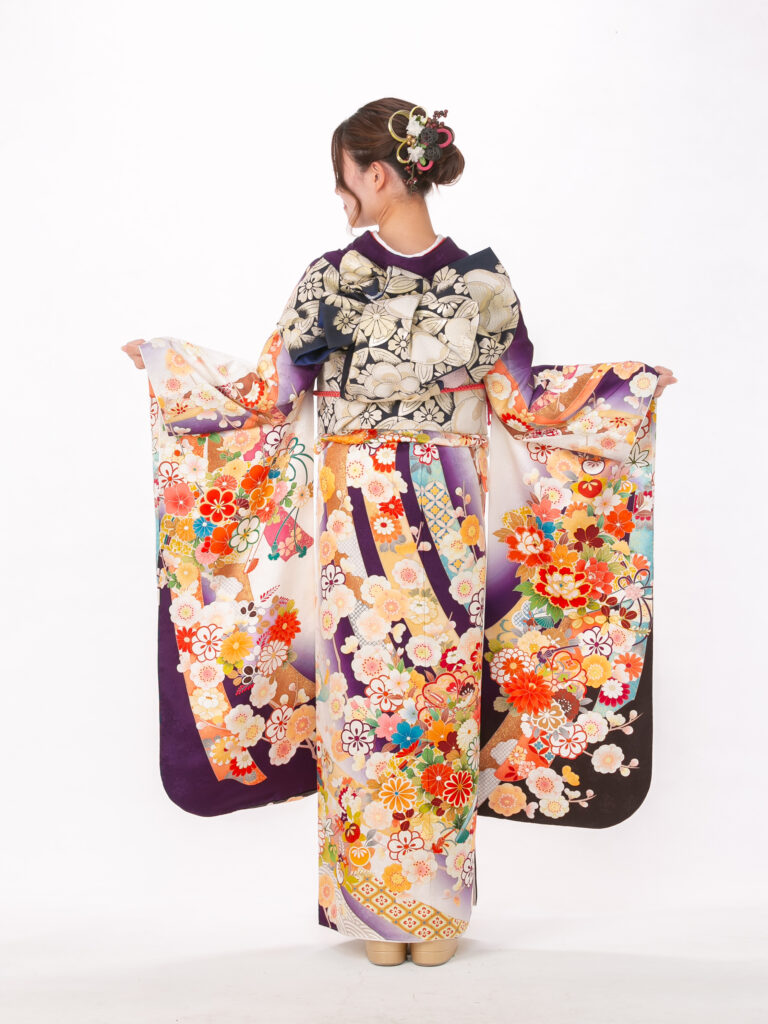 白と紫を基調とした現代的な色使いと 豪華な古典柄が特徴的な振袖。 古典柄と鮮やかなオレンジや黄色の花々が アクセントとなり、現代的でおしゃれな印象。