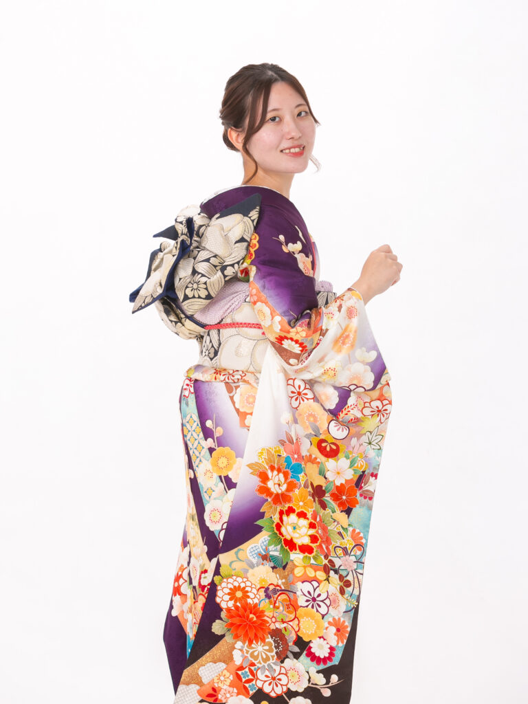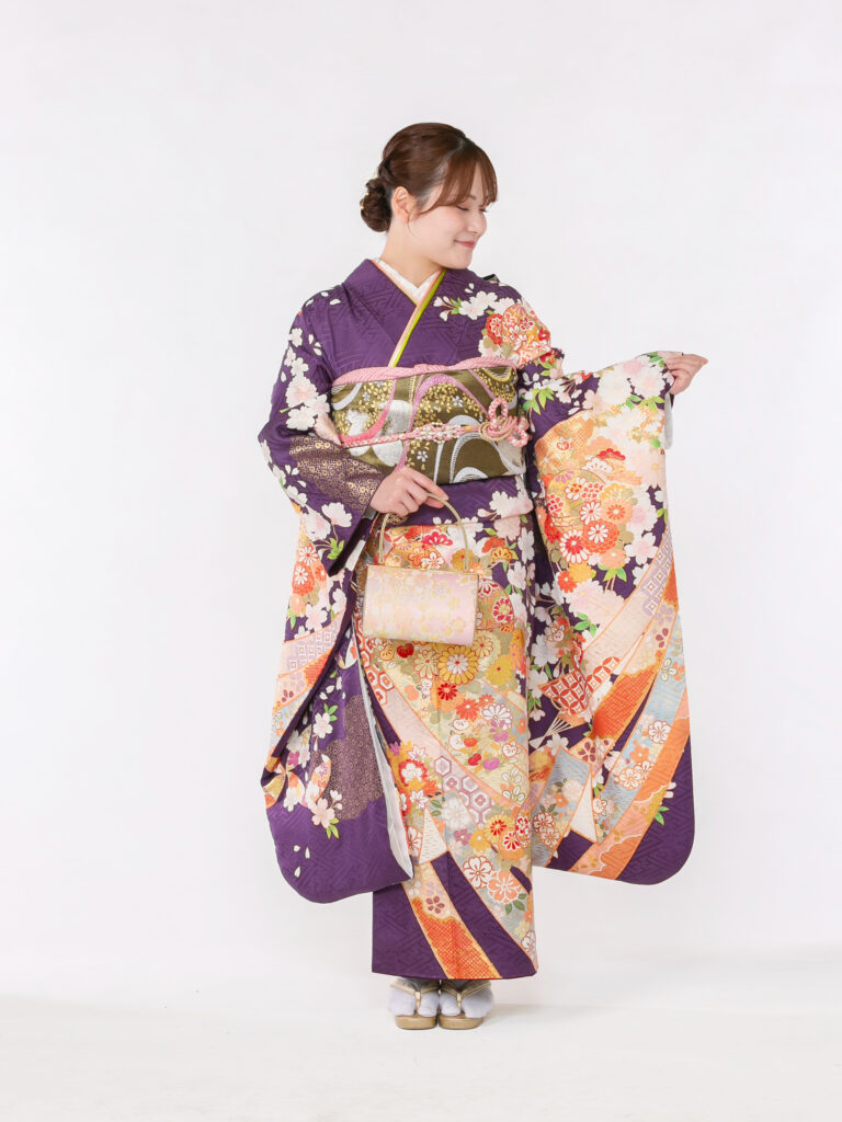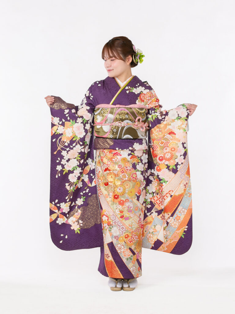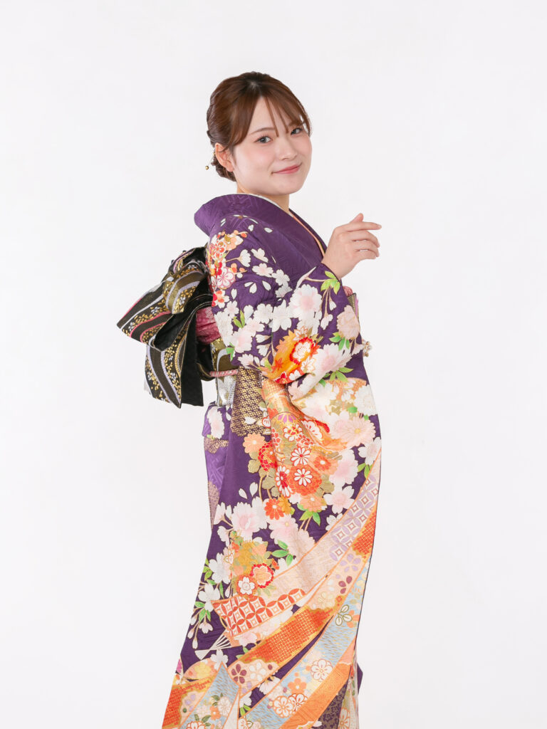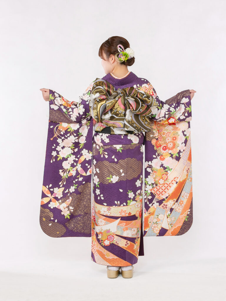 深い紫色を地色に桜や牡丹など 花々が豪華に描かれた振袖です。 肩から背中にかけて熨斗の文様が 流れのように描かれた古典的な一着。