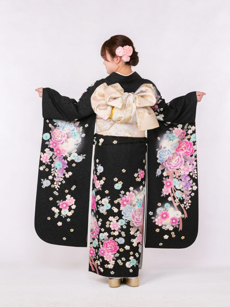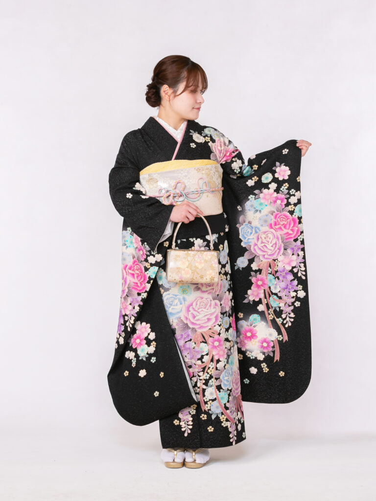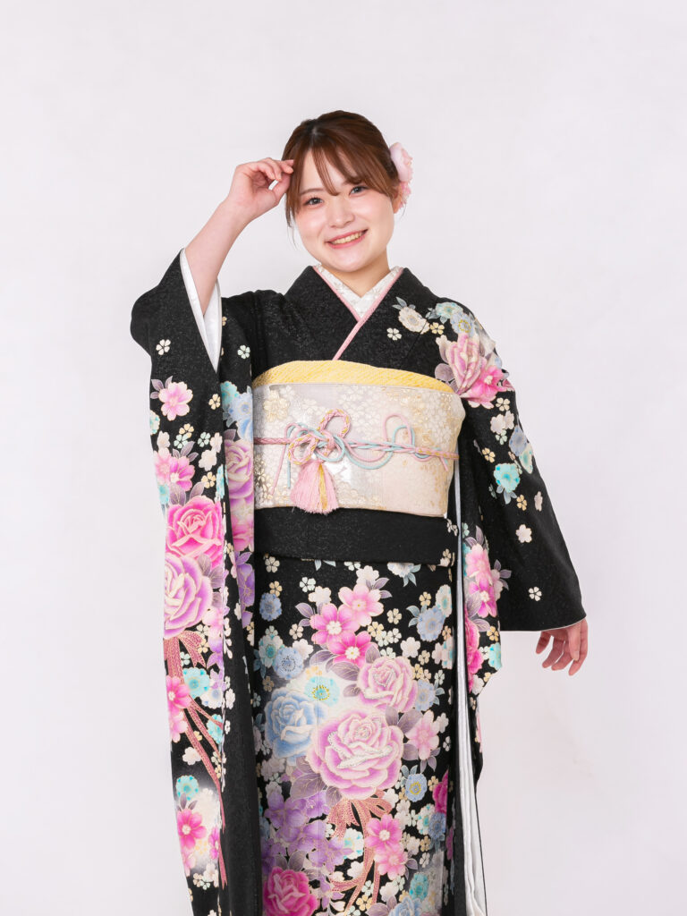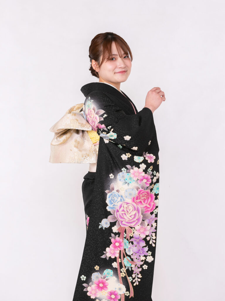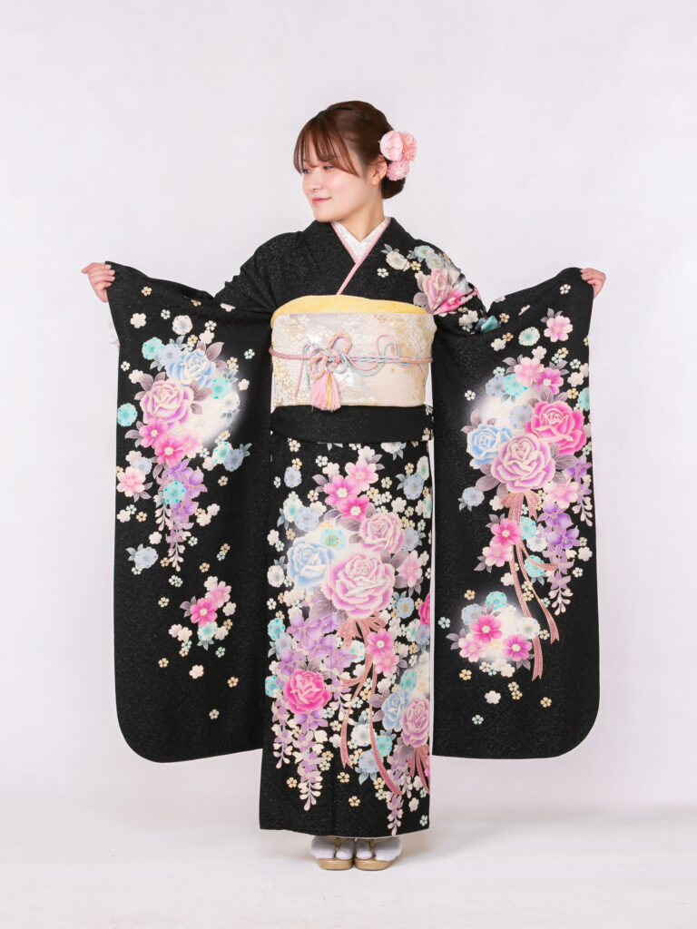 大人らしさを感じさせる黒地に 鮮やかな薔薇が施された振袖。 大胆に描かれた薔薇の花々は 見る人の目を惹くデザイン。