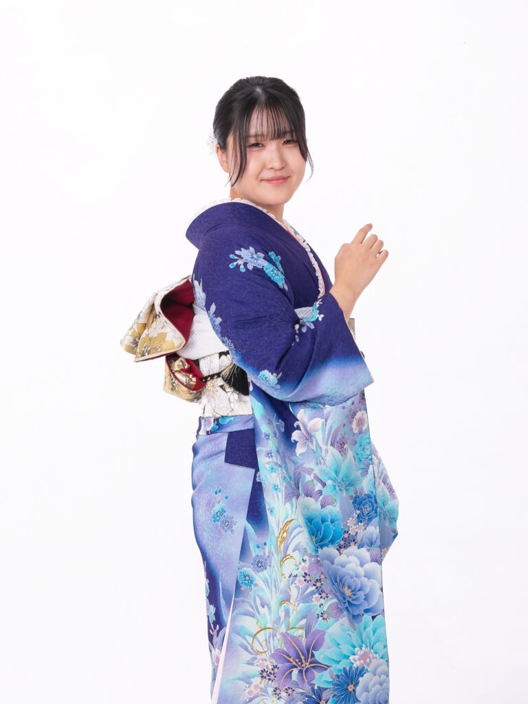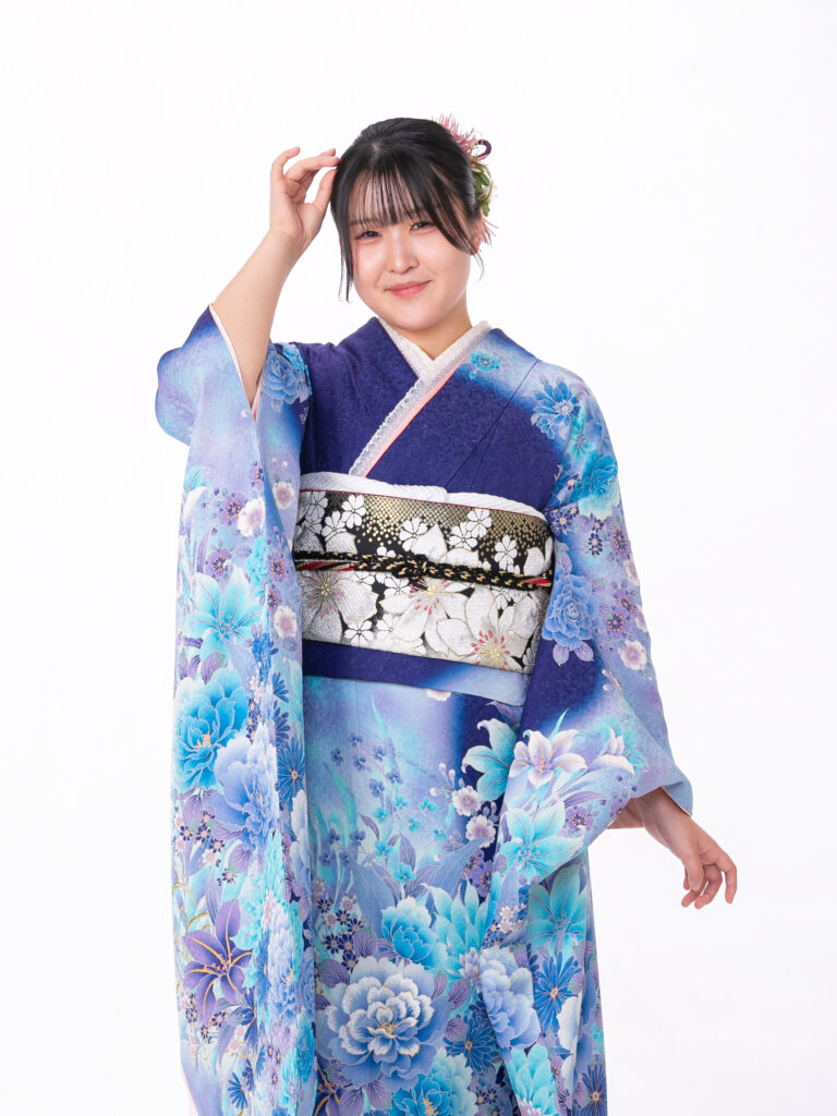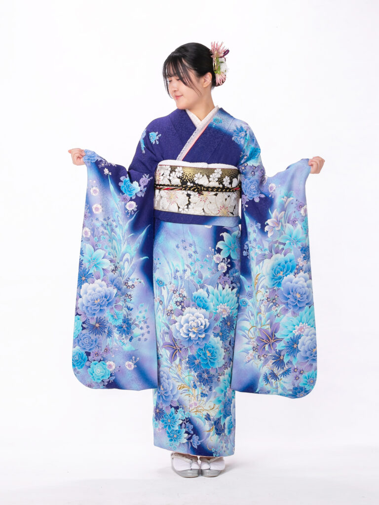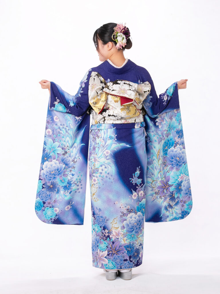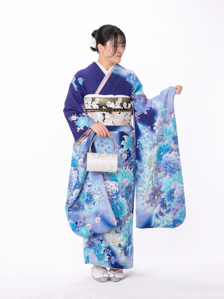紺色から裾に向かって淡い水色へと ぼかし染めされた青系の振袖。 青や紫といったクールな色合いで統一され 神秘的で透明感あふれる印象です。