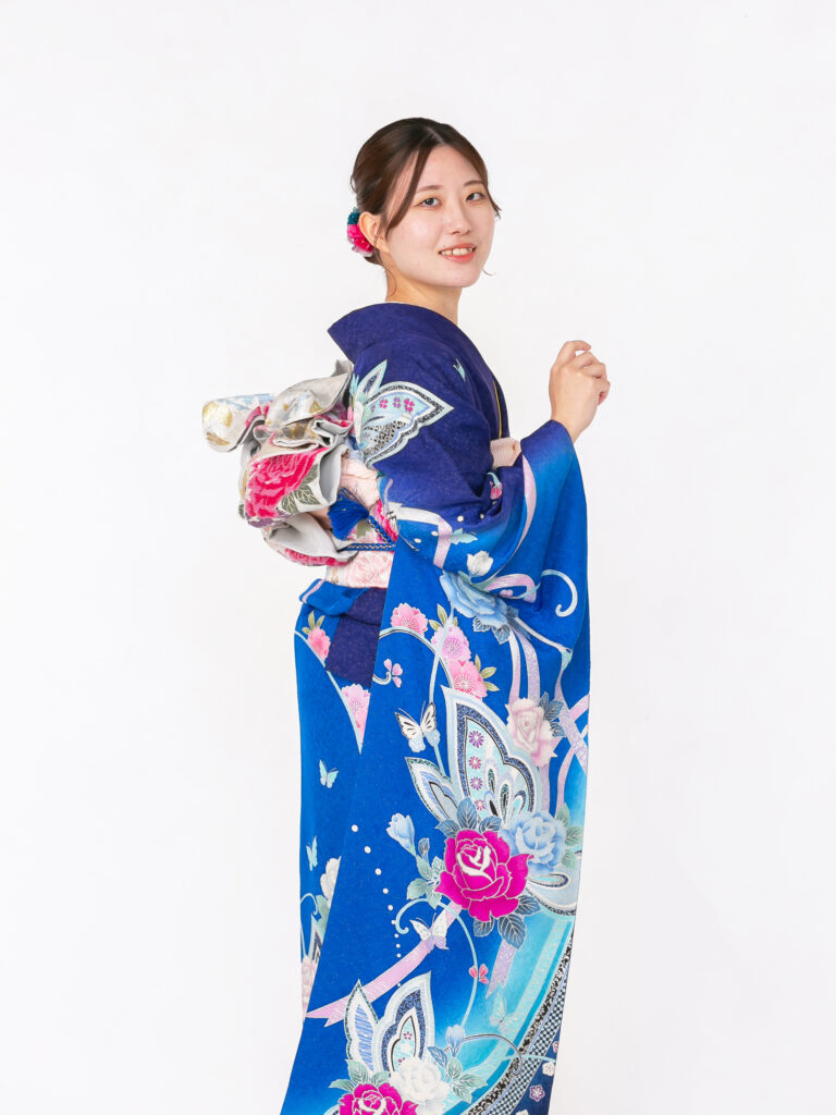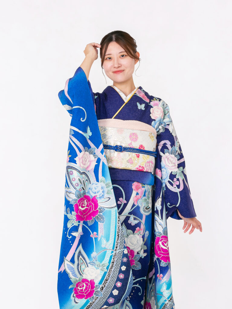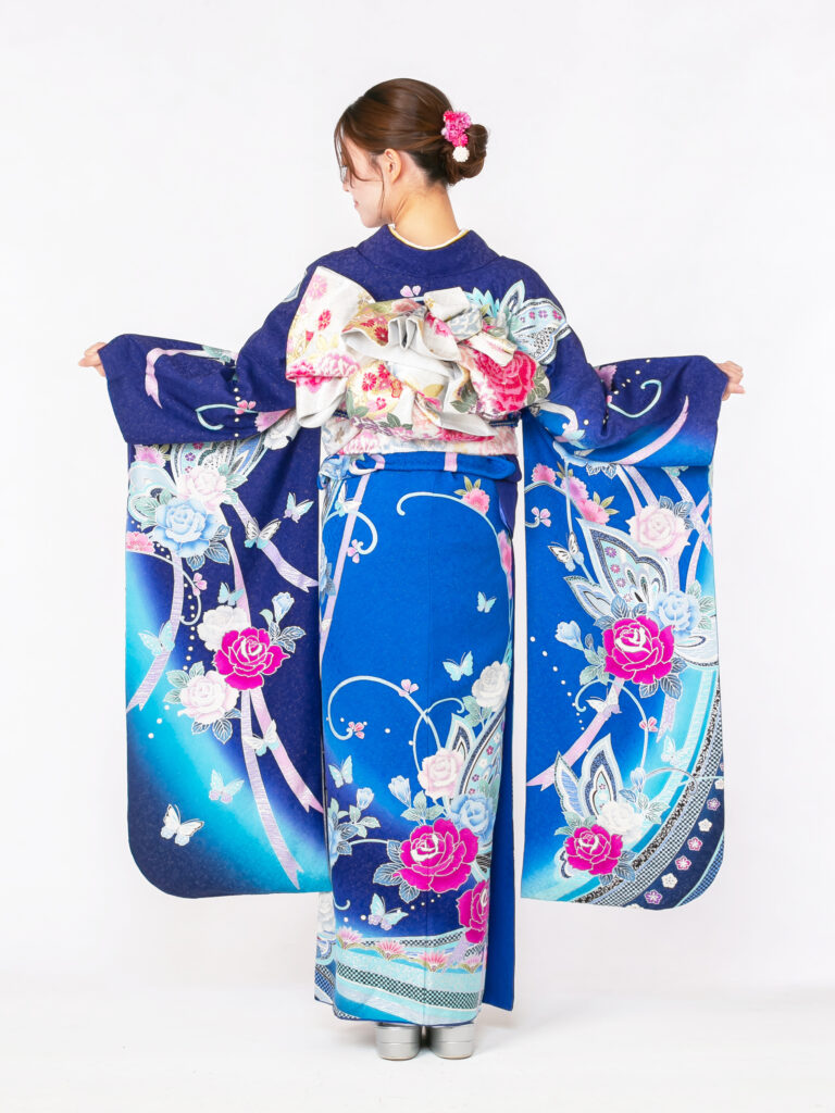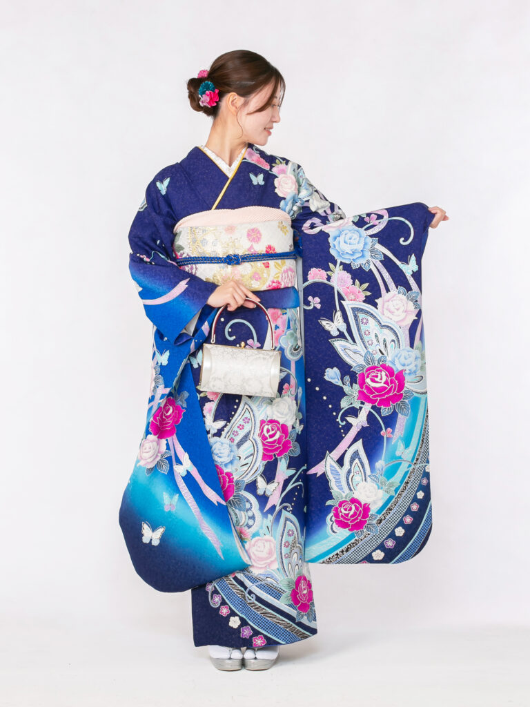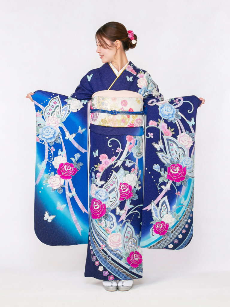 紺色の地に現代的な薔薇と蝶が描かれた モダンなデザインの振袖。 女性らしいピンクの差し色が効いた 甘すぎない大人の華やかさが魅力です。