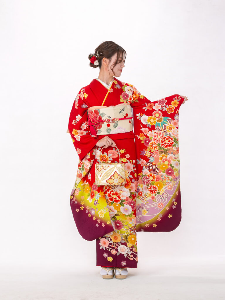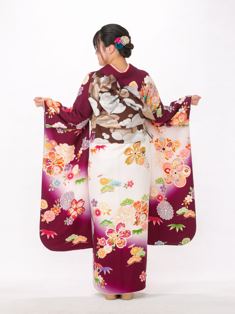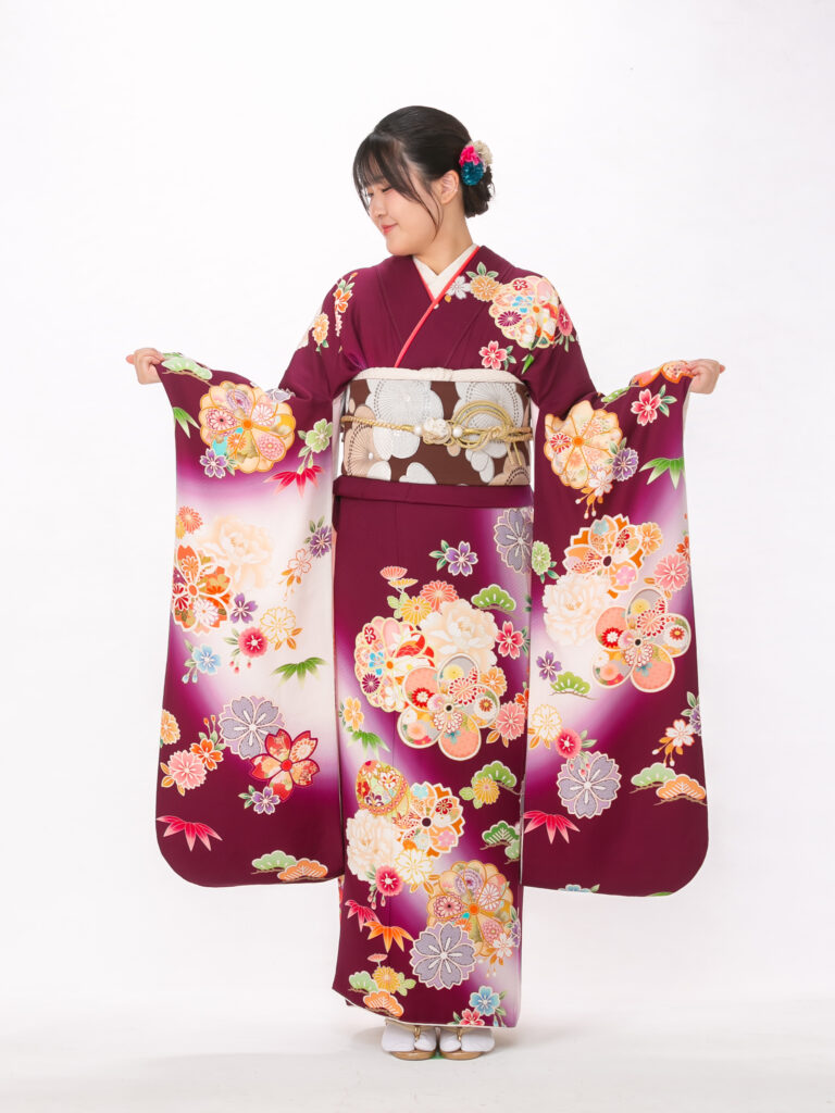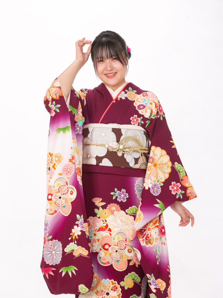 深いワインレッドが特徴的で 若々しさの中にも上品さを演出する振袖。 鮮やかな花柄と地色のコントラストが美しく、 成人式の晴れの舞台で写真映えする一着。