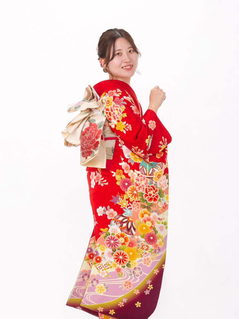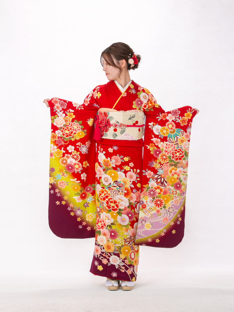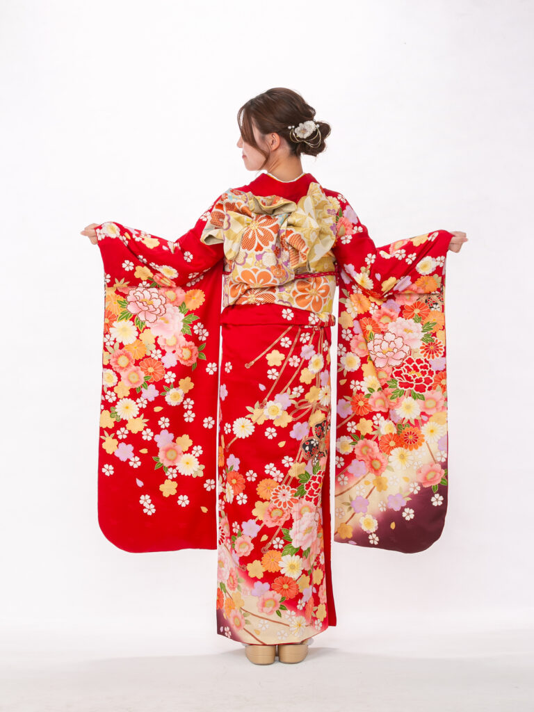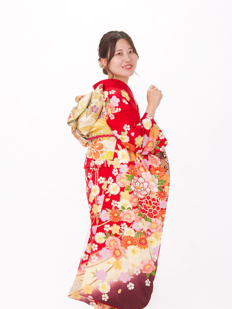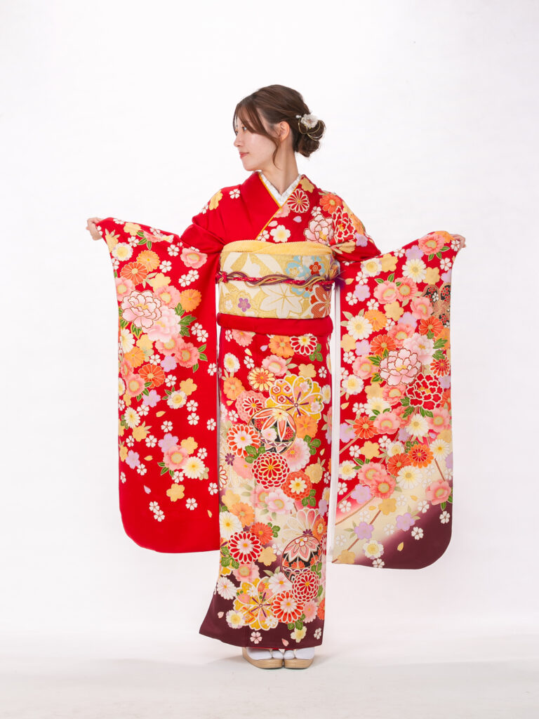 深いワインレッドが特徴的で 若々しさの中にも上品さを演出する振袖。 鮮やかな花柄と地色のコントラストが美しく、 成人式の晴れの舞台で写真映えする一着。
