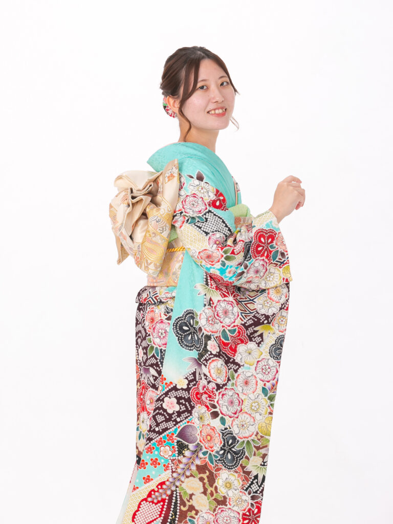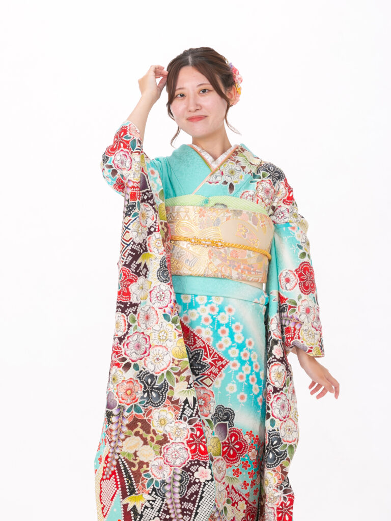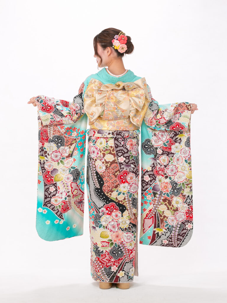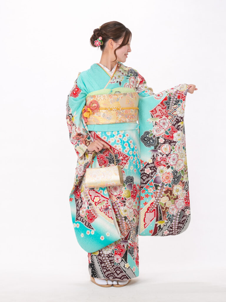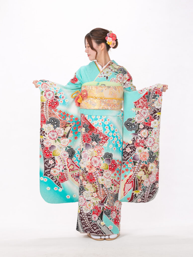 清涼感あふれる水色の地色に、 色とりどりの古典柄をあしらった振袖。 一枚の絵のように繋がる絵羽模様は、 振袖の格の高さを象徴します。