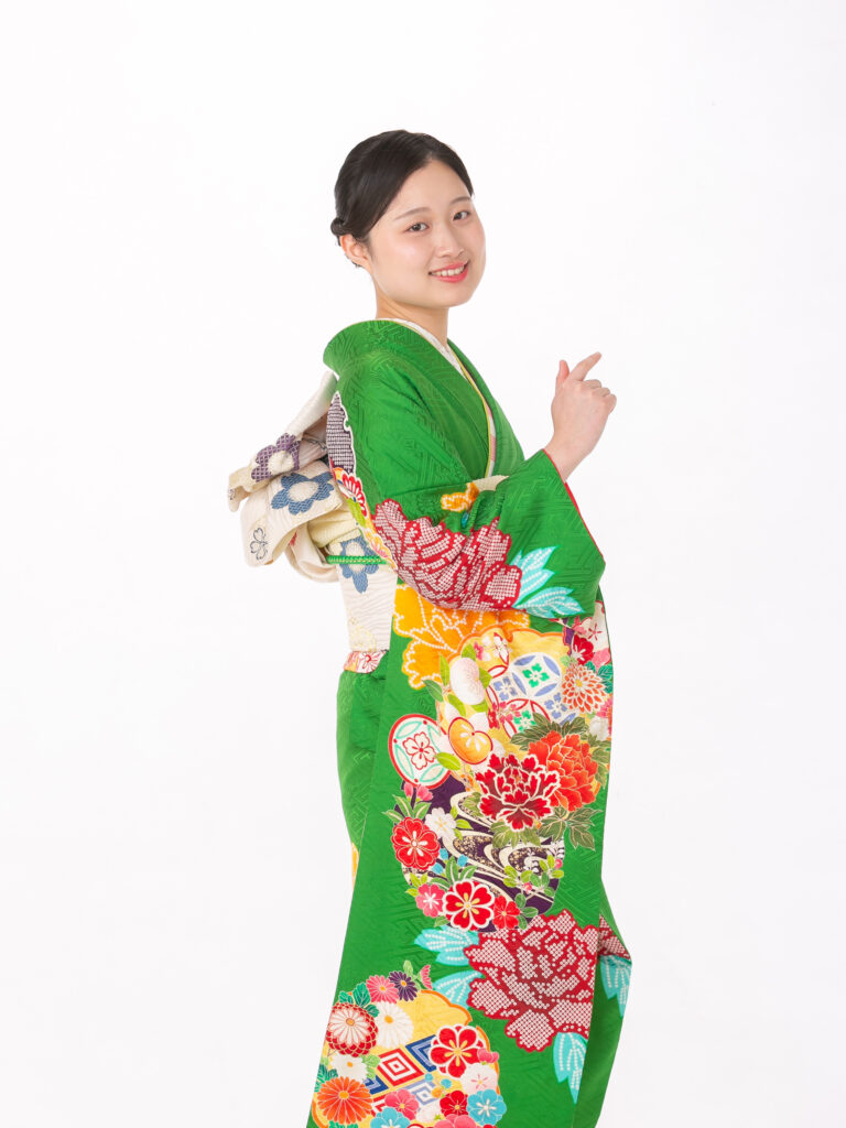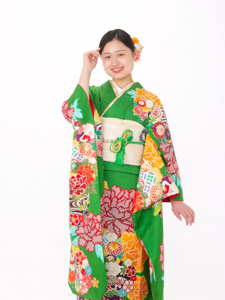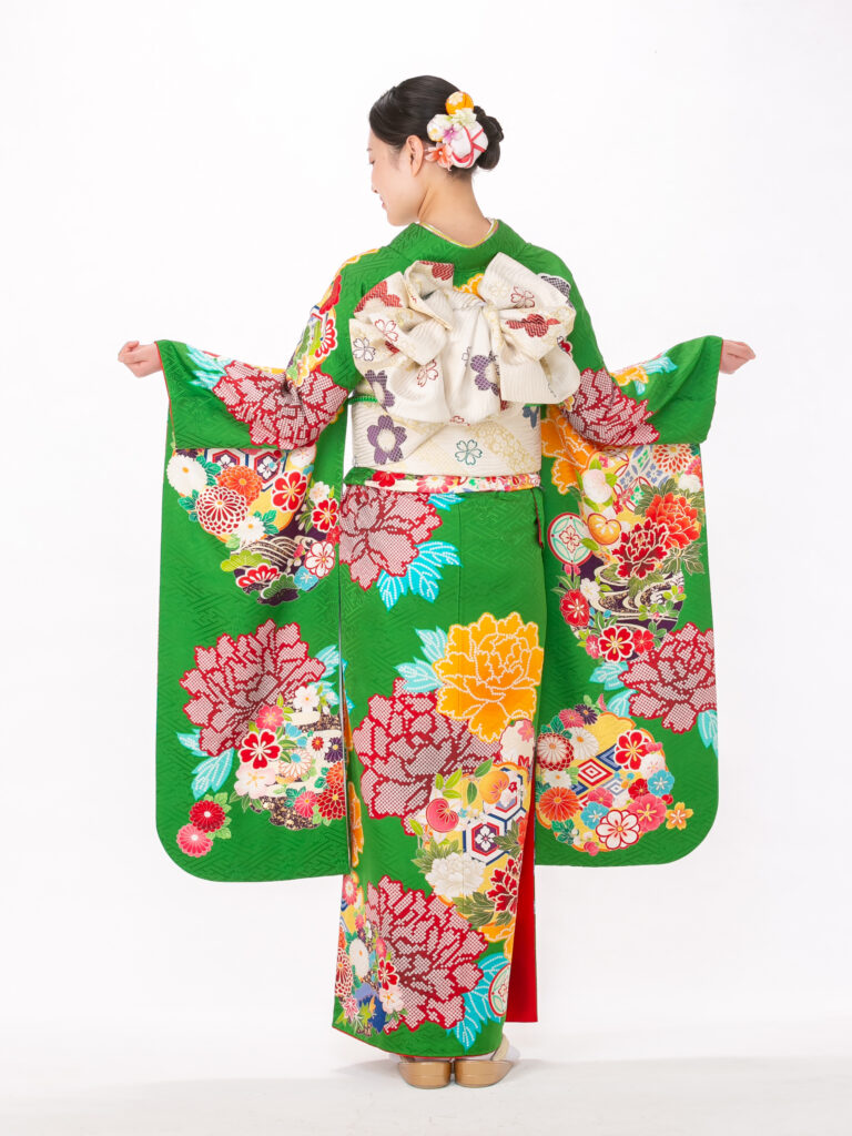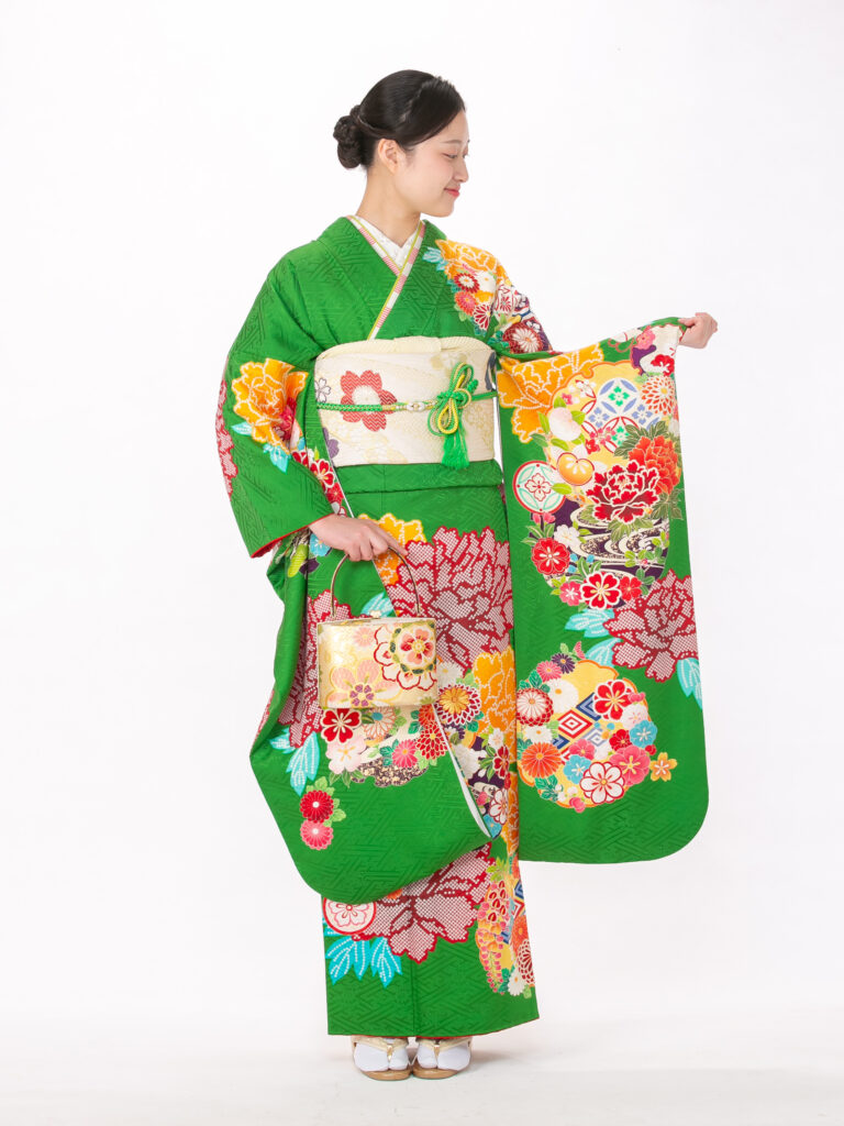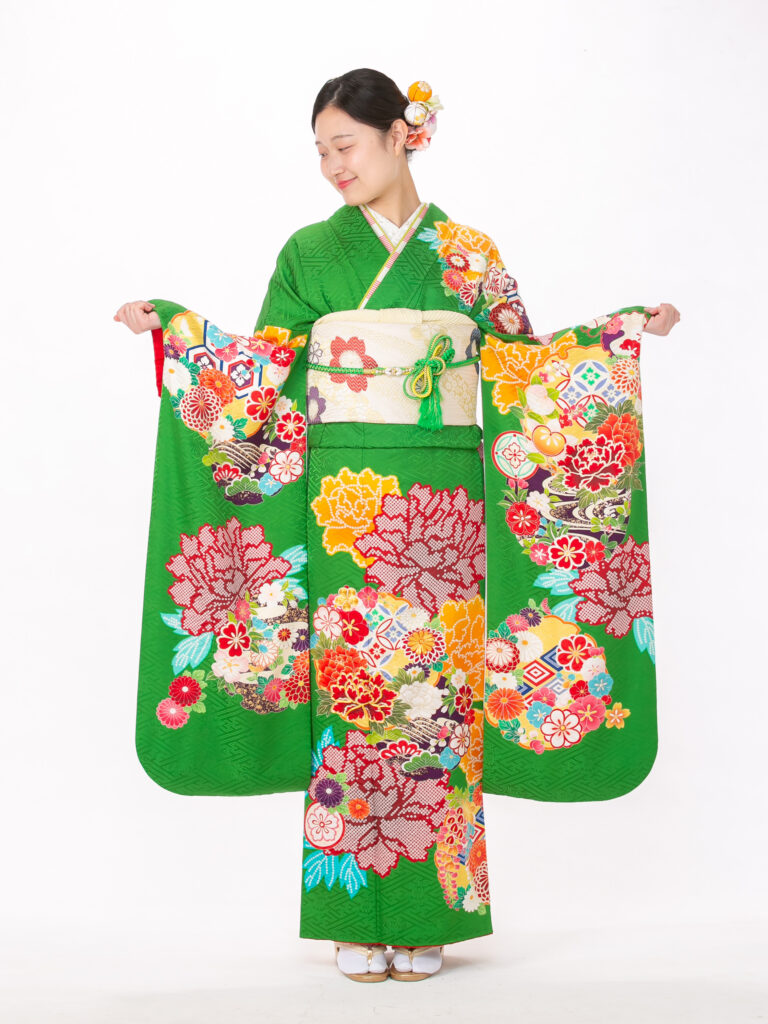 鮮やかな緑色と、豪華絢爛な古典柄が 織りなすレトロモダンな雰囲気の振袖。 伝統的な吉祥文様が全体に描かれており、 人生の門出にふさわしい格調高さを演出。