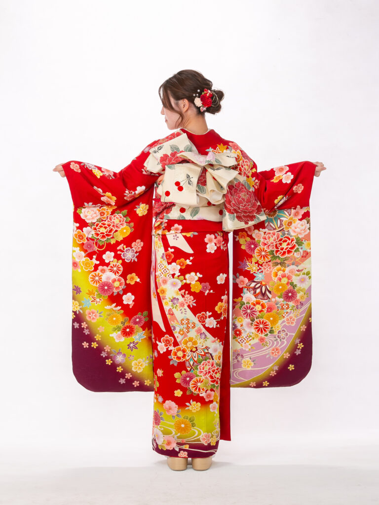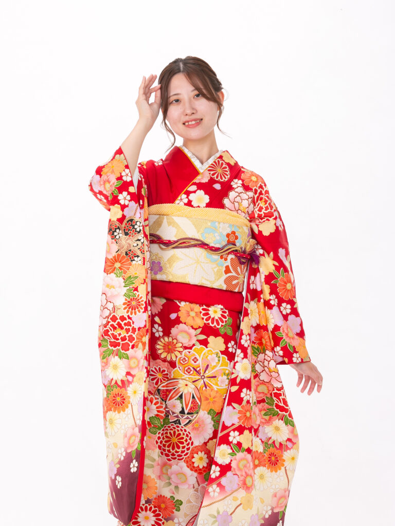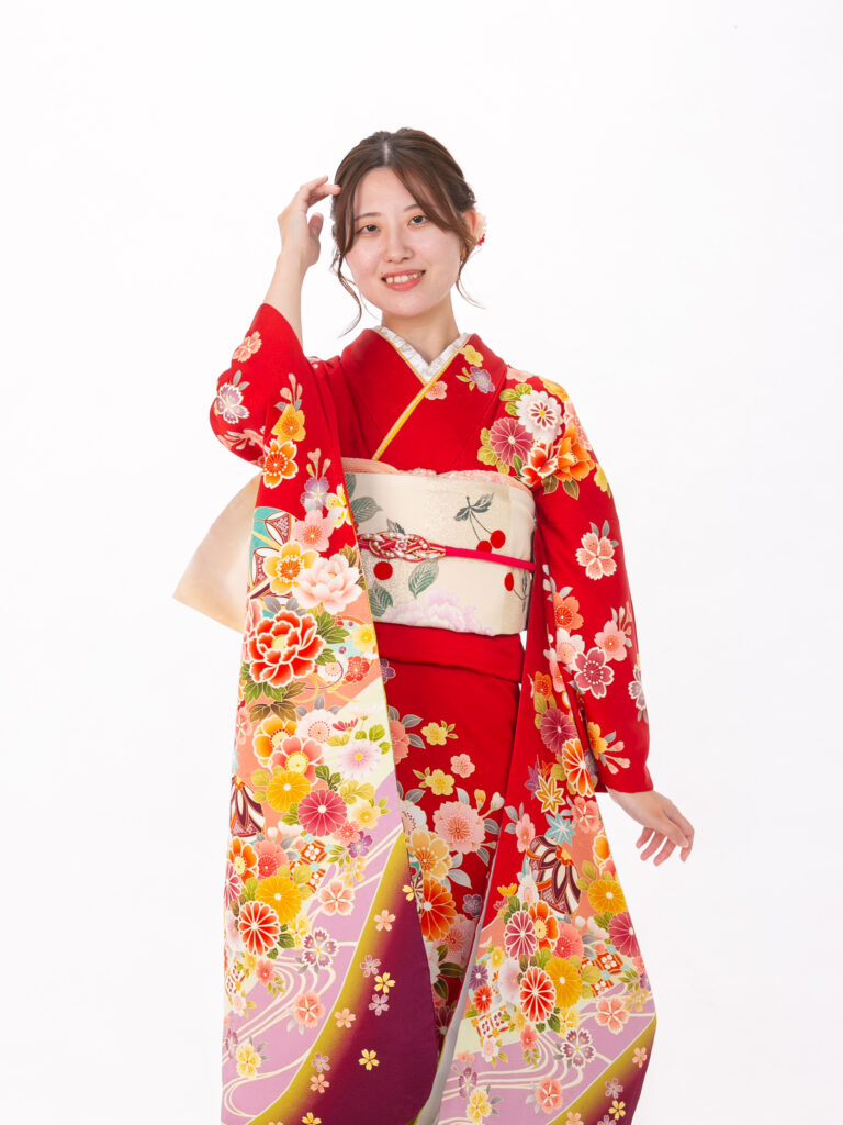 現代的な洋花を大胆に取り入れ 明るく華やかで幸福感あふれる振袖。 朱色を中心にカラフルな色彩で 描かれた花々が華やかさを演出します。