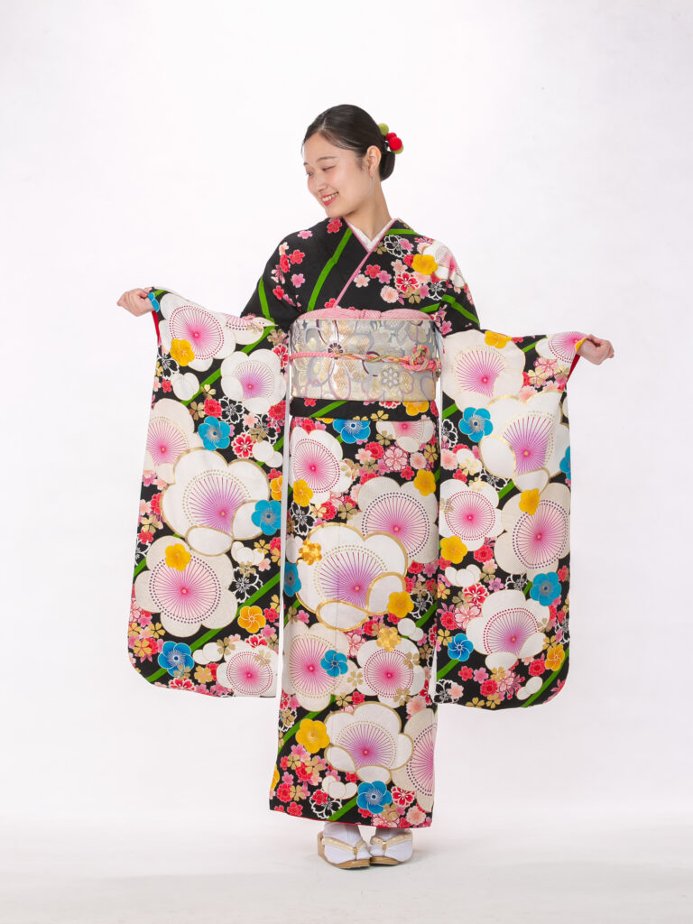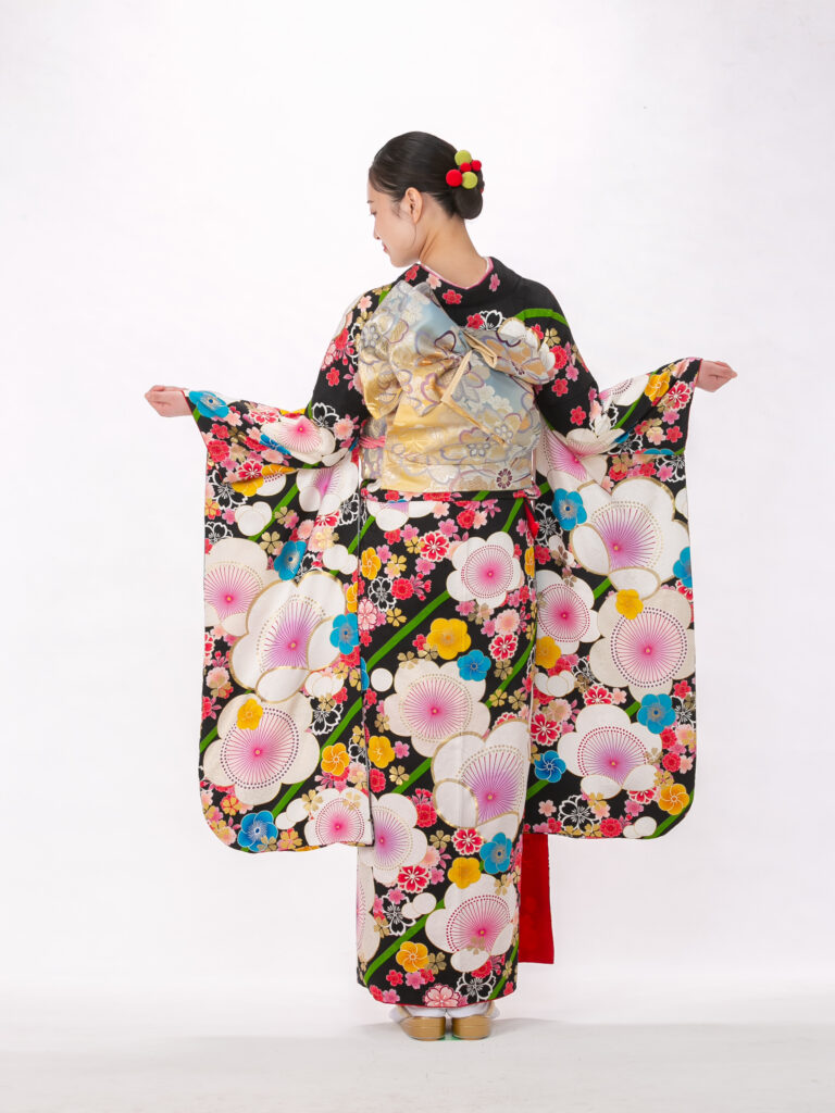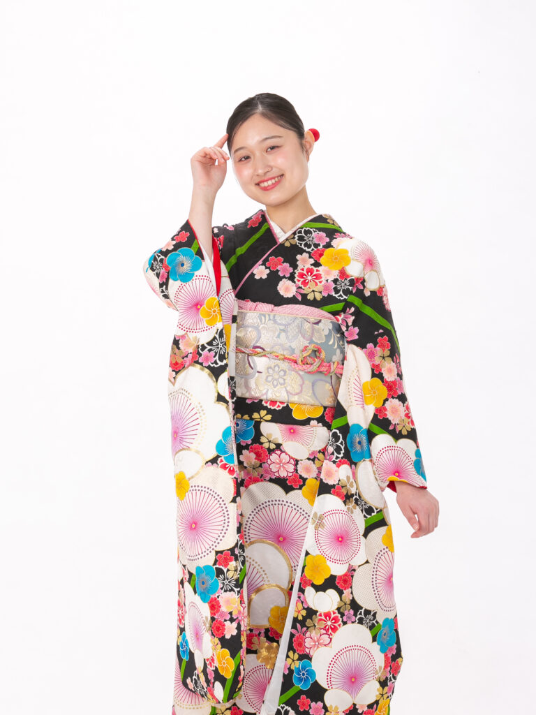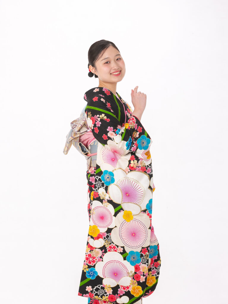 地色に黒を中心に大輪の花柄をあしらった レトロモダンなデザインの振袖。 個性的な花柄や鮮やかな色使いが特徴的で 「レトロポップ」なスタイルです。