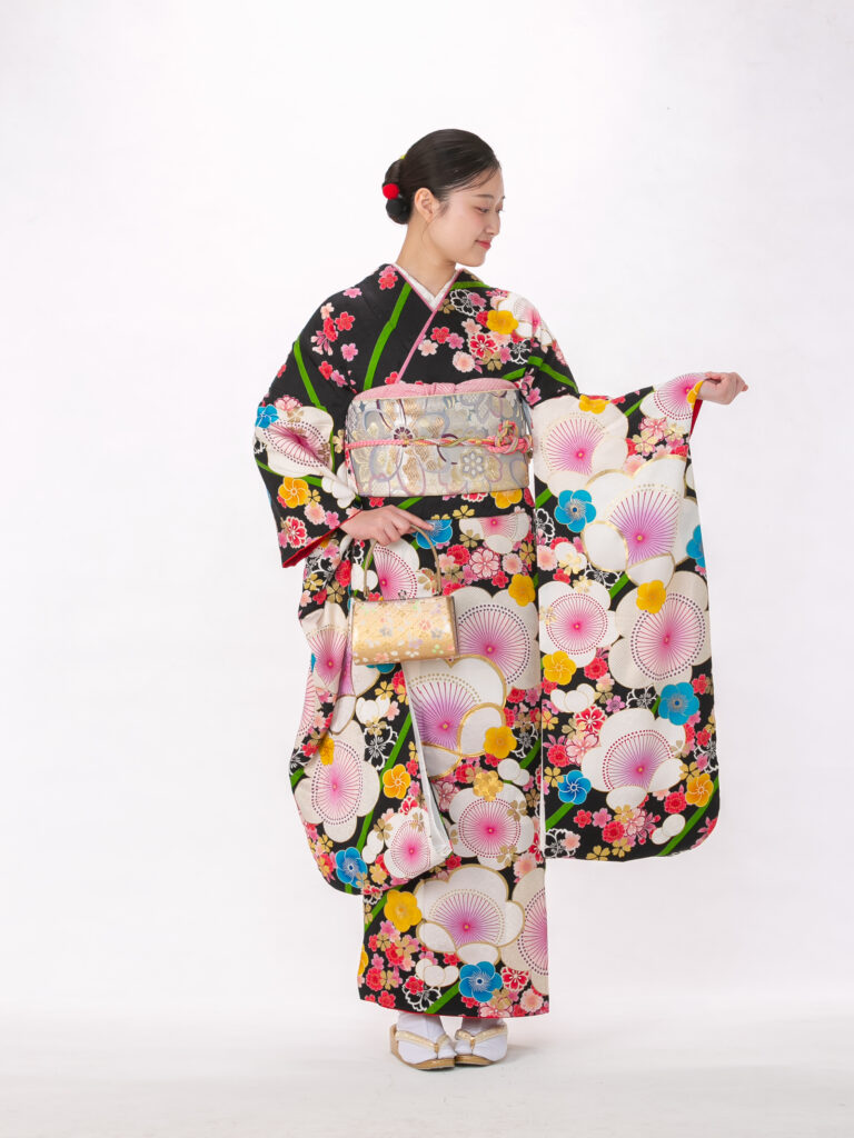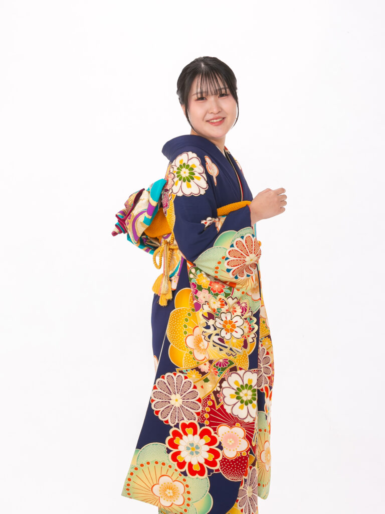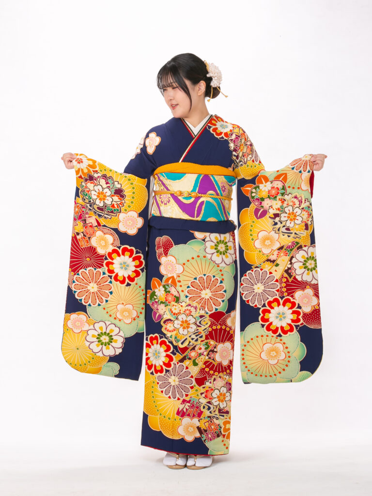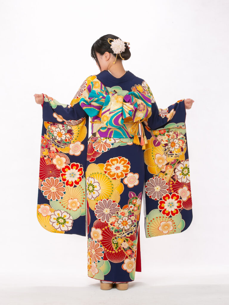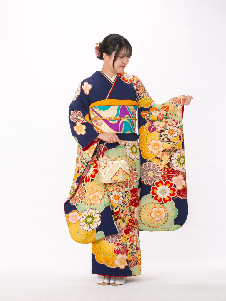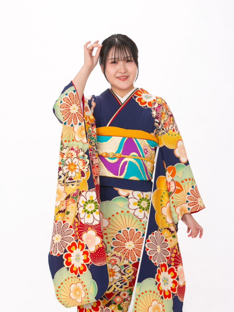 鮮やかで大胆な花柄と扇のモチーフを 組み合わせたレトロモダンな振袖。 知的で落ち着いた印象の紺色に、 ポップな色彩の柄が映える個性的な一着。