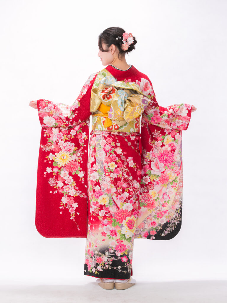 裾に向かって赤から深い紫へと変わる グラデーションが美しい振袖。 上半身の可憐な印象と裾の重厚な色の対比が 可愛らしさと大人の品格を表現しています。