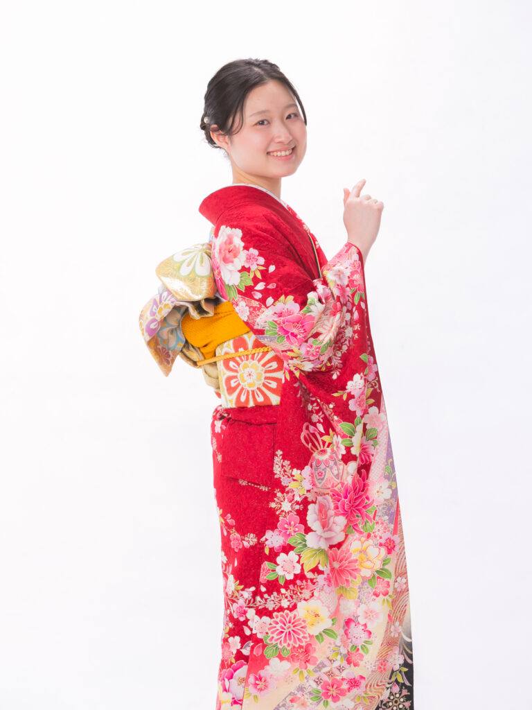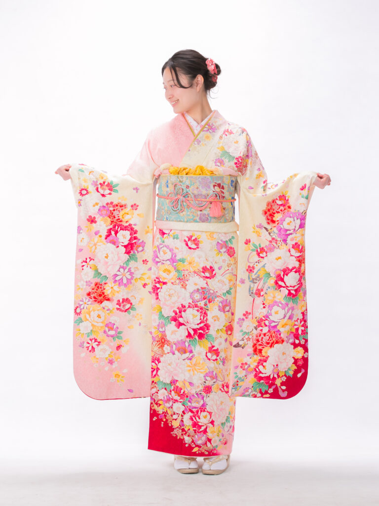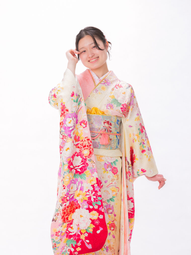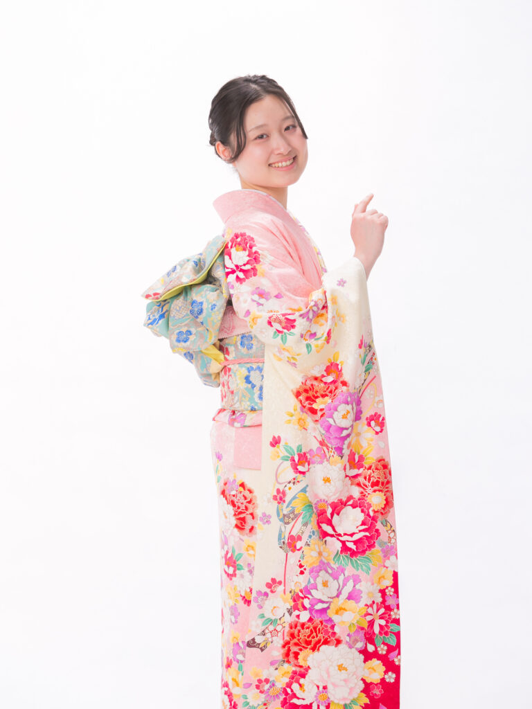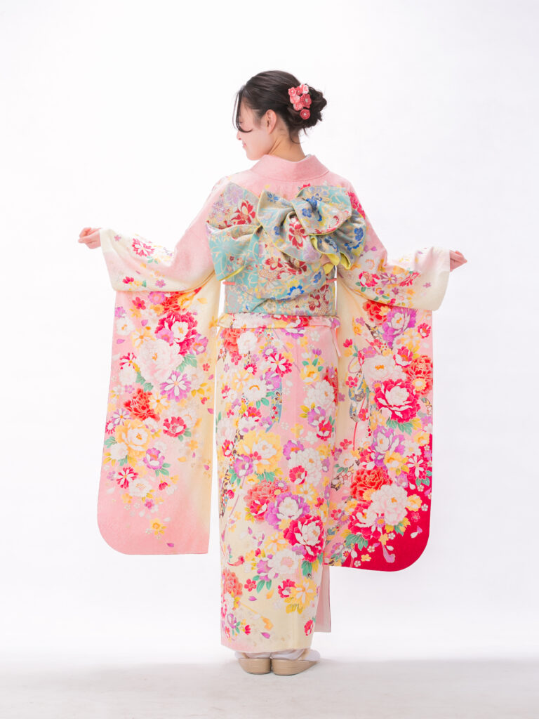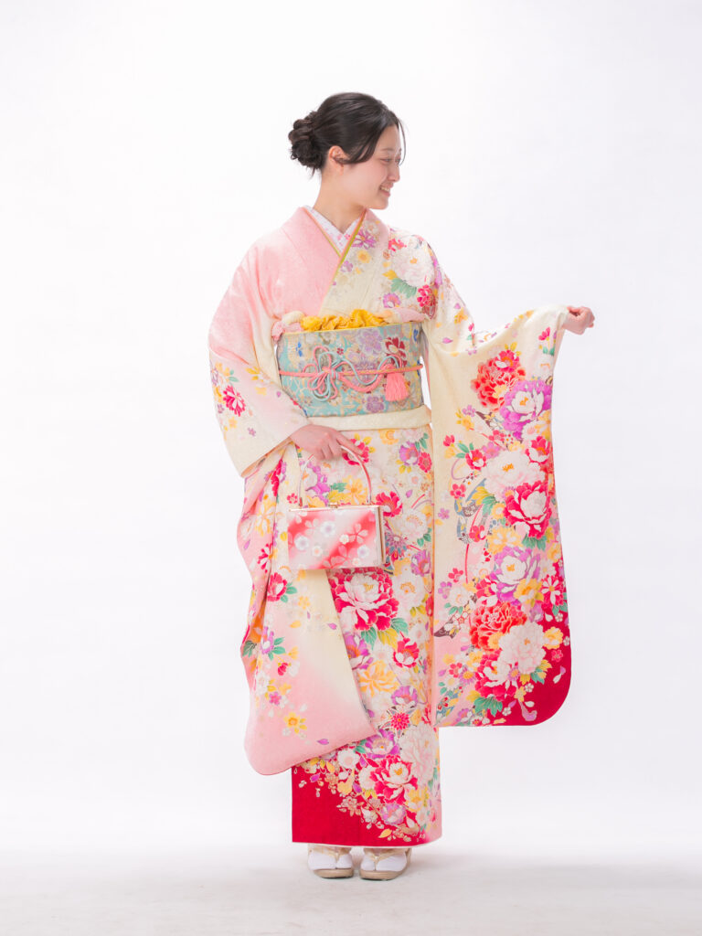 清潔感あふれる「白×ピンク」の組合せと 立体感のある花びらが華やかな振袖。 足元に鮮やかな赤があることで、 全体の甘さを引き締め 大人可愛いを叶えます。
