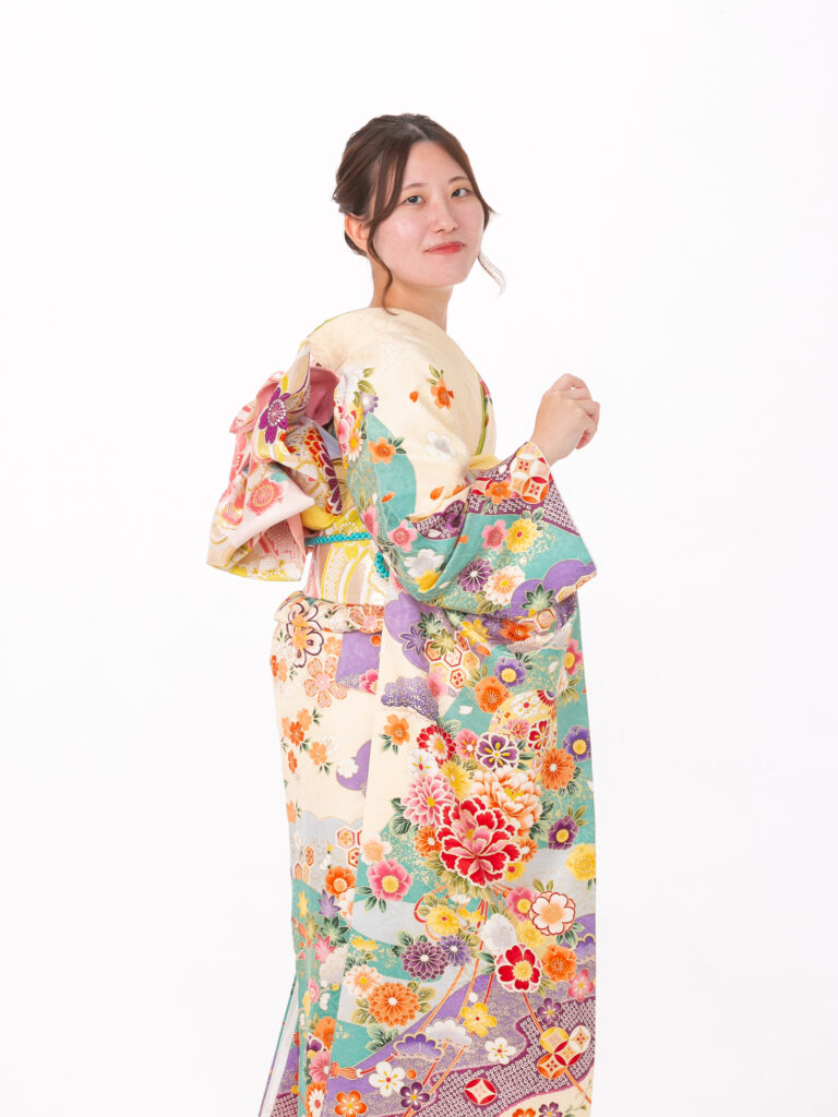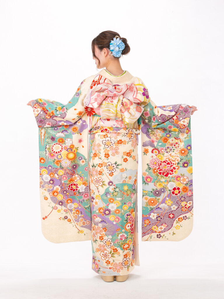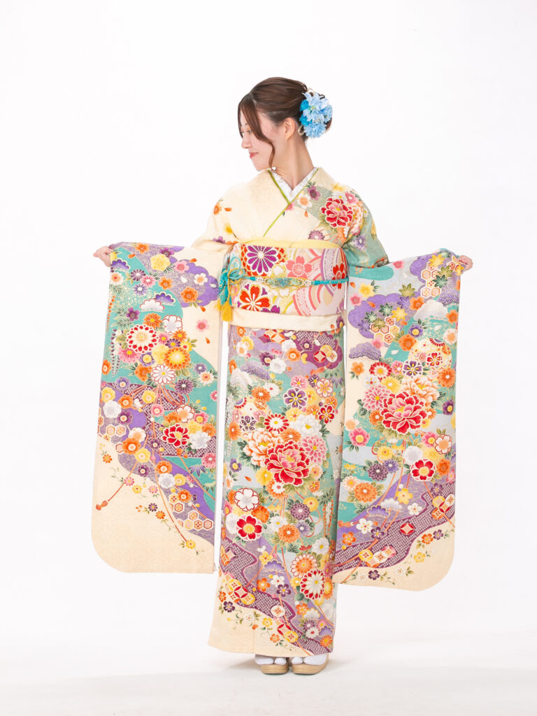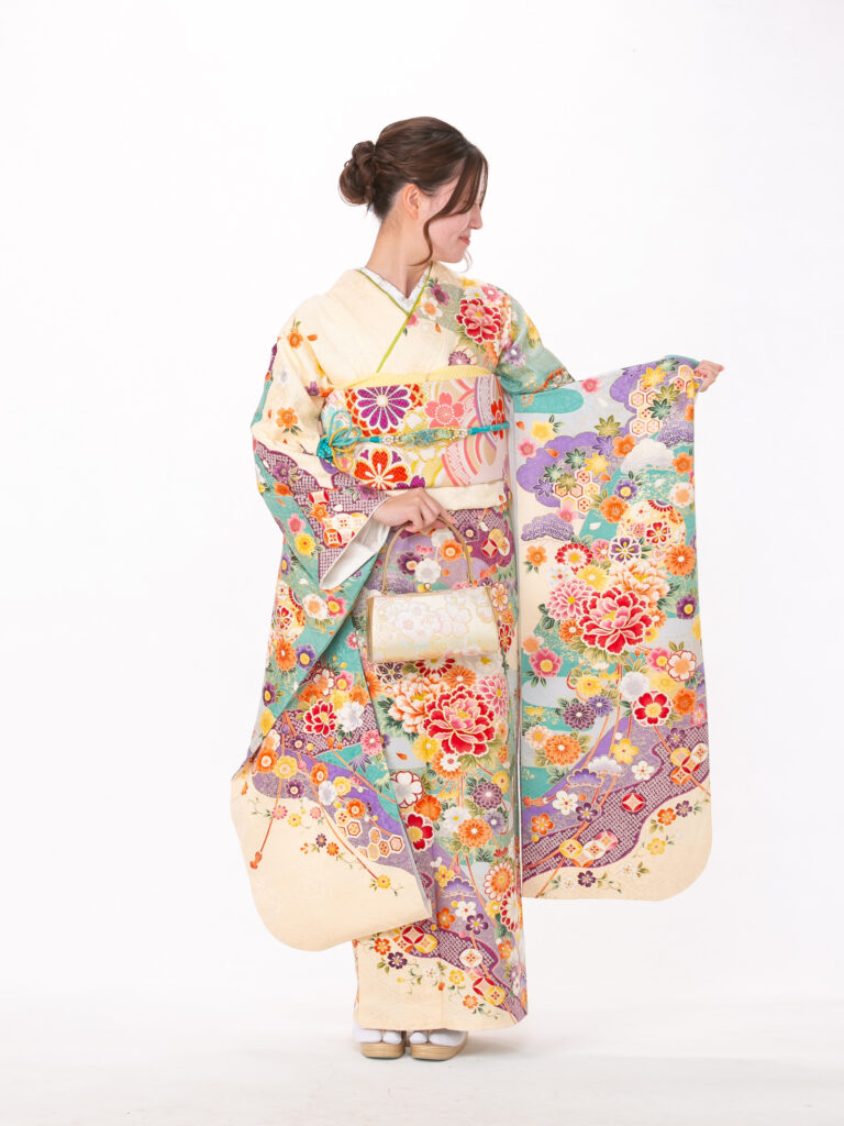 上品な地色と華やかな多色使いの融合で 写真映えする豪華な古典柄が魅力の振袖。 様々な色がクリーム色の地色と鮮やかな コントラストが華やかで品のある装いに。