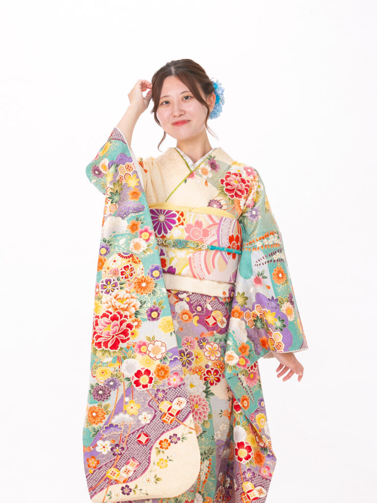 清涼感あふれる水色の地色に、 色とりどりの古典柄をあしらった振袖。 一枚の絵のように繋がる絵羽模様は、 振袖の格の高さを象徴します。