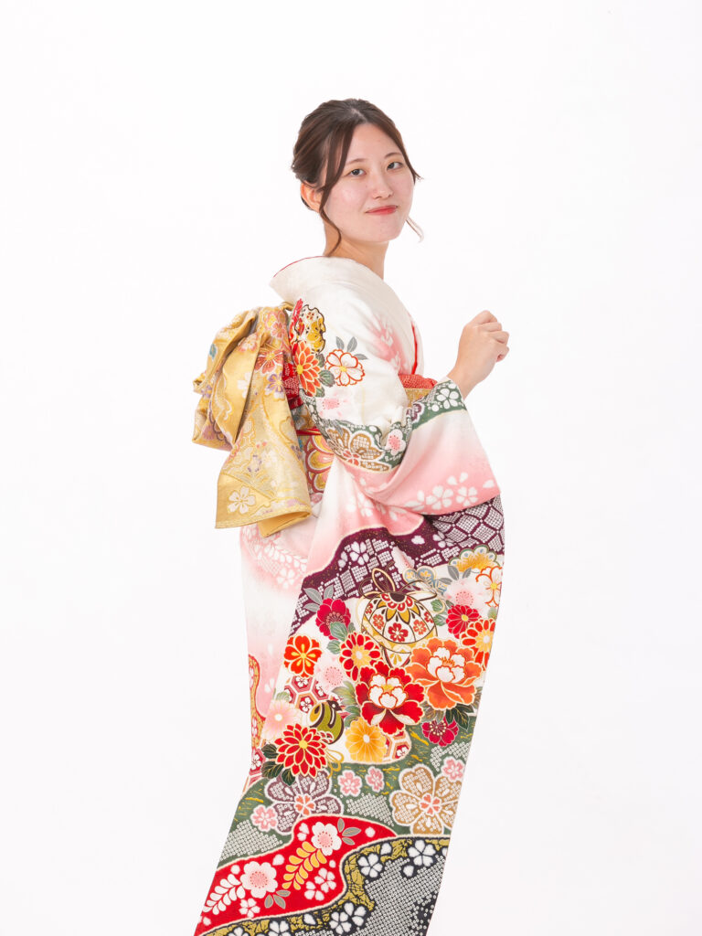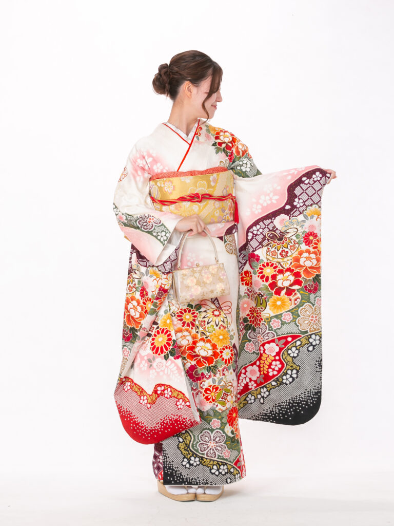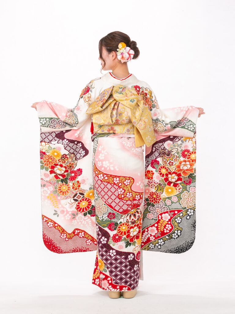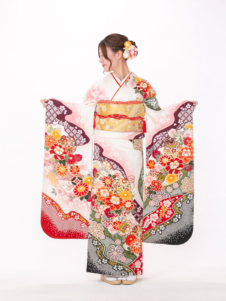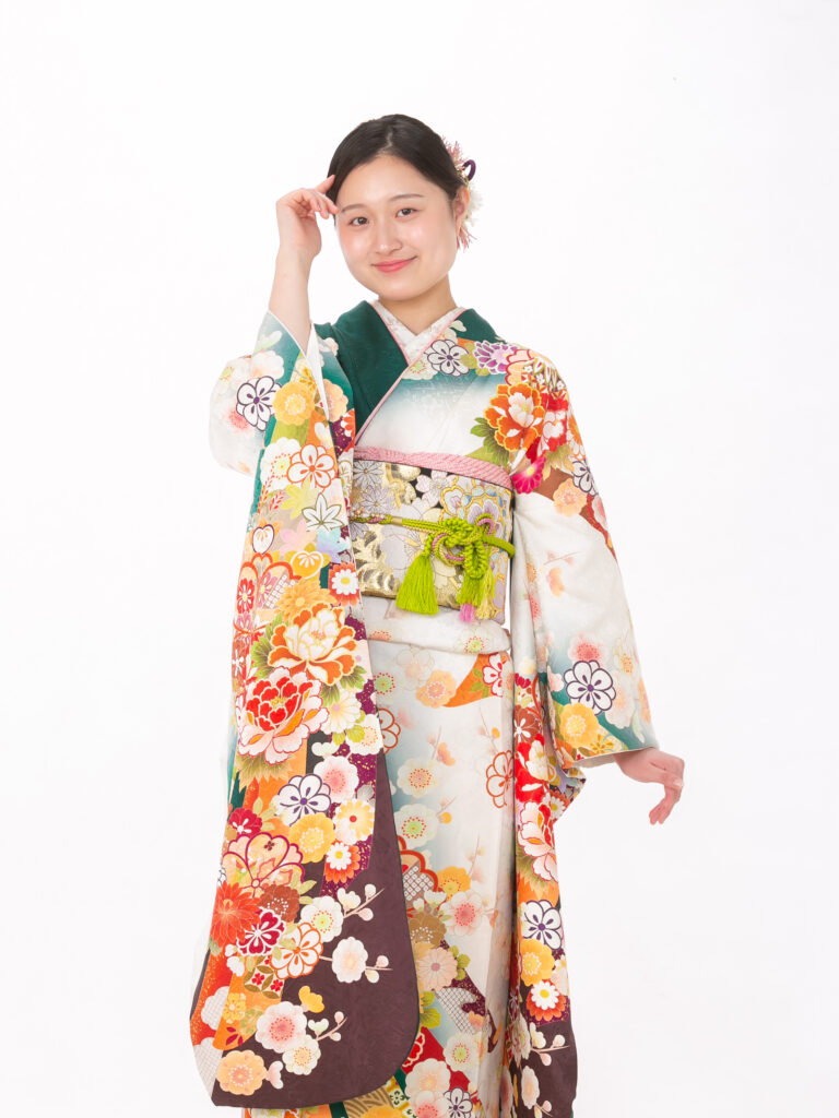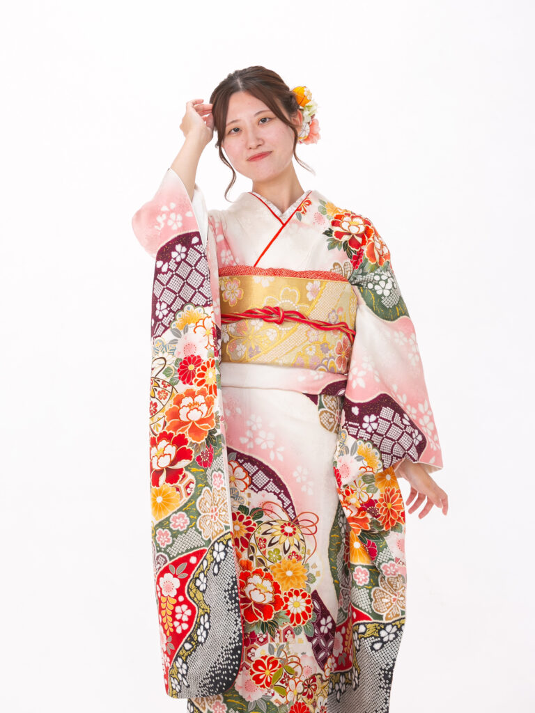 菊、桜、牡丹などの伝統的な「吉祥文様」が 豊富にあしらわれた格式高い振袖。 白地に映える赤や橙の鮮やかな組み合わせは、 二十歳の若々しい魅力を引き立たせます。