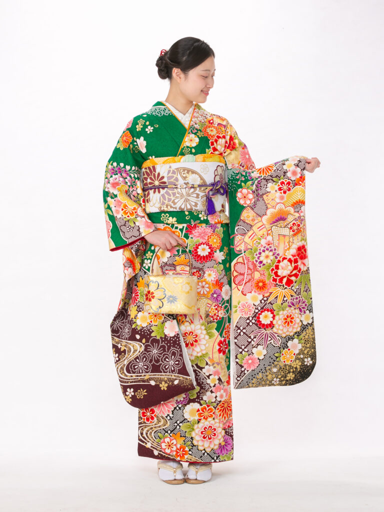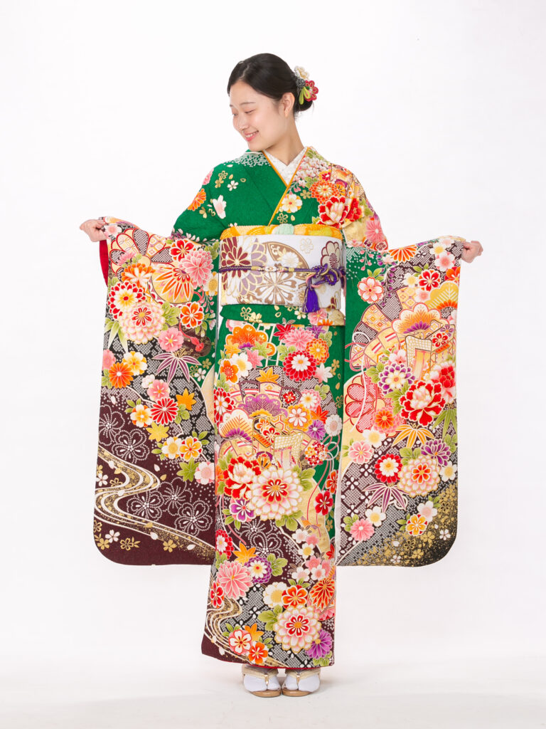 上品な緑の地色と、裾にかけて あしらわれた古典柄が特徴的な振袖。 伝統的な古典柄を現代的なセンスで 大胆に配置した上品で存在感のある一着。