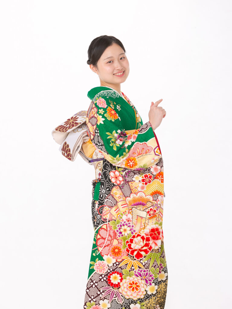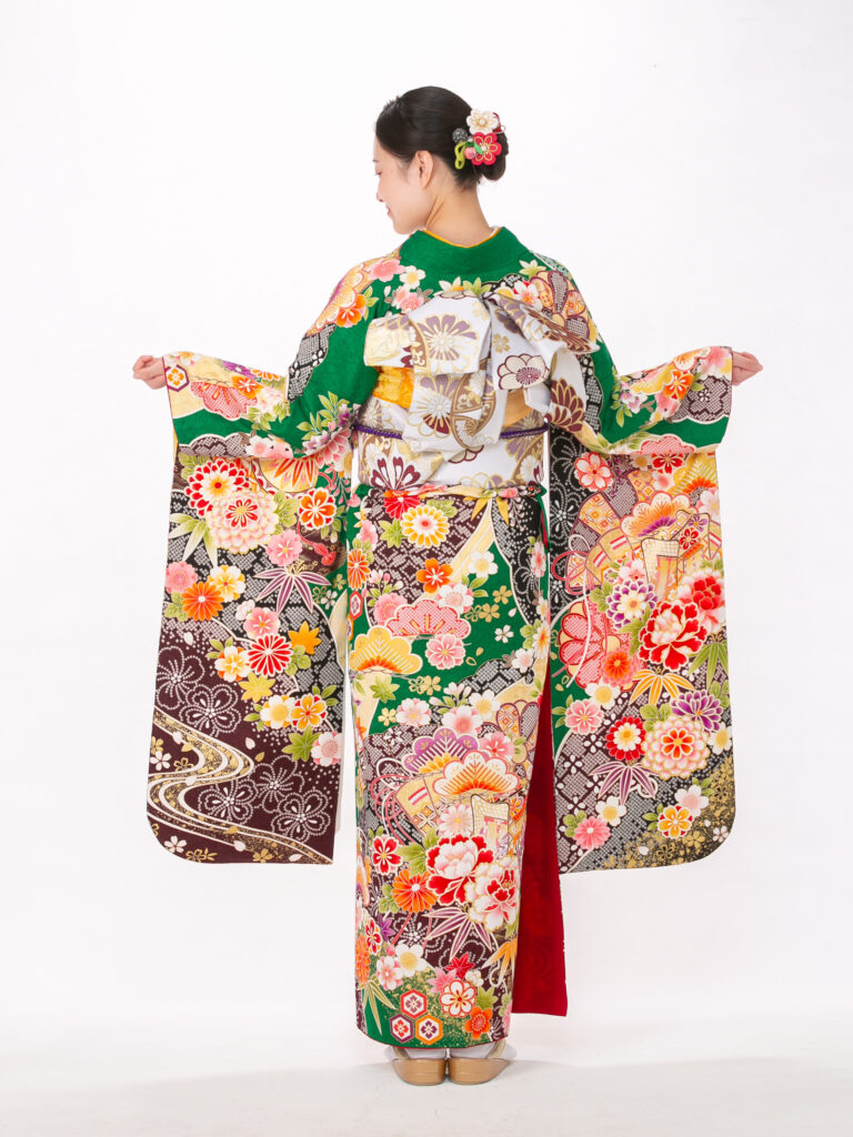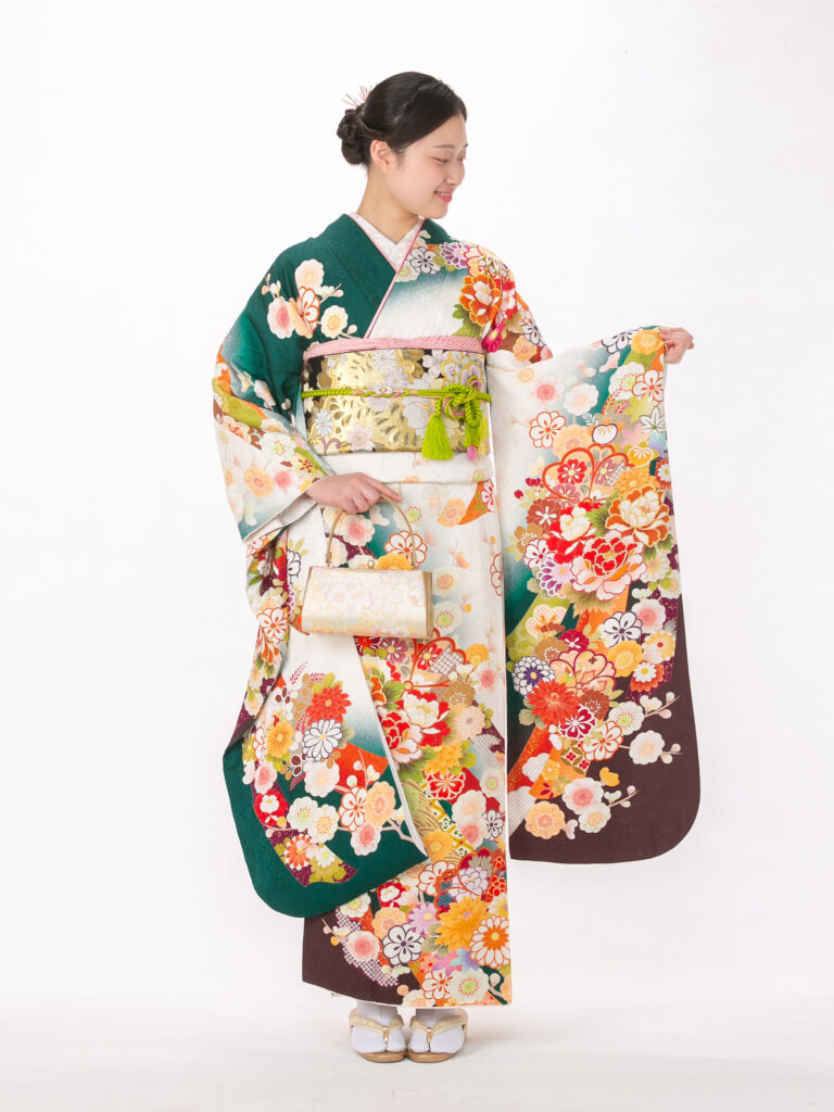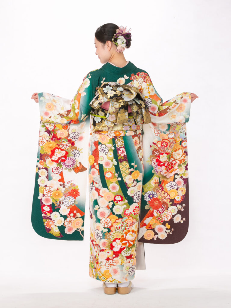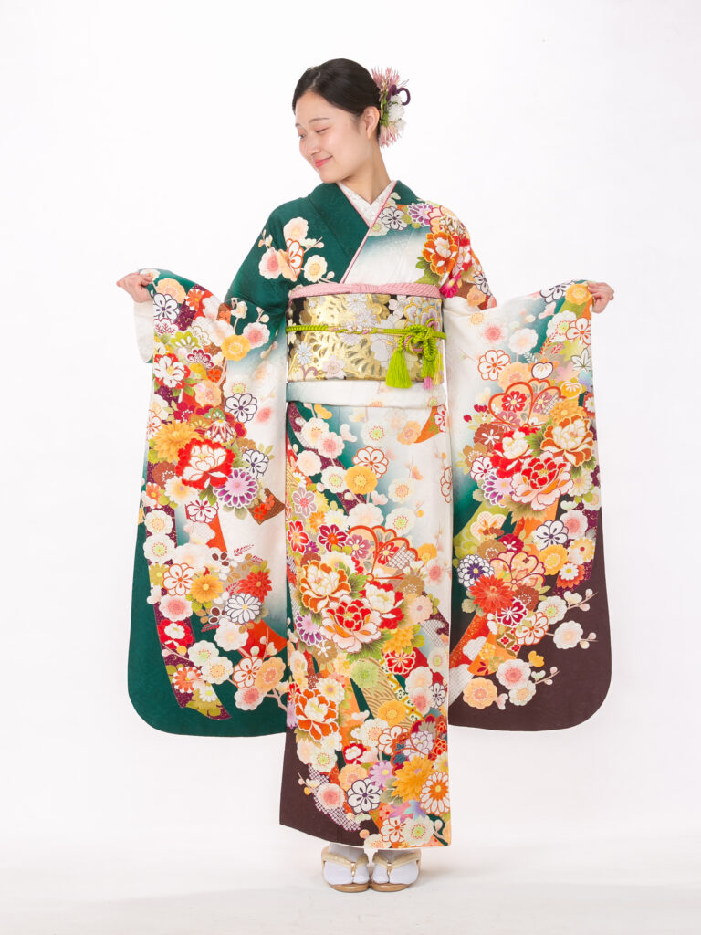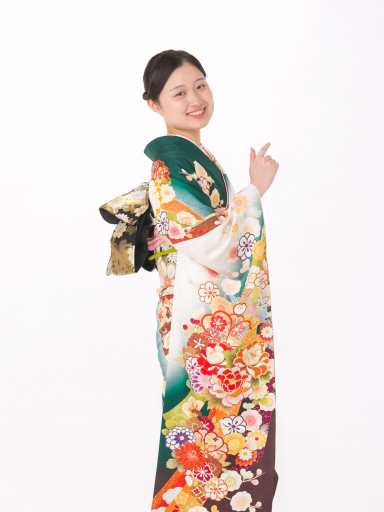 落ち着きのある深緑と、豪華絢爛な 花々が織りなす古典美を感じる振袖。 桜や梅、牡丹など花々の美しさが際立つ 存在感のある着姿が叶います。