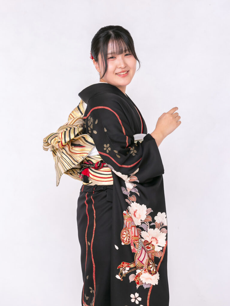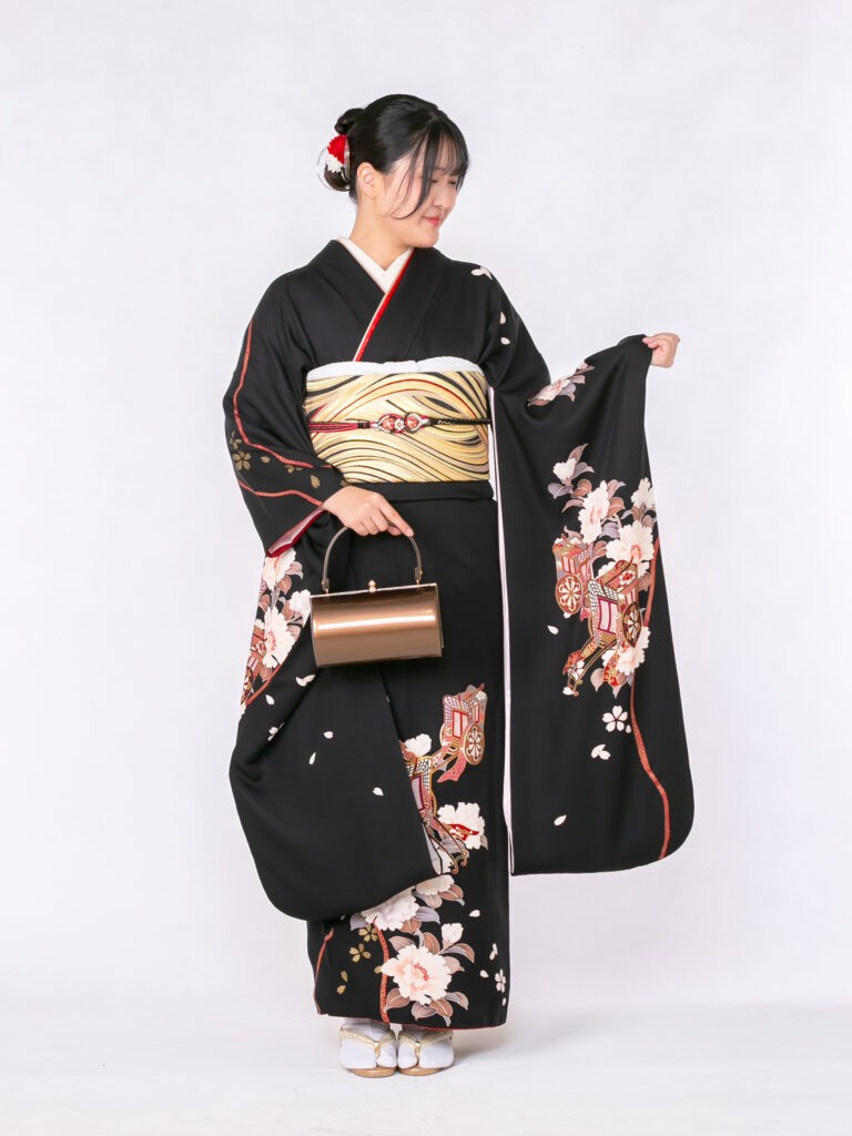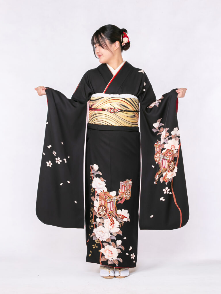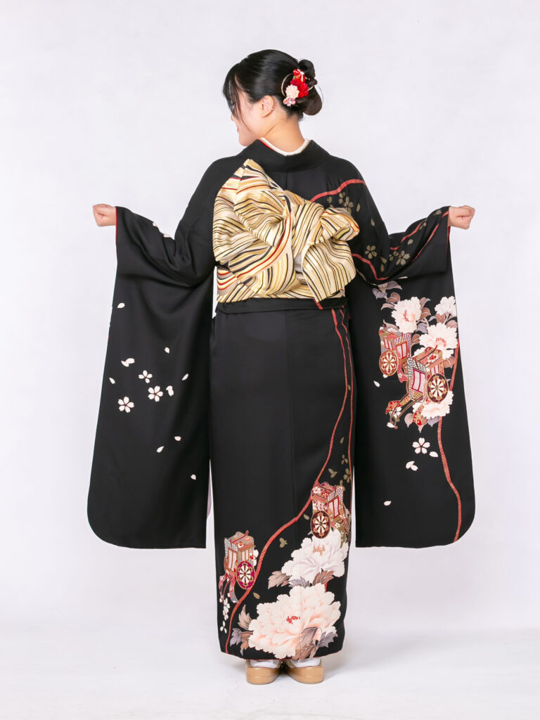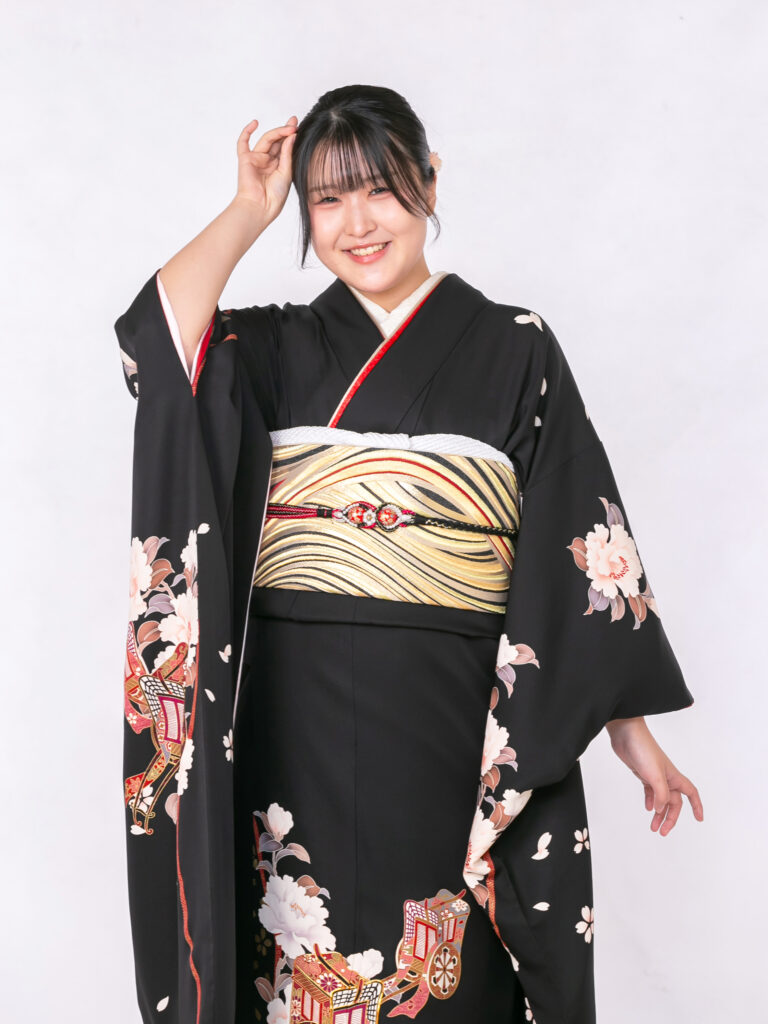 黒字に花車が描かれた 伝統的な振袖。 牡丹の大きく華やかな花びらが 格調高さを演出します。